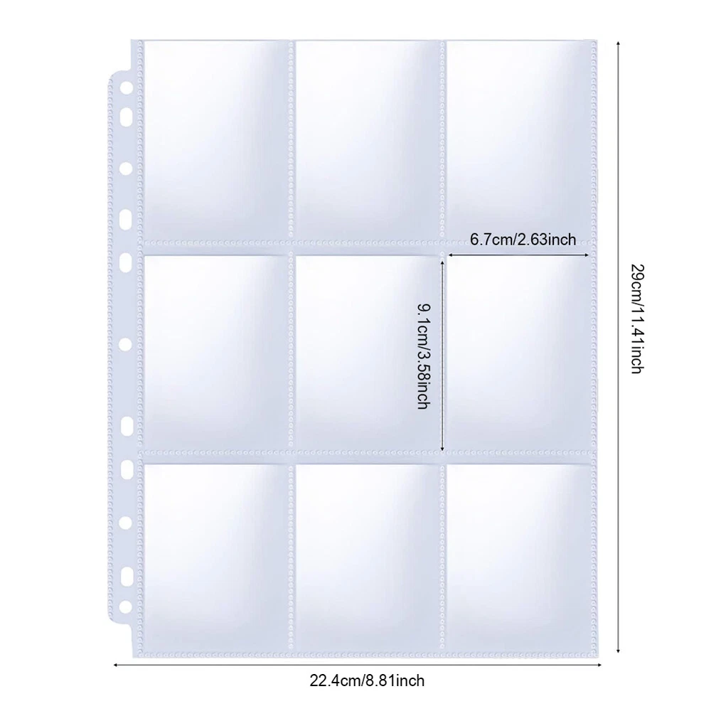 Product Description Features: Single-SIDED DISPLAY: Each page protector has 9 pockets, you can put two cards in one sleeve, suitable for card stock for 2/3/4 binder, organize and properly protect your card.Each pack contains 10 sleeves/pages, providing enough capacity to hold at least 90 cards in total. THICKENED 9 POCKET CARD SLEEVE: Our trading card sleeve pages is made of transparent high-quality plastic, acid-free, non-toxic, PVC-free, high transparency, can be used for a long time without bending. Thickness 0.1MM.Our inner pages are not thin double-sided loading, but thick single-sided loading. FITS STANDARD SIZES: Page Size: 8.8" x 11.4"/ 290x224mm. Pocket Size: 2.63 x 3.58 inches / 67x91mm.Great for standard size cards, Pokemon cards, coupons, game cards, business cards/trading cards/baseball/soccer cards. TOP LOADING DESIGN : Convenient and Fast - Very easy to reach,Cards will not fall as long as you keep the card protector flat or upright, perfect for card storage and display. Specification : Material : Plastic Outer size: 8.8" x 11.4"/ 290x224mm Pocket Size: 2.63 x 3.58 inches / 67x91mm Package included: 1 set/ 10 pcs x Trading Card Pages Sleeves