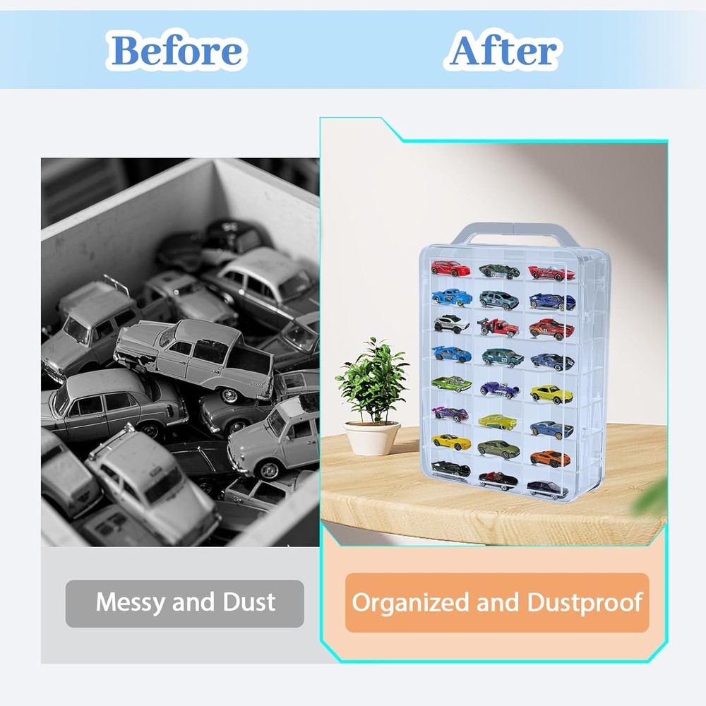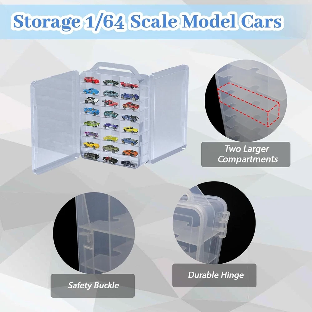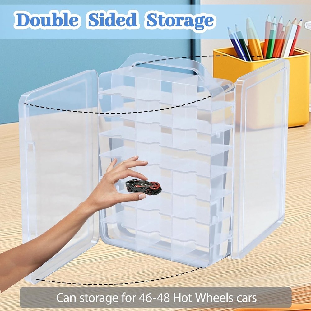 Hug and care Double Sided Storage Case for Hot Wheels Storage with Carrying Handle, Portable FEATURES Plastic Storage Case for Hot Wheels Storage: This carry storage case designed with a carrying handle, making it easy to storage and carry for 1/64 scale toy cars. It keeps your collection stays organized and portable wherever you go Generous Storage Capacity: This portable storage case has 46 slots, each measuring 3.15”(L)x1.45”(W)x1.5”(H). Two long compartments(6.3”L) fit longer vehicles like trucks, or two small car, holding up to 46-48 cars in total Double-Sided and Easy Access: The clear carrying storage case double-sided design allows you to have more storage for 1/64 scale Hot Wheels Matchbox cars, and they can be easily accessed from both sides when needed Durable and Transparent Plastic: Made from high-quality plastic, this toy cars storage case is both strong and durable. The transparent design allows you to quickly view and access your cars, making it easy to find you need toy cars Versatile Storage Solution: Ideal for Hot Wheels, Matchbox cars, and more, this storage box can also store small toys, figures, and craft supplies. Perfect for organizing collectibles and keeping items neatly stored and easily accessible Product Description Storage Case for Hot Wheels Storage with Carrying Handle The carry storage case is designed with a convenient carrying handle, making it easy to storage and carry your Hot Wheels and Matchbox. Perfect for 1/64 scale toy cars, this storage box with carrying handle keeps that your collection stays organized while allowing you to transport it with ease. Whether you're at home or on the go, this portable design keeps you can take your collection anywhere Durable and Transparent Plastic Material Made from high-quality plastic material, this toy cars storage case is both sturdy and durable, offering long-lasting protection for your prized cars. The transparent design allows for easy viewing of your toy cars collection, so you can quickly find and access your favorite toy cars without the hassle Safety Buckle The safety buckle keeps your collection secure, preventing accidental openings and ensuring safe transport Larger Compartments Two long compartments(6.3”Lx1.45”Wx1.5”H) fit longer vehicles like trucks, or two small car Durable Hinge Featuring a sturdy hinge, this case offers smooth opening and closing while withstanding frequent use Generous Storage Capacity The external dimensions of the storage case are 13” (Height) x 9.8” (Length) x 3.2” (Width), providing ample space for your collection. Featuring 46 slots, each compartment measures 3.15” (Length) x 1.45” (Width) x 1.5” (Height), perfectly sized storage for Hot Wheels, Matchbox cars, and other 1/64 scale vehicles. Two larger compartments(6.3”Lx1.45”Wx1.5”H) on each side are ideal for longer vehicles such as trucks and trailers, making it possible to store up to 46-48 cars in total Ideal Gift for Hot Wheels Storage These carry toy car organizers case make an excellent gift for Hot Wheels collectors, allowing them to easily carry and showcase their favorite toy car collections to friends and fellow enthusiasts anytime, anywhere Item model number HWCC-48 Unit Count 1.0 Count Product Dimensions 9.8"L x 3.2"W x 14.5"H Number of Items 1 Assembly required No Item Package Quantity 1 Color Clear Water Resistance Level Water Resistant Material Plastic Country of Origin China Item Weight 2 pounds Batteries required No Shape Rectangular Opening Mechanism Snap Recommended Uses For Product For Toys Included Components Shade included Special Feature Portable Fabric Type Plastic Size 48-Cars 3.2 "h x 9.8 "h x 14.5 "h. Weight: 2.0 lb PAYMENT We accept all payments via Ebay using Credit Cards , PAYPAL , Apple Pay and many others SHIPPING We are always working hard to ensure your package arrives as soon as possible. Please understand that some factors like weather, high postal traffic, and the performance of shipping companies are outside of our control. DELIVERY & RETURN POLICY We offer a 30-Day Return Policy on items in which you are not completely satisfied with. You have the option of a full-refund or an exchange of the item. No returns are available on items shipped outside of the USA.