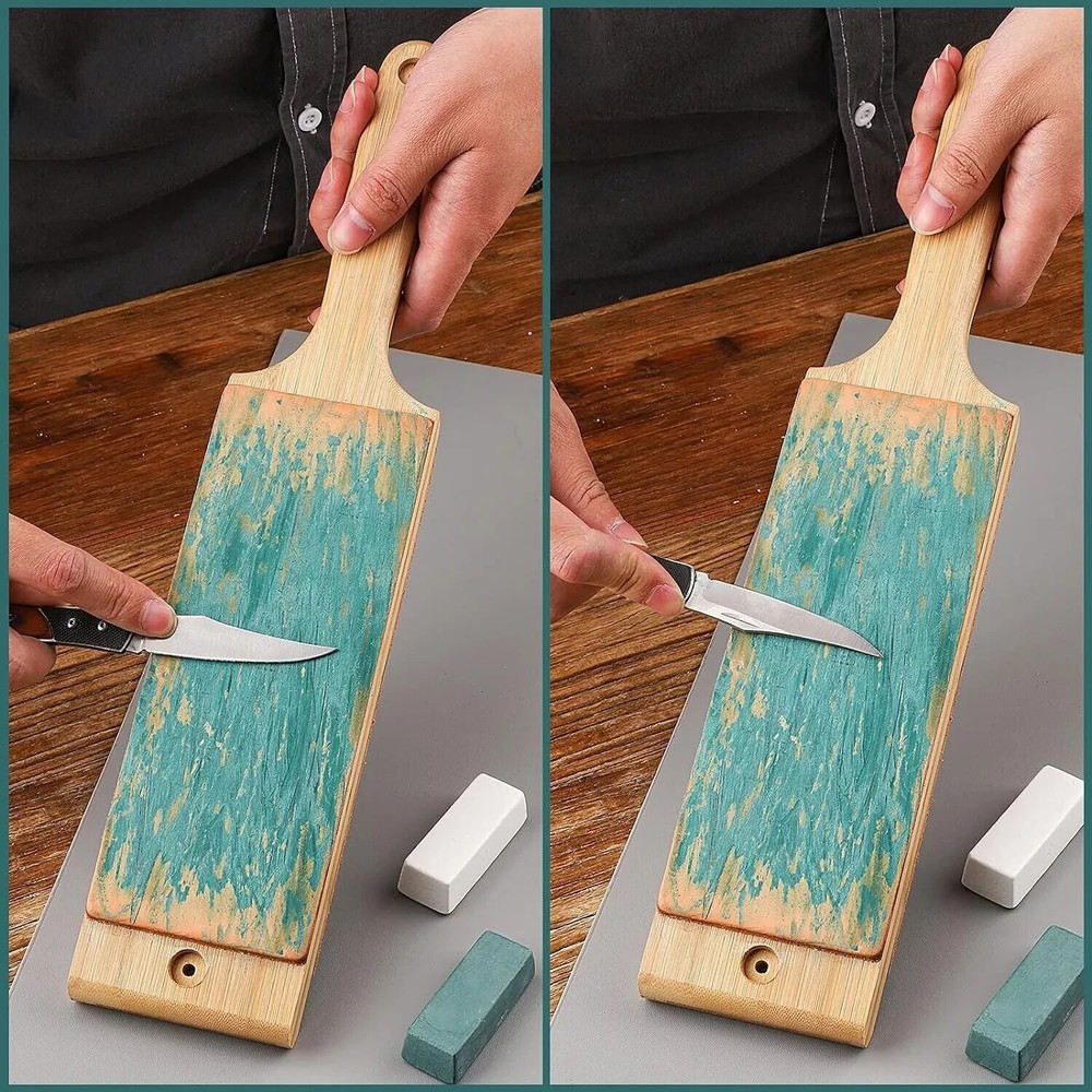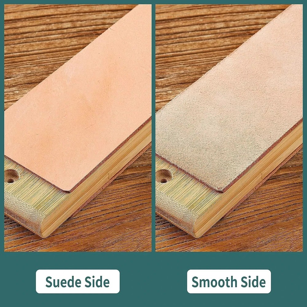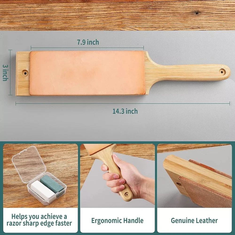 100% Money Back Guarantee if you are not satisfied with your purchase! ___________________ Description: Oversize Double Sided Leather Strop Kit(14.3" x 3" Knife Stropping Leather)with Ergonomic Handle - Knife Strop for Sharpening Knives, Wood Carving Chisels, Buffing Compound Included CLASSIC HONING STROP KIT: Your professional leather sharpening strop set includes, Strop Paddle,one green stropping compound, one white stropping compound, and detailed instruction manual with lots of Tricks which will appeal at every skill level. DUAL SIDED KNIFE LEATHER STROP: One side of the separate slip strop is rough, the other side is smooth, you will get mirror-like edge after stropping your knife or tool with our stropping block, ergonomic handle allows you to use a two-sided strop in a more comfortable way than other strops. NATURAL COWHIDE: After a strict vegetable tanning process, it is made into the most suitable Vegetable Tanned Leather for knife sharpening. Fix the two holes with screws,so the leather paddle strop can be well stabilized. POLISHING COMPOUND: The green compound is composed of Chromium Oxide, the white compound is composed of Aluminum Oxide, and you will be very easy to attach to the leather or polishing wheel. MULTIPURPOSE USE: Our leather strops for sharpening knives can be used not only as a wood carving strop but also as a razor strop for different types of knives as hunting knives, pocket knives, fillet knives, kitchen knives, Chef’s knife, woodworking chisel, straight razors, axe & moretactical knives and others. This is a PERFECT GIFT for your family and friends. ________________________ 100% Money Back Guarantee: We offer 30 Day Money Back Guarantee from the day you purchased if you’re not satisfied with your product. If you have any questions about our products, please contact us as soon as possible. Customer satisfaction is our absolute priority. Shipping: We are always working hard to ensure your package arrives as soon as possible. Please understand that some factors like weather, high postal traffic, and the performance of shipping companies are outside of our control. We offer free shipping to the lower 48 states and ship within 3 business days of payment, usually sooner. We do not accept P.O. Boxes. Please provide a physical address. You will be notified via eBay messages as soon as your items ship. Delivery: We will ship out the item in 2-3 working day after receiving the payment. Usually the delivery takes 2-5 business days. If you don't receive the items after 10 days, please feel free to contact us. You will get a replacement or a full refund. Please DO NOT open a return request or leave negative feedback without asking for help. Returns (Get Free Return Label): We offer a 30-Day Return Policy on defective/wrong items or items which you are not completely satisfied with. You have the option for a full-refund or an exchange of the item. No need to buy eBay return label. Contact us via eBay messages and get free return label. Returned items must be in all of the original packaging and include all of the original accessories or items that came with it. The item and package should be in original condition. Contact Us: Any queries or issues incurred, please feel free to contact us via eBay message, we will get back to you within 24 hours. Please DO NOT open a return request or leave negative feedback without asking for help. Feedback: Your feedback is very important to us. After you get your package and you are satisfied with our service, please leave us positive feedback. We are highly appreciated for your POSITIVE feedback and 5 stars. Enjoy shopping.