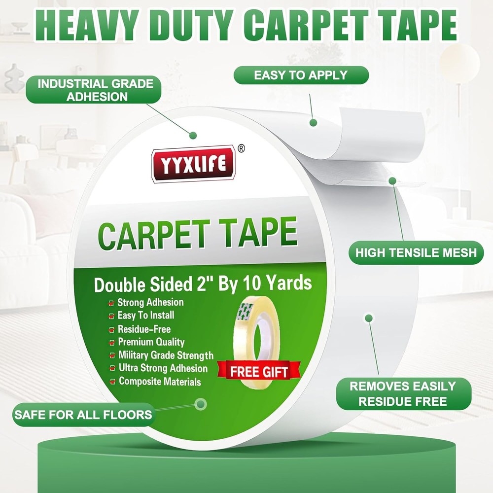 Double Sided Removable Rug Tape - Carpet Adhesive for Hardwood Floors,Non Slip Anti Curling Floor Tape for Area Rugs,Mats,Carpets - No Residue Strong Hold for Tile, 2Inch x 10Yards,White ULTIMATE HOLDING POWER: Experiencing the market-leading adhesion with our Heavy Duty Double Sided Rug Tape! Being designed to firmly secure rugs, carpets, and runners; Being the strongest anti-slip solution available. Easily cut to size for a perfect fit to keep your floors safe and clutter-free. RESIDUE-FREE & DAMAGE-FREE REMOVAL: Enjoying peace of mind with our unique adhesive. It bonds powerfully yet peels away cleanly when needed, leaving no marks or sticky residue behind. The convenient paper liner makes application and removal by effortless, so that you can change your decor or relocate rugs hassle-free! ENHANCED SAFETY FOR YOUR HOME: Reducing slips and trips with our reliable rug tape. It provides crucial stability on hardwood floors, tile, vinyl, and more. Perfect for high-traffic areas such as entries, stairs, and bedrooms, it can help create a safer environment for your family. VERSATILE SURFACE COMPATIBILITY:Where can you use it? Almost anywhere! This tape works effectively on tile, vinyl, concrete, wood, cement, as well as most other indoor/outdoor hard surfaces and carpet backings – all without causing damage. UNMATCHED PERFORMANCE & SATISFACTION SATISFACTION GUARANTEE:We firmly believe in the extreme holding power of our multi-purpose carpet tape. It is designed to stay put until you decide to remove it. Go beyond rugs: secure carpets, doormats, craft projects, etc! If you are not satisfied, please contact me for support. NOTE:Which carpet types are more suitable?Adhering best to fabric-backed carpets (cotton, felt, tufted, jute). Avoiding using on anti-slip carpets with rubber, PVC, or silicone backings. These materials have lower surface energy, compromising tape adhesion.