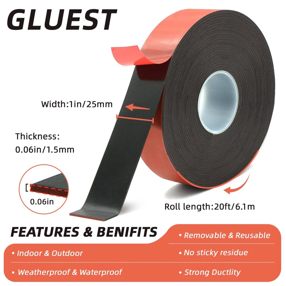 [Double Sided Tape Data]: This double sided tape for walls has a thickness of 1.5MM, width of 1in, length is 20ft and holds up to 70lbs(30mm*31mm sample) strong adhesion of our double sided tape. [Removable Mounting Tape]: The adhesive wall tape is easy to remove and will not damage surfaces. This heavy duty adhesive tape works on almost any smooth surface indoors or outdoors, such as wall, glass, plastic, metal, marble, ceramic, etc. [Reusable Adhesive tape]: Just rinse double sided heavy duty tape off in the sink and let it dry before applying it to a new surface. The adhesive mounting tape still has 70-80% of original adhesive strength. [Multipurpose Wall Tape for Hanging]: This double sided adhesive tape is both weatherproof and waterproof, making it suitable for indoor and outdoor use. You can use it as carpet tape, rug tape, picture hanging strips, wall decor [Easy to use]: This double sided adhesive tape can be easily cut to any size or length you need, stick the tape to the surface of the item, press 30 seconds after applying the double-sided heavy duty tape and wait 20 minutes to obtain 50% adhesion. After 24 hours ,the adhesion strength will grow up to 91%.