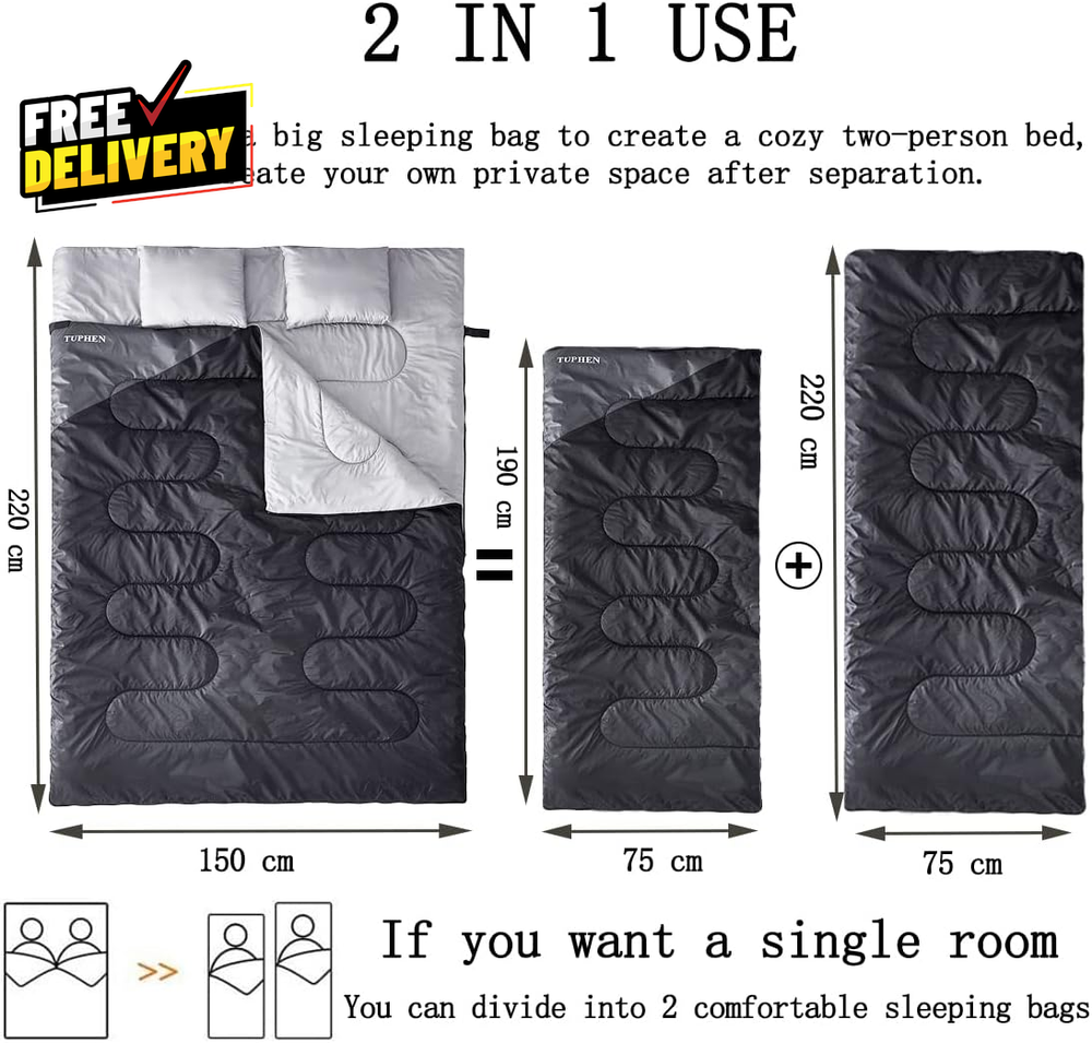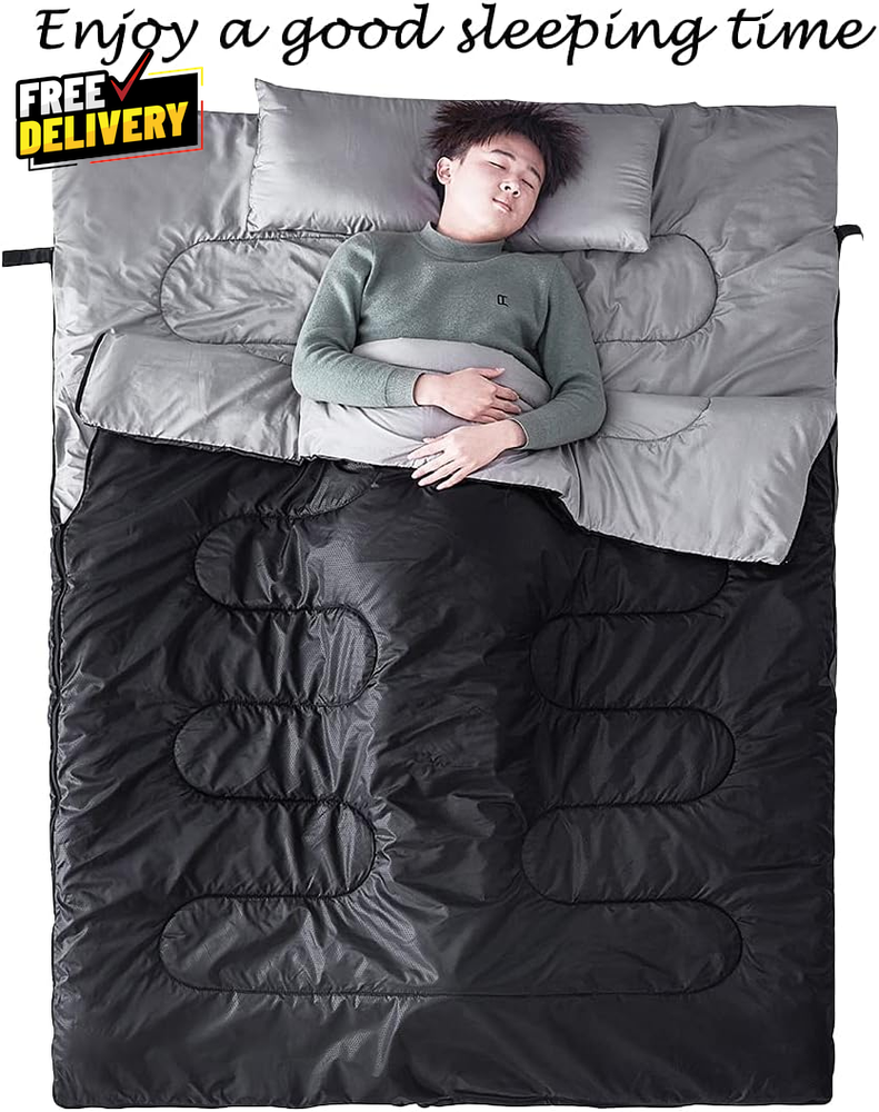 Double Sleeping Bag with 2 Pillows Queen Size XL Waterproof for Camping Hiking
