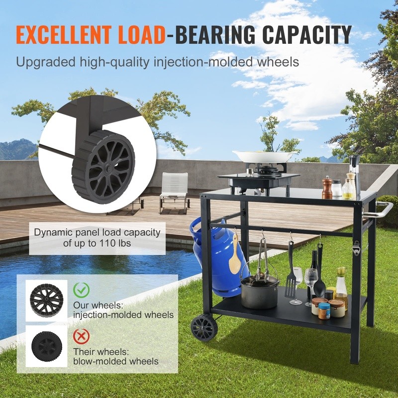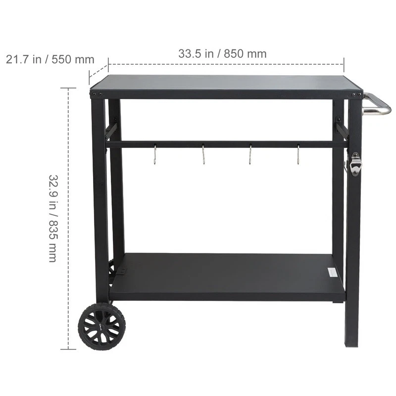 You may also like Charcoal BBQ Grill 24 Inch Adjustable Tray Easy Cleanup Storage Wheels New 175.52 USD 184.76 USD Free shipping 5% off Portable 1 Burner Propane Griddle 18000 BTU LED Control Easy Clean Grease Cup US 93.06 USD 97.96 USD Free shipping 5% off 2-in-1 Electric Smoker Grill Outdoor Cooker W/ Water Pan & Thermometer New 177.17 USD 186.49 USD Free shipping 5% off Charcoal Kettle Grill 363sq in Cooking Space Removable Ash Catcher Temp Gauge US 76.87 USD 80.92 USD Free shipping 5% off Gourmet Blend Natural Hardwood Grilling Smoker Pellets 3 Pack Hickory Apple New 79.4 USD 83.58 USD Free shipping 5% off 3 Burner Propane Gas Grill 30000 BTU Warming Rack Grease Tray Temperature Gauge 172.47 USD 181.55 USD Free shipping 5% off 4-in-1 Electric Charcoal Water Smoker W/ Temperature Gauge & 5.5qt Pan New 143.11 USD 150.64 USD Free shipping 5% off Portable 3 Burner Gas Grill Tabletop Cooking Outdoor BBQ Griddle Camping New 117.78 USD 123.98 USD Free shipping 5% off Product Description Double-Shelf Outdoor Grill Dining Cart It can be used as a barbecue table or pizza oven stand, it can also be used for food preparation, storage, outdoor dining, and more. It provides a convenient and practical workstation for outdoor cooking. Versatile Usage Scenarios This outdoor grill dining cart not only serves as a grill or pizza oven stand but also functions as a storage unit and food preparation workstation. Whether it's a party, camping, or a picnic, this table caters to your diverse needs. Durable and Easy to Clean Constructed with extremely durable materials, the cart body is built to last and resistant to easy damage. Additionally, it is effortless to clean, allowing you to wipe away dust and stains with ease. Furthermore, our tabletop edges have been meticulously polished, not only for aesthetics but also to prevent any risk of cuts or injuries to your hands. Practical Design with Multiple Accessories Designed with a double-tiered shelf, outdoor prep cart can store large kitchen equipment such as ovens, firewood, and barbecue racks. You can also hang various small kitchen utensils and tools on the four hooks, making your kitchen more organized. Additionally, we have prepared a PVC table mat, paper towel holder, knife rack, gas canister holder, and bottle opener to make your usage more convenient. Better Load Capacity Our wheels are crafted using high-quality injection molding technology, offering superior load-bearing capacity compared to the blow-molded wheels commonly used in similar products on the market. User-Friendly Assembly Design The package includes clear installation instructions and a parts list, making assembly a breeze without the need for additional tools or manpower. It saves you from dealing with tedious installation procedures, allowing you to enjoy a stress-free experience. Thoughtful and Practical Features The double-shelf outdoor prep cart is equipped with two directional wheels for enhanced portability and flexibility. Additionally, the stainless steel side handle design makes it convenient to move the cart and hang essential tools. Specifications Item Model Number: TB0110001 Table Top Size: 33. 46 x 33. 46 inch/ 850 x 550 mm Item Size: 39. 37 x 25. 19 x 32. 87 inch/ 1000 x 640 x 835 mm Item Weight: 26. 12 lbs / 11. 85 kg Package Content 1 x Outdoor Grill Dining Cart 4 x Hooks 1 x Large PVC Table Mat 1 x Paper Towel Holder 1 x Knife Rack 1 x Bottle Opener 1 x Gas Canister Holder Multifunctional BBQ Station: A bbq movable food prep table that can be used both indoors and outdoors. In addition to being used as a barbecue table or pizza oven stand, it can also be used for food preparation, storage, outdoor dining, and more, catering to your various outdoor cooking needs. Premium Stable Material: Constructed with extremely durable materials, the cart body is built to last and resistant to easy damage. Additionally, it is effortless to clean, allowing you to wipe away dust and stains with ease. Furthermore, our tabletop edges have been meticulously polished, not only for aesthetics but also to prevent any risk of cuts or injuries to your hands. Double-layered Shelves and Abundant Accessories: The double-layered shelf structure is designed to provide sufficient storage space for your pizza oven, firewood, barbecue grill, or cooking equipment. Portable modular cart is equipped with 4 hooks that can be used to hang kitchen accessories and various tools. Additionally, we have prepared a PVC table mat, paper towel holder, knife rack, gas canister holder, and bottle opener to make your usage more convenient. Superior Load-bearing Capacity: Compared to the blow-molded wheels used by most similar products on the market, we have upgraded to higher-quality injection-molded wheels, with a weight of 130g per wheel, providing superior load-bearing capacity. The panel can dynamically bear a weight of up to 110 lbs. Easy Assembly: This multifunctional food prep worktable comes with clear installation instructions and a list of accessories, with the installation parts placed in separate sections for easy self-assembly within a few minutes. In addition, the smooth tabletop is very easy to clean and can be wiped clean with a damp cloth. You may also like Boucle Cloud Storage Ottoman Round Seating Organizer Indoor Footrest Home Decor 47.13 USD 49.61 USD Free shipping 5% off Waterproof Scratch Resistant Hammock Seat Cover Dogs Cats Universal Fit SUV Car 36.75 USD 38.68 USD Free shipping 5% off 7ft 2pc Medium Grit Fishing Rod Saltwater Spin Braid Friendly Durable Design New 29.19 USD 30.73 USD Free shipping 5% off Bamboo Shoe Rack W/ Umbrella Stand 3 Tier Organizer Indoor Entryway Storage New 60.37 USD 63.55 USD Free shipping 5% off 12 Ft Hunting Blind Durable Burlap Material Glare Free Concealment 19.1 USD 20.1 USD Free shipping 5% off Rectangular Console Table W/ Glass Top Open Shelves Handcrafted Steel Frame New 204.97 USD 215.76 USD Free shipping 5% off 6 Tier Narrow Bookshelf LED Light Modern Ge