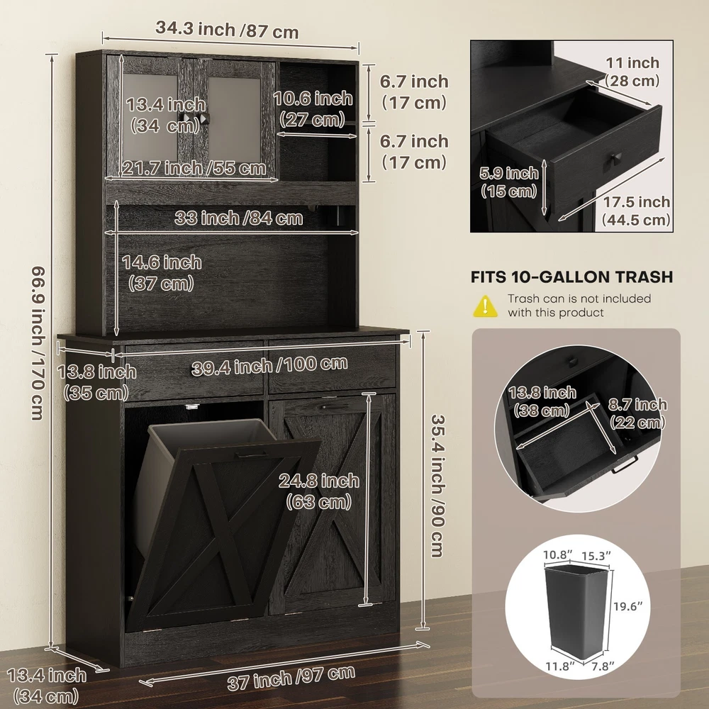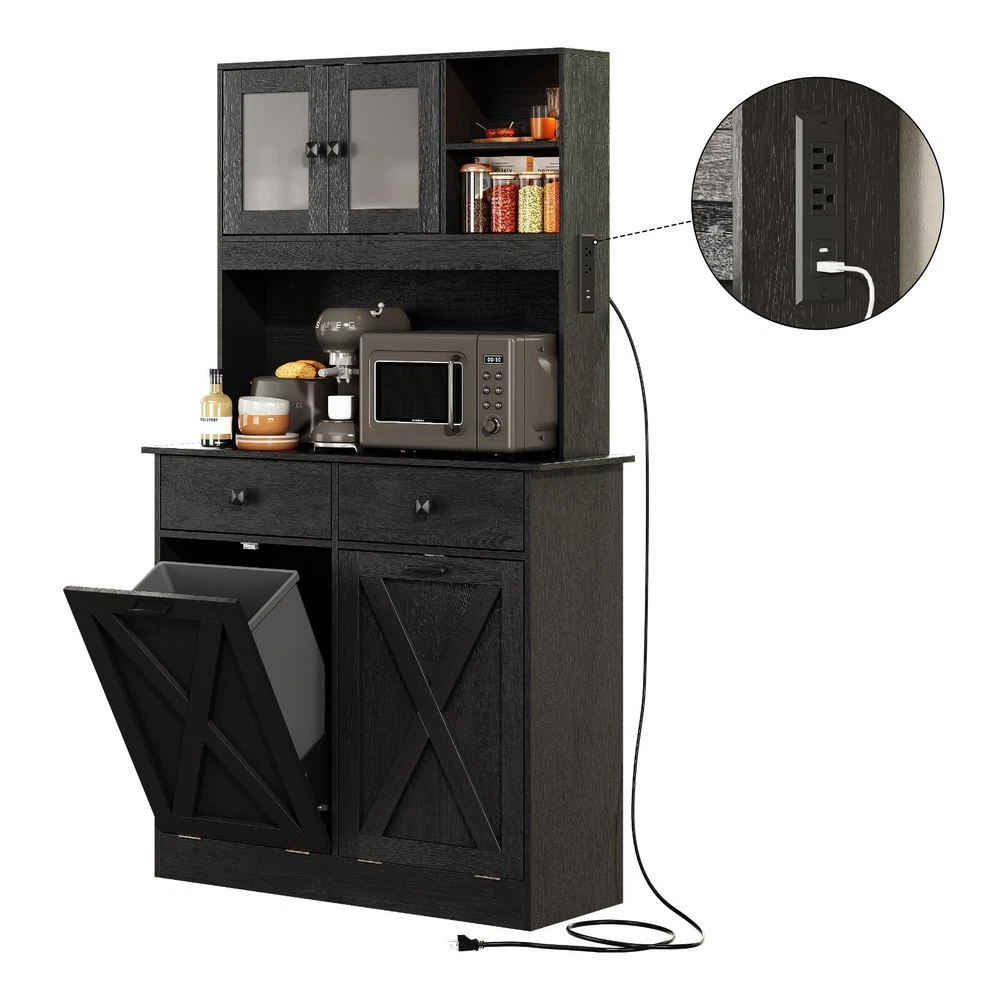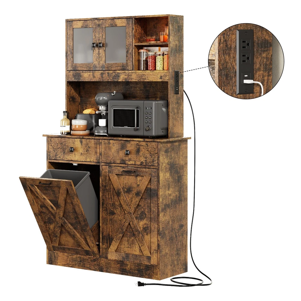 【Ample Storage Space】 This tilt out trash can cabinet features a top storage area, storage shelves, and 2 storage drawers that allow you to neatly display or store kitchen accessories or essential cooking tools, keeping them easily accessible. In the middle, you will find a generous storage cabinet surface that provides ample space for various kitchen appliances or essentials, such as a microwave, a coffee maker or a toaster . This central area acts as a convenient workspace, making meal prep and kitchen tasks more efficient. 【Hidden Trash Can Cabinet Design 】 This kitchen trash can storage cabinet features a hidden design for the trash cans, ensuring that unsightly waste is discreetly concealed. This innovative approach not only keeps your kitchen looking tidy and organized but also prevents odors from escaping, ensuring a fresh and clean atmosphere in your cooking space. Each storage cabinet can hold up to 10 gallons of trash cans. 【Versatile Use】 This multi-purpose storage cabinet is not limited to just trash cabinet. It can effortlessly accommodate a laundry basket for dirty clothes or serve as a food storage bin for your pet's supplies. Its versatility makes it a valuable addition to any home, adapting to your needs with ease. 【Sturdy Construction】 Crafted from a high-quality MDF board, this garbage can cabinet boasts a robust and solid structure. T he combination of materials ensures long-lasting durability, providing you with a reliable storage solution that can withstand the daily demands of a busy kitchen. 【2 AC Outlets 125V/12A】 Our cabinet is equipped with 2 AC outlets, 1 Type C port and 1 USB port, allowing you to conveniently and safely use electrical appliances without worrying about a shortage of outlets or their distance. On Jan 24, 2025 at 00:09:14 PST, seller added the following information: