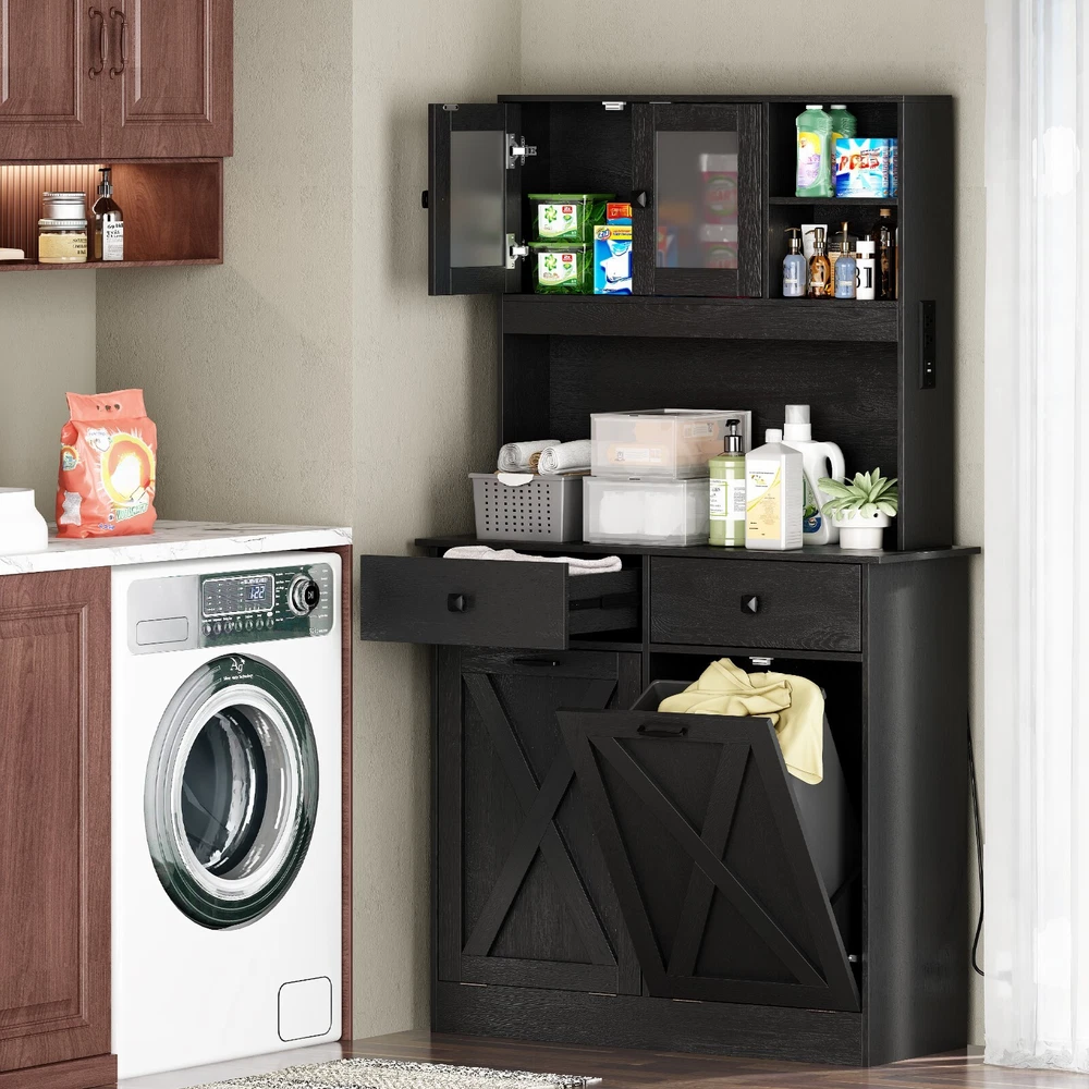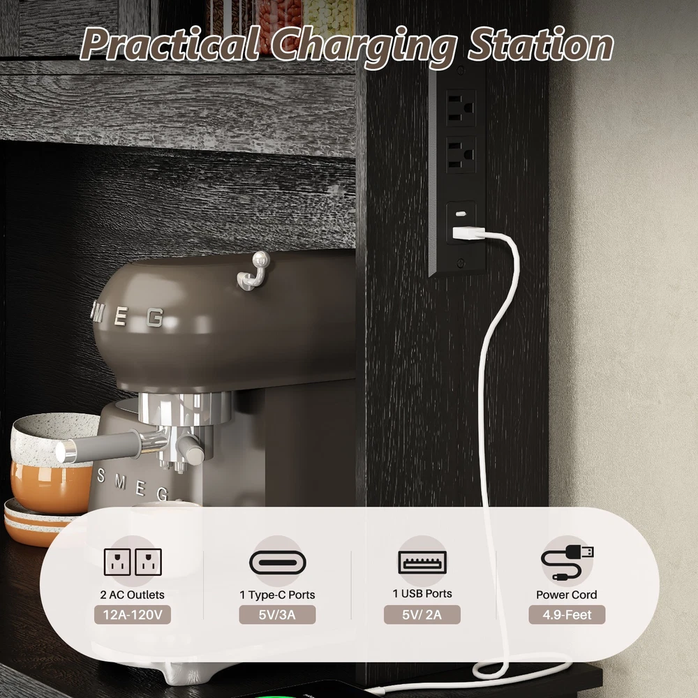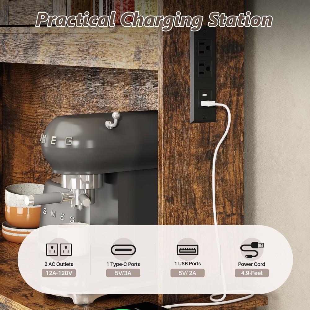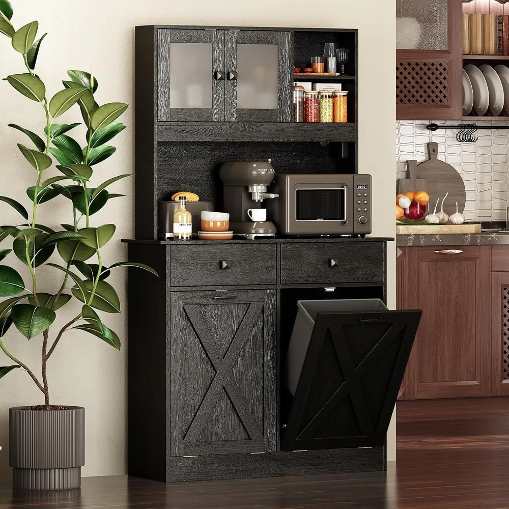 【Ample Storage Space】 This tilt out trash can cabinet features a top storage area, storage shelves, and 2 storage drawers that allow you to neatly display or store kitchen accessories or essential cooking tools, keeping them easily accessible. In the middle, you will find a generous storage cabinet surface that provides ample space for various kitchen appliances or essentials, such as a microwave, a coffee maker or a toaster . This central area acts as a convenient workspace, making meal prep and kitchen tasks more efficient. 【Hidden Trash Can Cabinet Design 】 This kitchen trash can storage cabinet features a hidden design for the trash cans, ensuring that unsightly waste is discreetly concealed. This innovative approach not only keeps your kitchen looking tidy and organized but also prevents odors from escaping, ensuring a fresh and clean atmosphere in your cooking space. Each storage cabinet can hold up to 10 gallons of trash cans. 【Versatile Use】 This multi-purpose storage cabinet is not limited to just trash cabinet. It can effortlessly accommodate a laundry basket for dirty clothes or serve as a food storage bin for your pet's supplies. Its versatility makes it a valuable addition to any home, adapting to your needs with ease. 【Sturdy Construction】 Crafted from a high-quality MDF board, this garbage can cabinet boasts a robust and solid structure. T he combination of materials ensures long-lasting durability, providing you with a reliable storage solution that can withstand the daily demands of a busy kitchen. 【2 AC Outlets 125V/12A】 Our cabinet is equipped with 2 AC outlets, 1 Type C port and 1 USB port, allowing you to conveniently and safely use electrical appliances without worrying about a shortage of outlets or their distance. On Jan 24, 2025 at 00:09:14 PST, seller added the following information:
