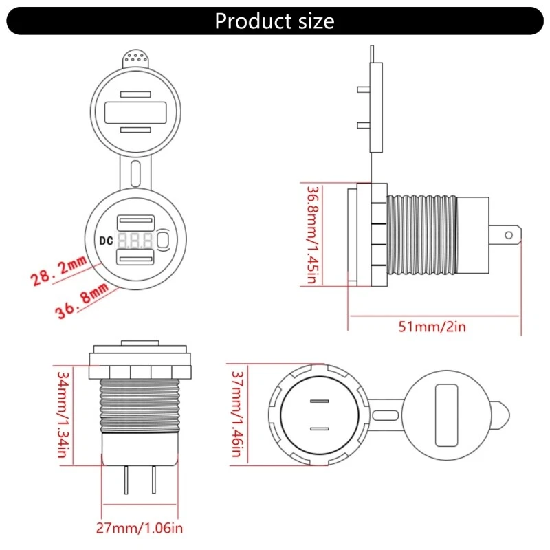 Double USB Car Socket with Real Time For Quick Power Features: fast charging with our double QC3.0 car socket, delivering up to 36W of power to simultaneously charges two devices, significantly reducing charging time. Designed with a built in voltmeter and materials, this USB fast ensures vehicle by levels and is for outdoor use, offering reliable performances in any weather condition. Featuring a user friendly independent and multiple protection mechanisms against overcurrent, overvoltage, and short circuits, this high temperature enhances your driving while safeguarding your devices. Input 12V-24VOutput Double QC3.0Operating temperature -40℃, maximumly 80℃Instructions+''to the positive poles''-''to the negative poles'' Product features: Flame retardant, high temperature resistance, corrosion resistance, durability and deformation resistance.Output 5V3A/9V2A/12V1.5A Specifications: Color:Redness LED/Green LED/Blue LED Component:PC+ABS Product installation: the installation position of the car to open the hole or keep the installation position. Disassemble the board, install the car and tighten the nut to the positive and negative poles of the car and fix the position of the car Package Includes: 1 Set Double USB Car Socket note: 1.Please allow 1-2cm errors due to manual measurement, make sure that you donot mind befores you order. 2.Due to the differences between different monitors, the picture may not reflect the actual coloring of the item. 3. The will display by connecting to the