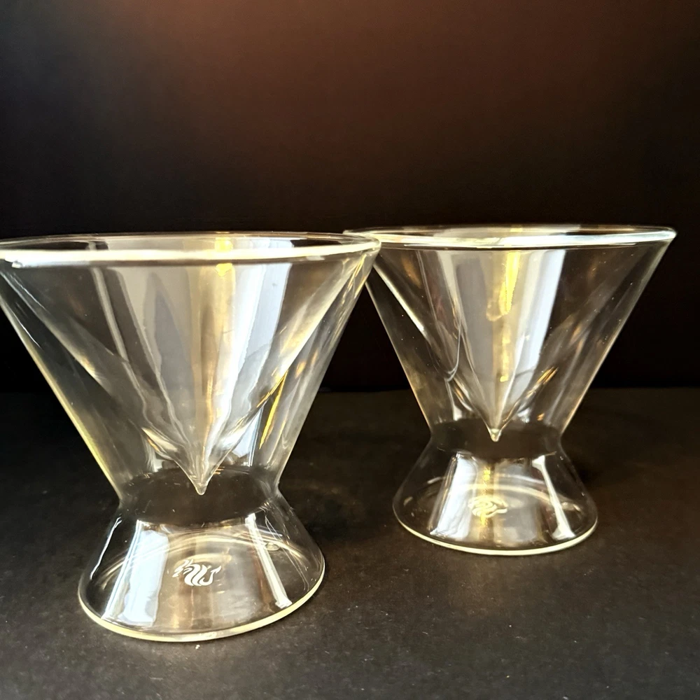 Dragon Glassware Stemless Martini Cocktail Glass Double Wall Insulated Set of 2 These wonderful martini glasses are from a family owned small business based in Sacramento, California.They have a modern design that is perfect for all occasions. The double walls of the glass insulate the drink to keep it cold and tasty. Both glasses are in excellent condition with no chips, scratches, nicks or wear to the luster finish. There are small manufacturers flaw in each glass, see last photo. The glasses are made of borosilicate glass, which is exceptionally sturdy. Borosilicate is the same glass used in laboratories and resists scratches, nicks and breakage. These glasses are100% Lead and BPA Free. This high quality glass is refrigerator and freezer safe, suitable for daily use and cleans easily. Let me know what questions you have. Blessings to you! 🤍🤍🤍🤍🤍🤍🩶🤍