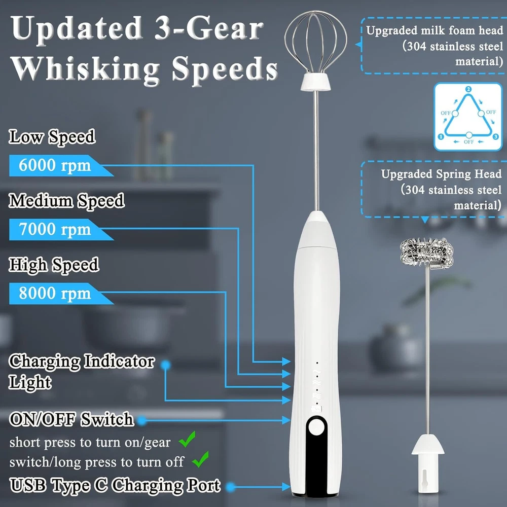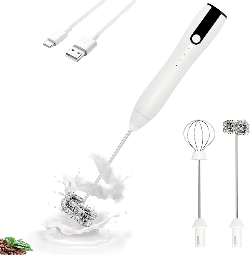 Double Whisk Milk Frother Handheld USB-C Rechargeable J-16White, White Product Details Brand: TonJin Special Feature: Lightweight, Rechargeable, Ergonomic Handle Color: White Material: Stainless Steel, Acrylonitrile Butadiene Styrene (ABS) Recommended Uses For Product: Foamer,Mixer Model Name: W0059-J-16White Included Components: 1 milk frother+1whisk head Product Care Instructions: Hand Wash Only Style: Rechargeable Number of Batteries: 1 Number of settings: 3 Power Source: Battery Powered Wattage: 1200 milliamp_hours Manufacturer: TonJin Package Dimensions: 9.37 x 4.45 x 1.93 inches Item Weight: 7 ounces Item model number: W0059-J-16White Batteries: 1 Lithium Ion batteries required. (included) 【Fast Frothing and Easy to Clean】: This milk frother consists of ABS plastic handle and food grade 304 stainless steel whisk. The upgraded motor gives it a flying frothing speed and efficiency. With high speed mixing, it can produce a large amount of rich foam. Easy to clean, just put the whisk head into water and rinse. 【Built-in Rechargeable Battery and Fast Charging】: This rechargeable milk frother has a built-in 800mAh rechargeable battery and comes with a USB-C charging cable, the red light is on when charging, and the green light is on when fully charged. 【Speeds You Can Choose】: Our electric milk frother mixer has 3 selectable speeds: 1st gear(6000 RPM), 2st gear(7000 RPM) and 3st gear(8000 RPM), you can choose different rotation speed according to your ingredients. In any gears, just press ON/OFF switch button for 2-3s to turn off the frother. The higher speed you choose, the less time you will spend, and the more exquisite foam you will create. 【Double 304 Stainless Stell Whisks】: This handheld coffe frother come with 2 premium food-grade stainless steel whisk. One is great for Coffee, Latte, Milk, Hot Chocolate, Drinks, gives that professional finishing touch to your drinks. Another one is great for whisking egg, which is a good helper for baking in the kitchen. 【Great for Coffee Lover】: This milk foam maker is lightweight and has ergonomically designed soft touch handle. The frother for milk and coffee is so handy and useful that can for your friends and family too as gift. (Package come with 1 milk frother, 1 extra egg whisk head, 1 USB-C cable and 1 instruction).