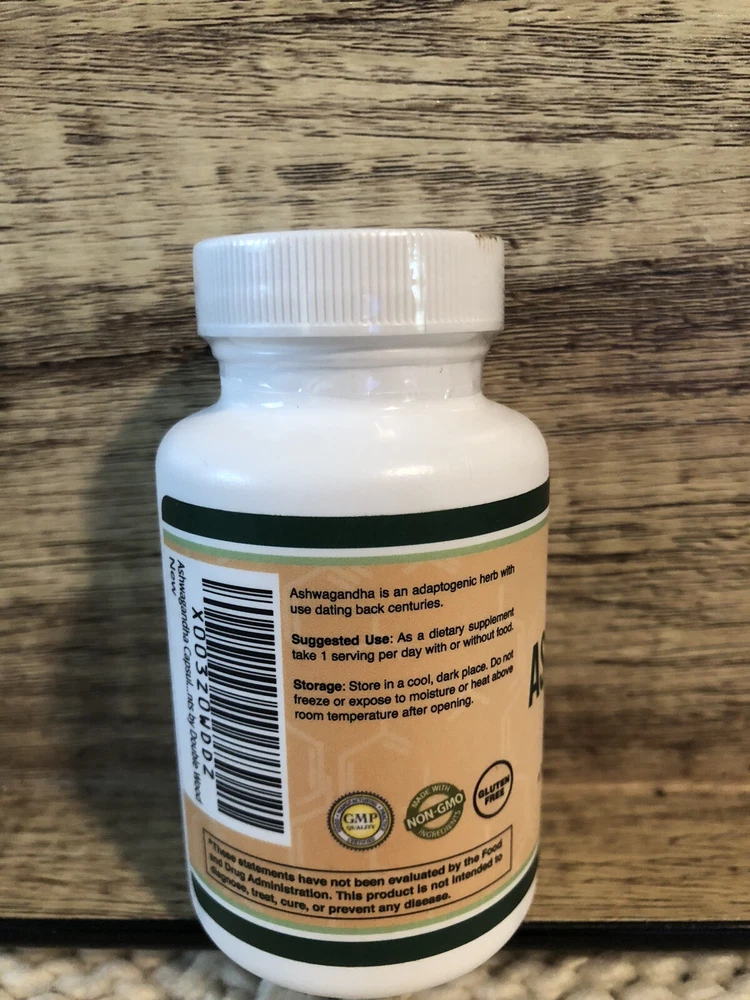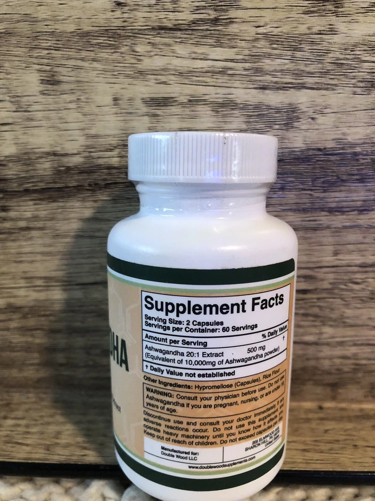 Double Wood Supplements Ashwagandha 120 Capsules 500 mg. Exp 03/26. Sealed and stored at room temperature. Let me know if you have any questions. Thanks so much for stopping by.