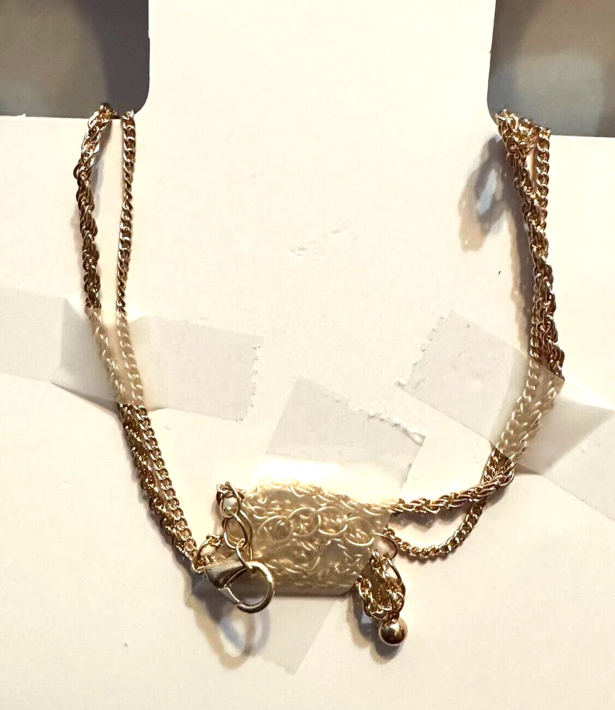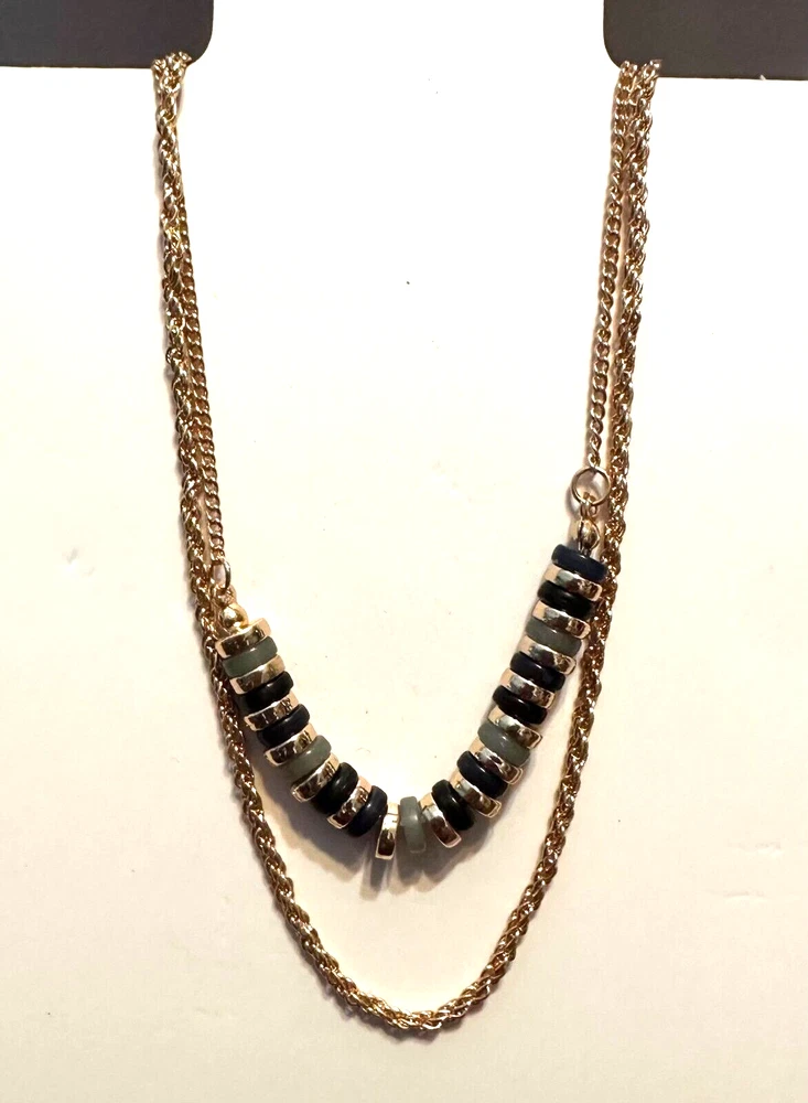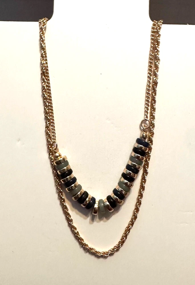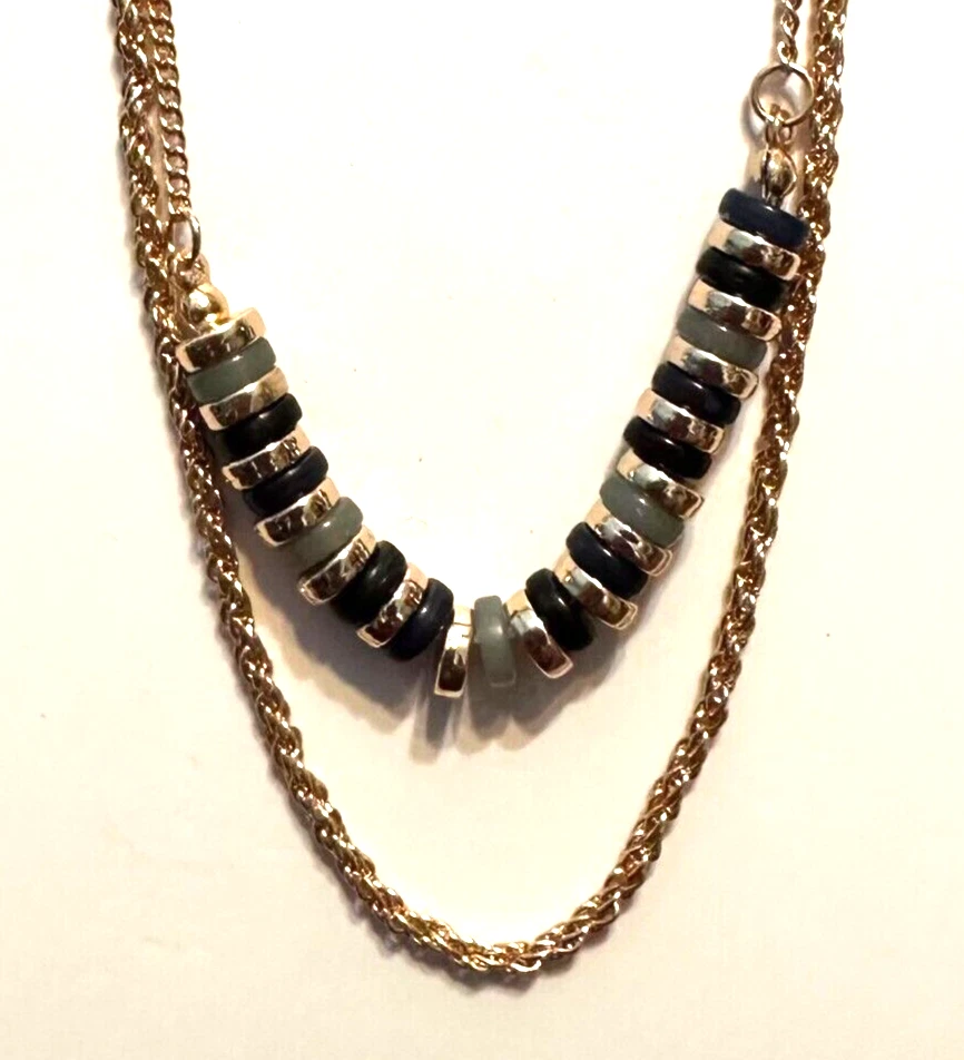 Double chain Necklace Blue/Black and Gold Beads Please look at my site joycecorner for addition jewelry and other items. Thank you for looking!