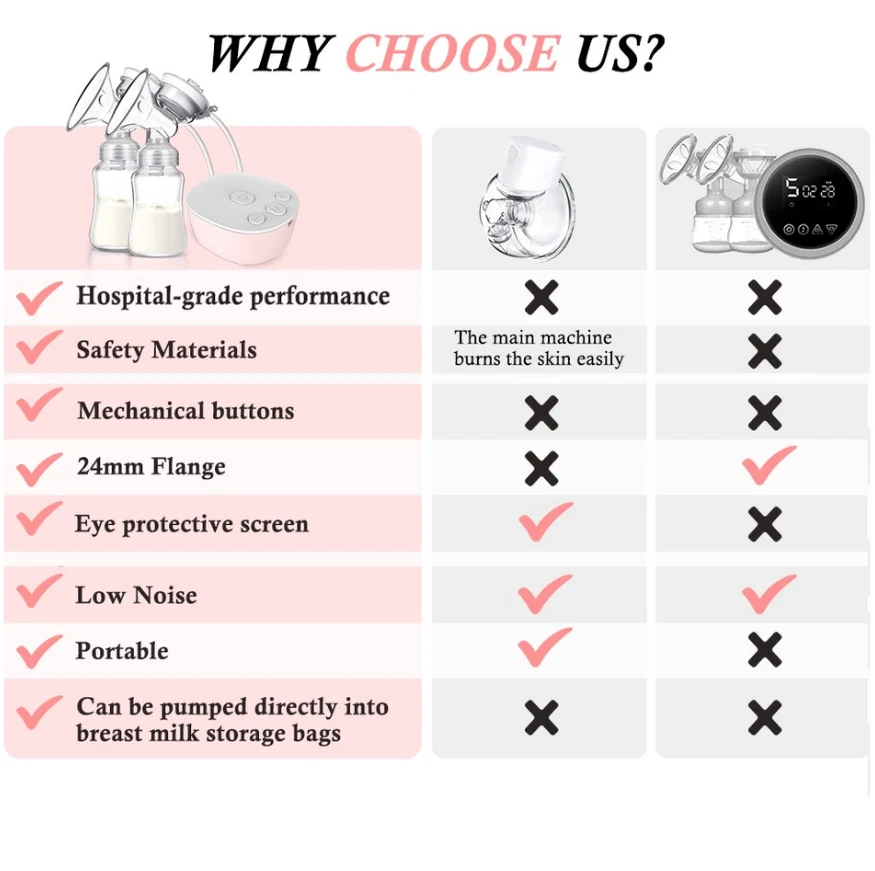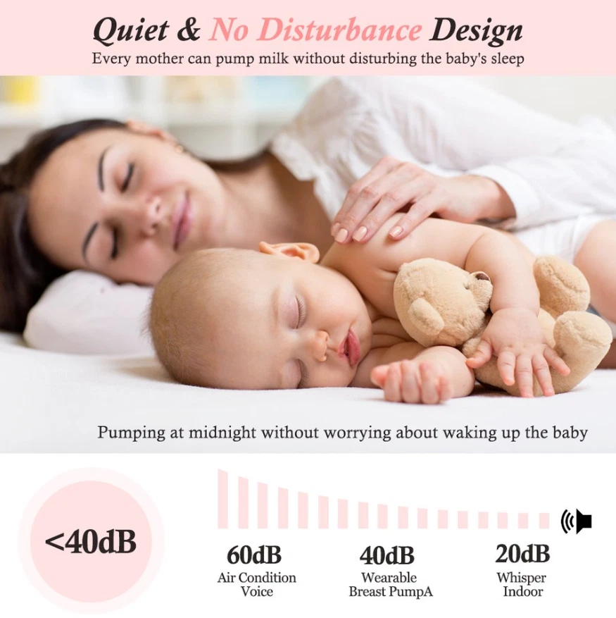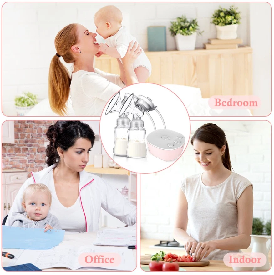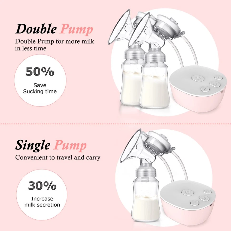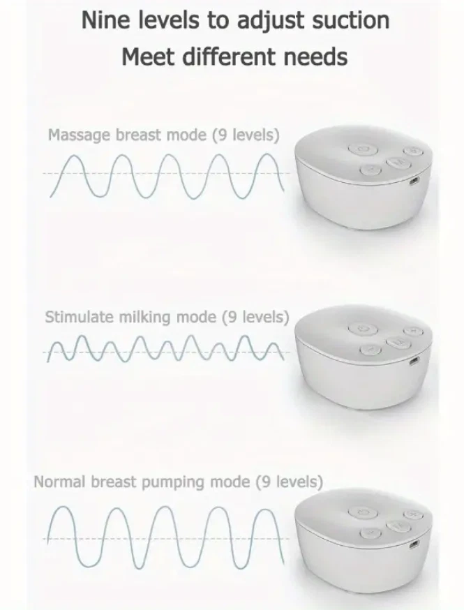 Efficient and Convenient: With 9-speed settings, this electric nursing breast pump allows you to customize the suction level to your comfort and maximize milk production. Double-Breast Design: Save time by pumping both breasts simultaneously with this double-breast breast pump. USB-Powered: No need to worry about finding an outlet, this breast pump can be powered by any USB port, making it perfect for on-the-go pumping. Silent Operation: Say goodbye to loud and disruptive pumping sessions with this silent breast pump. Easy to Clean: The breast milk bottle and pump parts are easy to disassemble and clean, ensuring a hygienic pumping experience. Description Electric silicone breast pump is an ideal breastfeeding tool for Moms. No noisy sounds, simple operation. The breast pump is made of food-grade silicone, not contain BPA, which is very safe. Massage-like suction, easy breast pumping! Features: Anti-Backflow, Anti-Overflow Dual-channel anti-backflow design, fully separated gas and liquid, will not pollute the host when overturned, milk will not be spilled and wasted, milk will not flow back, only up and down, long-term use, clean and pollution-free! Noise Free Performance Double electric breast pump is made with better craftsmanship. The baby won't be woken by the gentle milk sucking and low noise design of 40 dB. The electric breast pump has a longer battery life, and is easier to use. Mom can rest assure about baby sleep and use electric breast pump double freely. Ergonomics Technology 105°soft silicone breastshield, which conforms to the breast shape of most types of mothers, perfectly fits the breasts, allowing mothers to secrete breast milk in a relaxing and comfortable way. The breast pump has a soft edge that will not harm the skin and can be adjusted 360° to the most comfortable position. Give Mum more comfort and give babies more milk. Painless The electric breast pump has a soft edge and is made of food-grade soft silicone. Made of food-grade silicone and PP, it is skin-friendly, safe and BPA-free. It won't be painful while maintaining a good seal to get the best suction power. Breast pump can achieve effective pumping in a short time. It can save up to 50% of the time and produce 18% more milk. Easy to Clean The parts of the electric breast pump are easy to assemble and clean. Except for the electrical parts, all other removable parts are dishwasher safe. The pump is small size and portable, it's convenient to carry around, especially for mothers on work. Be Careful It is recommended to use automatic mode for the first time to gradually adapt the breast to suction. If the nipple is chapped or bitten by the baby, please do not use this product for the time being to avoid discomfort. Leaks? First of all, check whether the sitting posture is correct. The correct sucking posture is to sit sucking, lean forward 45 degrees, and keep the container upright after sucking.In addition, parts are also recommended to be replaced within 1 to 2 months. Pain? Solution: first check whether there are lumps in the breast? Is the nipple chapped?It is recommended to use the automatic gear first.And do not use too much force to connect the breast to the lowest position.In addition, it is recommended that the sucking time should not exceed 15 minutes. Specifications: Style: Double electric breast pump Material: PP, Liquid-silicone Gears: 9 gears for each mode Capacity: 150mlx2 Power Supply: USB Plug in Size: Host size: 9.35x8.15x4.05cm/3.68x3.21x1.59in, bottle size: 18x5.5cm/7.09x2.17in Package: Breast Pump host x1 Breast Bottle set x2 USB line x1 Health tips: 1. Wash hands before using a milk pump to milk 2. Breasts or nipples should stop milking when they feel pain 3. Do not put refrigerated breast milk and fresh breast milk together 4. After the defrosted breast milk is thawed, you baby can not finish drinking after 24 hours, please do not repeat the refrigerated breast milk Search keywords portable breast pump, baby buddha pump, breast pumps, wireless breast pump, breast pump hands free, electric breast pump, mom cozy pump, brestfeeding pump Electric Breast Pumps for Women Adjustable Mode& Suction Pain Free and Comfortable Fast USB Rechargeable Completely Closed System 3 Modes 9 Levels