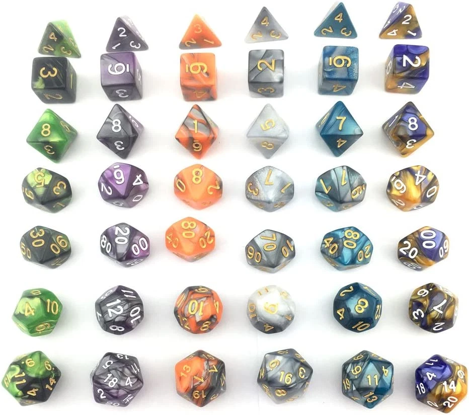 You will receive 6 x 7-Die dice sets with 6 small pouches and 1 big pouch. A single 7-die set contains one d20, one d12, two d10 (00-90 and 0-9), one d8, one d6, and one d4. Colors are the same with the first picture. Made of acrylic materials which is durable and hardwearing. Each die with large and easy to read golden numbers. Perfect for Table Games, Board Game, Dungeons and Dragons, MTG, RPG, Shadowrun, Pathfinder, Heroscape, Savage World, Yahtzee, Math Teaching, etc. TIPS: if you receive defective dices, missing dices sets or sets which have wrong colors, please contact us. Product Description This sets of 6 double- color series dices comes with 6 sets of 7-die dices (totally 42pcs) with 7 pouches. A single 7-die set contains one d20, one d12, two d10 (00-90 and 0-9), one d8, one d6, and one d4. Feature 1 You will receive 6 x 7-Die dice sets with 6 small pouches and 1 big pouch. A single 7-die set contains one d20, one d12, two d10 (00-90 and 0-9), one d8, one d6, and one d4. Feature 2 Guaranted no duplicate colors. Colors are the same with the first picture. Feature 3 Made of acrylic materials which is durable and hardwearing. Each die with large and easy to read golden numbers. Feature 4 Perfect for Table Games, Board Game, Dungeons and Dragons, MTG, RPG, Shadowrun, Pathfinder, Heroscape, Savage World, Yahtzee, Math Teaching, etc.