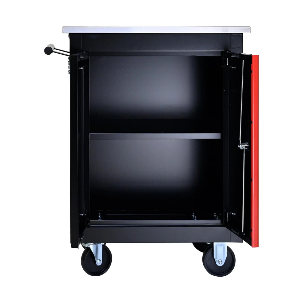 DOUBLE-DOOR CLAPBOARDl MULTI-FUNCTION TOOL CART--BLAK&RED DOUBLE-DOOR CLAPBOARDl MULTI-FUNCTION TOOL CART--BLAK&RED Product features: 【 Flexible Mobility and Stability 】The assembly trolley is equipped with four steering wheels, two of which have parking brakes. This design allows you to move the trolley freely around the garage while ensuring it can be securely stopped in one place, providing both flexibility and stability. 【 Additional Storage Surface 】The trolley features a storage surface that provides extra space for organizing and storing frequently used tools. This additional area helps keep your workspace tidy and ensures that your tools are always within reach. 【 Durable and Wear-Resistant Construction 】The trolley is constructed from robust steel and coated with a durable powder finish. This construction ensures high wear resistance, making the trolley suitable for heavy-duty use and long-lasting performance. 【 Modular Design for Expanded Use 】The trolley comes with a round hook at the bottom, allowing you to connect another tool cart and create a modular combination. This feature enhances the versatility of your workspace setup. 【 Key Locking System 】The trolley includes a key locking mechanism to protect the tools and items stored inside. This feature ensures that your valuable tools and equipment are secure and safe from unauthorized access. Description Delivery Returns DOUBLE-DOOR CLAPBOARDl MULTI-FUNCTION TOOL CART--BLAK&RED The Workshop Bench is designed with functionality and durability in mind. It features four steering wheels, two with parking brakes, allowing for easy mobility and secure positioning in the garage. The bench offers additional storage space on its surface for organizing frequently used tools, keeping your workspace tidy and efficient. Constructed with robust, powder-coated steel, it provides high wear resistance and long-lasting performance. The bench also includes a round hook at the bottom, enabling you to connect another tool cart and create a modular setup. Additionally, the key locking system ensures that your tools and items are securely stored, protecting them from unauthorized access. Specification: Material: Cold Rolled Steel Surface Finish: Powder Coating Casters: 4" Casters (2PCS with brake and 2PCS without brake) Product Size (with wheels and countertops): 22.28*13.58*30.71INCH Product Size(without wheels and countertops): 20.63*12.99*25.16INCH Package Size: 23.31*15.35*28.66INCH Net Weight: 36.82LBS Gross Weight: 41.23LBS Color: Black+Red You Will Get: 1x Tool Cart We strive to deliver products within 2-3 days (Mon - Friday 9am - 6.00pm) after payment has been received. We use the best couriers available to us to ensure that your product is received on time and in great condition. Please ensure that someone is available to sign for the item as signatures are required. No Delivery Zones Due to geographical and logistical restrictions, we are sorry to let you know that we are not able to deliver our products to areas listed below. Excludes: Alaska/Hawaii, APO/FPO, US Protectorates, Africa, Central America and Caribbean, Middle East, South America, Brunei Darussalam, Cambodia, Hong Kong, Indonesia, Laos, Macau, Malaysia, Philippines, Taiwan, Thailand, Vietnam, Bermuda, Greenland, Mexico, Saint Pierre and Miquelon, American Samoa, Cook Islands, Fiji, French Polynesia, Guam, Kiribati, Marshall Islands, Micronesia, Nauru, New Caledonia, Niue, Palau, Papua New Guinea, Solomon Islands, Tonga, Tuvalu, Vanuatu, Wallis and Futuna, Western Samoa, Afghanistan, Armenia, Azerbaijan Republic, Bangladesh, Bhutan, China, Georgia, India, Kazakhstan, Kyrgyzstan, Maldives, Mongolia, Nepal, Pakistan, Russian Federation, Sri Lanka, Tajikistan, Turkmenistan, Uzbekistan, Albania, Andorra, Belarus, Bosnia and Herzegovina, Bulgaria, Croatia, Republic of, Cyprus, Czech Republic, Estonia, Finland, Gibraltar, Greece, Guernsey, Iceland, Jersey, Liechtenstein, Macedonia, Malta, Moldova, Monaco, Montenegro, Norway, Poland, Romania, San Marino, Serbia, Slovakia, Slovenia, Svalbard and Jan Mayen, Switzerland, Ukraine, Vatican City State, PO Box, Angola, Cameroon, Cayman Islands, Libya, Suriname, Guyana, Panama, Mauritius, Chad, Madagascar, Bahamas, Iran, Saint Kitts-Nevis, Western Sahara, Bolivia, Congo, Republic of the, Seychelles, Sudan, Guadeloupe, Venezuela, Somalia, Burma, Cuba, Republic of, Reunion, Yemen, Barbados, Belize, Liberia, Sierra Leone, Central African Republic, Martinique, Dominica, Niger, French Guiana, Saudi Arabia, Nicaragua, Anguilla, Antigua and Barbuda, British Virgin Islands, Cape Verde Islands, Honduras, Saint Vincent and the Grenadines, Turks and Caicos Islands, Botswana, Eritrea, Swaziland, Lesotho. In the unlikely event that your item is lost or damaged in transit, please do not worry. Your item is sent on a fully insured service and we will offer you a full refund or replacement item and will deal with any issue fast! Proof of postage and delivery is available on all purchases. Should your item arrive damaged (damage to the item, not to the packaging) we ask that you do not sign for the item and instead insist that the item is returned to us. Should this be the case please contact us immediately. If you are unsure if the item has arrived damaged, please simply sign for the item as damaged and then inspect the contents of the package when able to do so. Should you wish to return your item for any other reason please contact us to discuss the return process. You must first obtain written consent from us whereby we will supply you with with further details including a return code. All returns must be received within 30 days of purchase. Support Mail support within 24-48 hours If you are collecting the goods yourself, please give us a short notice beforehand. SHIPPING US: FREE PAYMENT Payment should be completed within 7 days after buyer places the order,or else an unpaid case will be opened in order to cancel the transaction. If 