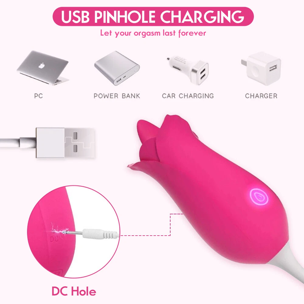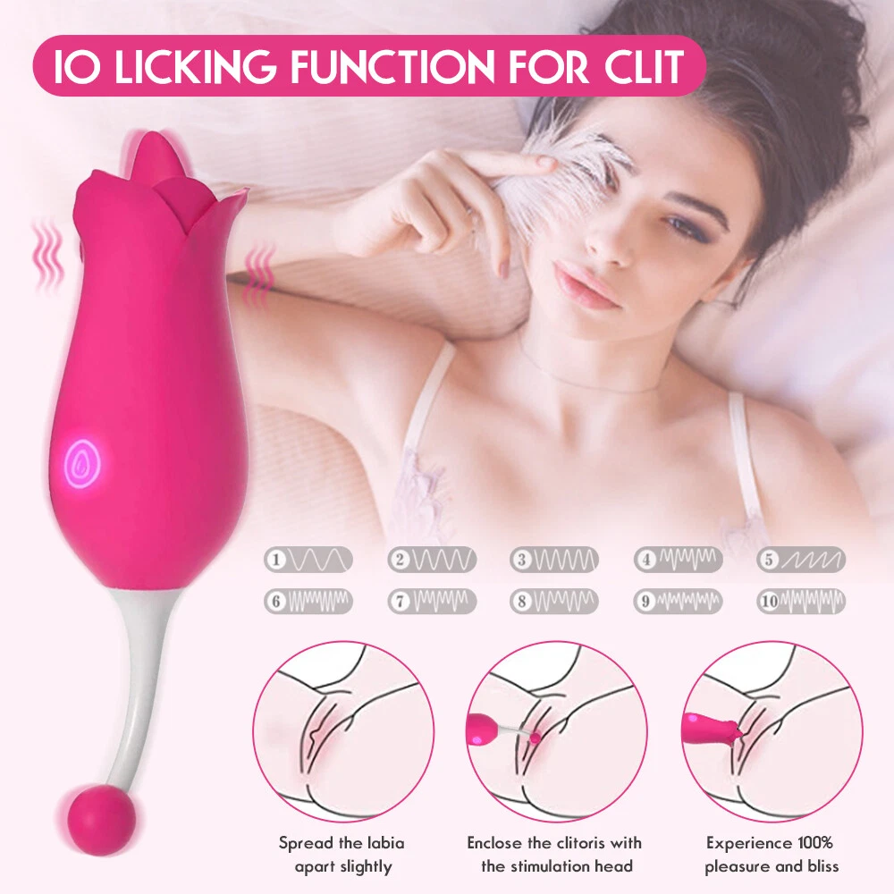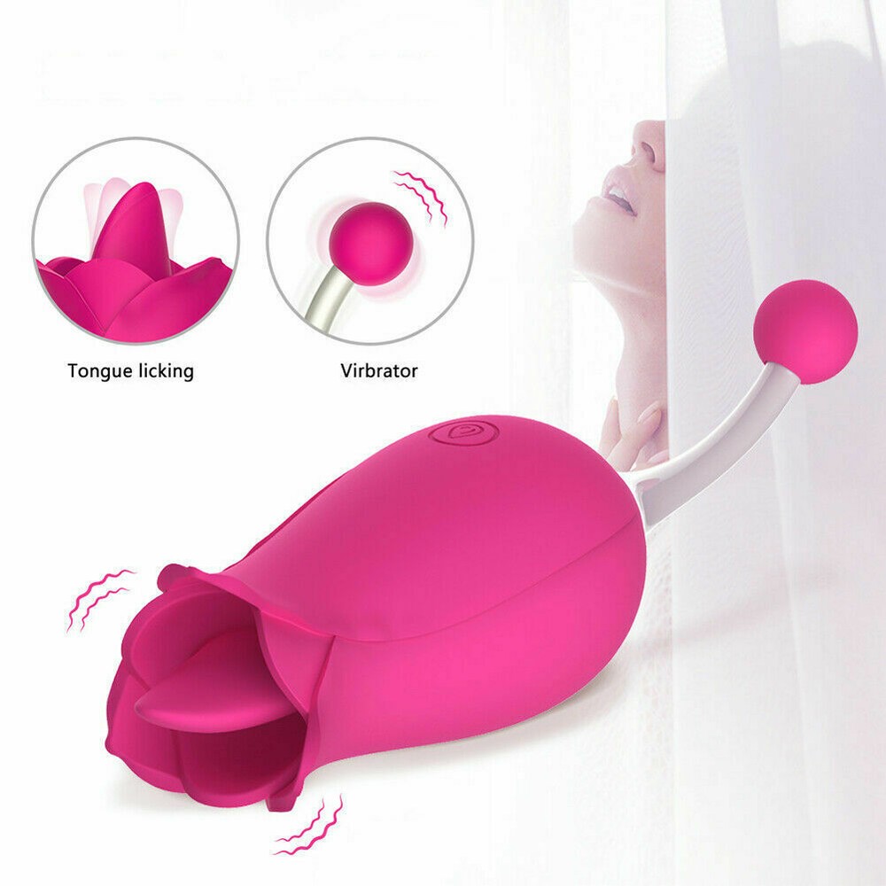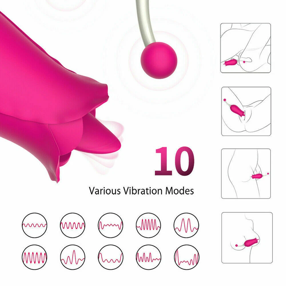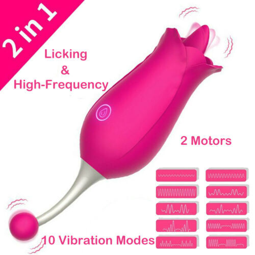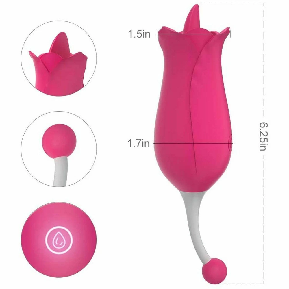 Specifications: Material: ABS + Silicone Optional Color: Rose Red Size: 16*4.5*4.5cm / 6.30*1.77*1.77in Battery Type: Rechargeable Charging: USB Cable Features: · Rose shape like hidden tongue in middle licking vibrator, with a vibratable ball tail, 2 in 1 design, 1 product, 2 motors, 2 optional shapes vibrators, 2 stimulation feels. · Unique cool look toy, and practical with 10 vibration modes. · Tongue stimulator and ball stimulator for clitoris, nipples, secret massager, vagina or G-pot, different positions, different orgasms. · Strong vibration, high vibrating frequency, provide you exciting sex experience. · Premium silicone material, smooth touch and durable, good cost performance. · Quiet functioning, keep your secrets. · Small portable size for easy carrying. · Easy to use. Waterproof and easy to clean. How to Use: 1. Press the button to power on / off. 2. Short press to function the licking mode, 10 licking vibration modes for choice. 3. Double press the button to stop the licking mode and switch to the ball vibrating mode, short press to change the vibrating frequencies, 10 vibrating modes for your choice. 4. Charging port is above the letter “DC”, the vibrator will light up when charging. Tips: * Wash it with toy cleaner or mild soap before and after use, store separately in a dry cool place. * Do not use it when it is charging. * Life proof, no immerse in water. Notes: * Due to effect of light, camera and monitors, real items' colors may have slightly difference. * Allow slight dimension difference due to manual measurement. * Thank you for your kindly understanding. Package Includes: 1 X Vibrator 1 X USB Charging Cable 1 X User Manual