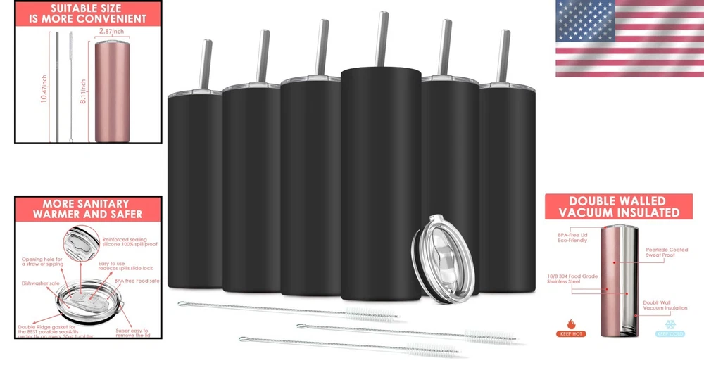 Double-Insulated 20 Oz Stainless Steel Tumblers - 6-Pack with Lids and Straws ‹ › ‹ › ‹ › ‹ › ‹ › ‹ › ‹ › ‹ › Double-Insulated 20 Oz Stainless Steel Tumblers - 6-Pack A Perfect Blend of Elegance and Utility Key Features: Constructed from premium 18/8 stainless steel for exceptional rust resistance and durability. Extra spray painting ensures an aesthetically pleasing finish that’s also easy to clean. Double-walled vacuum insulation keeps drinks icy cold for 5 hours or piping hot for 3 hours, making it perfect for all seasons. Enhanced spill-proof lids feature a convenient sliding button design to reduce accidental spills. Perfectly sized at 20 oz, this versatile tumbler is great for water, juices, ice coffee, cocktails, and more! Wide application: Ideal for parties, picnics, poolside lounging, camping trips, or enjoying a relaxing moment at home. Specifications: Material: High-quality 304 stainless steel Height: 21.4 cm (including lids) Base Diameter: 6.7 cm Cup Mouth Diameter: 7.4 cm Color Options: Five vibrant colors to choose from Package Includes: 6 x Stainless Steel Tumblers 6 x Steel Straws 6 x Splash-Proof Lids 3 x Straw Brushes Why Choose Our Stainless Steel Tumblers? Experience luxury like never before with our Double-Insulated Stainless Steel Tumblers. Whether you are enjoying a sunny day by the pool, hosting a gathering, or embarking on an outdoor adventure, these tumblers keep your beverages perfectly chilled or warmed. Their sleek, modern design complements any setting. Don’t settle for mediocre drinkware. Elevate your daily hydration and indulge in the pleasure of drinking from these premium tumblers. Order your set today and enjoy unparalleled versatility and style! Shipping Free & Fast Shipping - We offer free shipping to most of the USA with a normal delivery time of 3-7 days. However, due to the current situation, additional delivery time (up to 3 weeks) may be required for some items. Alternative Carriers - We may use alternative carriers (e.g. USPS, FedEx, UPS, etc.) to ensure your package arrives safely and on time. Due to the use of multiple carriers, we are unable to provide a tracking number automatically. Handling Time - Orders are processed and shipped within 1-2 business days of receiving cleared payment. Shipping Restrictions - Shipping to Alaska, Hawaii, Puerto Rico, Guam, and other US territories may incur shipping charges or delivery restrictions. Please contact us before ordering, or your order can be refunded/cancelled. State Restrictions - There may be restrictions based on your state of purchase. For example, certain items may not be shipped to California due to state regulations. Contact for Tracking Updates - If you require tracking updates or have any concerns about the delivery of your order, please feel free to contact us, and we will be happy to assist you. Return Please see our eBay Return Policy. Thank you. Payment We accept all major credit cards, PayPal, and Apple Pay for your convenience. Your payment information is secure and encrypted to ensure a safe and seamless transaction. Please complete your payment within 3 days of purchase to avoid any delays in shipping. Feedback Your feedback is extremely important to us. We strive to provide the best products and customer service possible. If you are satisfied with your purchase, please take a moment to leave us a positive review. If you have any concerns or issues with your order, please contact us before leaving negative feedback. We are committed to resolving any problems and ensuring your satisfaction. Contact Us If you have any questions or concerns, please feel free to reach out to our customer support team. You can contact us through the eBay messaging system. We are available Monday to Friday, 9:00 am to 5:00 pm EST, and we will do our best to respond to your inquiry within 24 hours. Thank you for supporting our small family business! UPC: Not Set Unit Quantity: 6 Material: Stainless Steel,304 Stainless Steel,18/8 Stainless Steel Theme: Sports Features: Insulated,Double Insulated,Splash-proof Lid,Break Resistant Character: Not Set Department: Adults Type: Insulated Tumbler Brand: Unbranded Color: Black Character Family: Not Set Beverage Type: Hot or Cold Pattern: Solid Capacity: 20 oz Lid Type: Sliding Lid MPN: Not Set Country/Region of Manufacture: Not Set Item Height: Not Set Item Width: Not Set Keeps Hot For: 3 hrs Keeps Cold For: 5 hrs Number of Items in Set: Six-Piece Item Weight: 4.2 lb Manufacturer Warranty: Not Set Model: Not Set Unit Type: lb Care Instructions: Hand Wash Only Personalize: Not Set