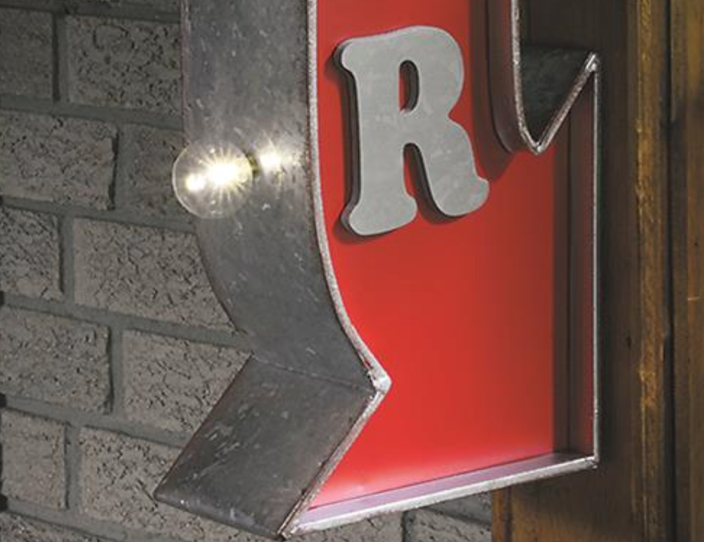 Bar Lighted Marquee Point the way to the bar with this marquee sign! The two-sided giant arrow sign sports BAR graphics, distressed steel, and three bright LED bulbs. It's powered by two AA batteries (not included) and measures 10 in. x 30 in. Great man gift for man cave , game room , or bar. Fast and Free Shipping!