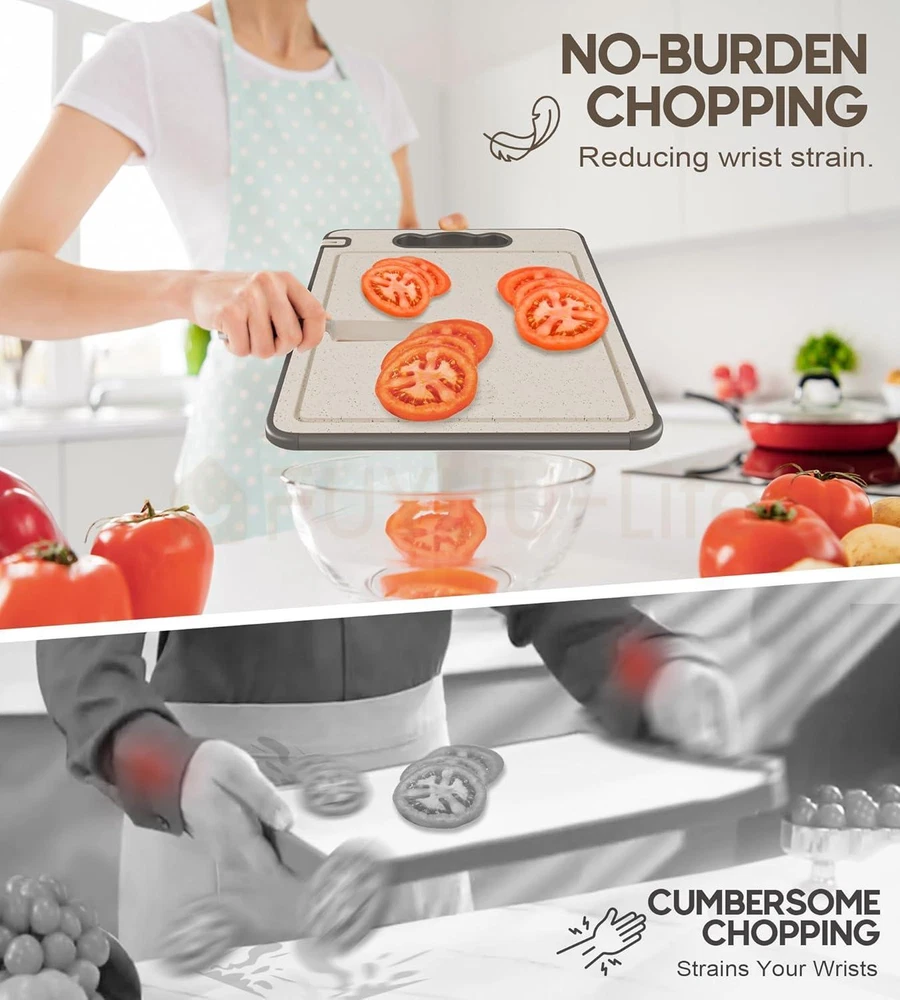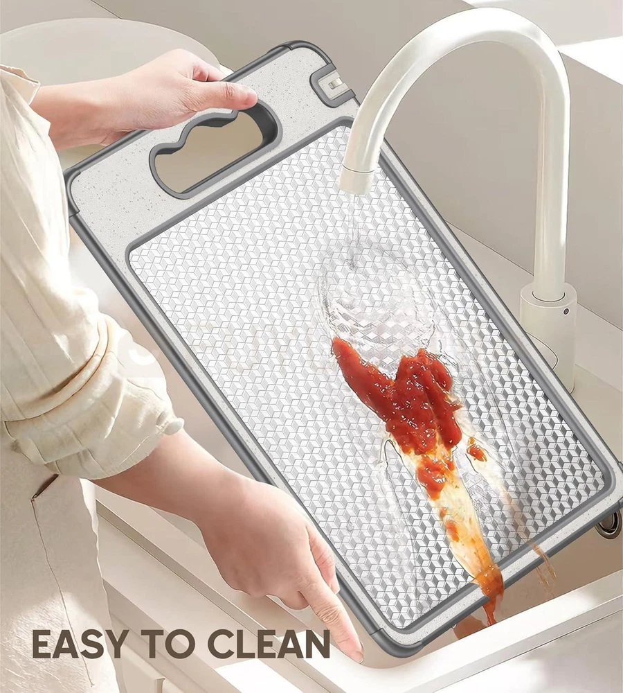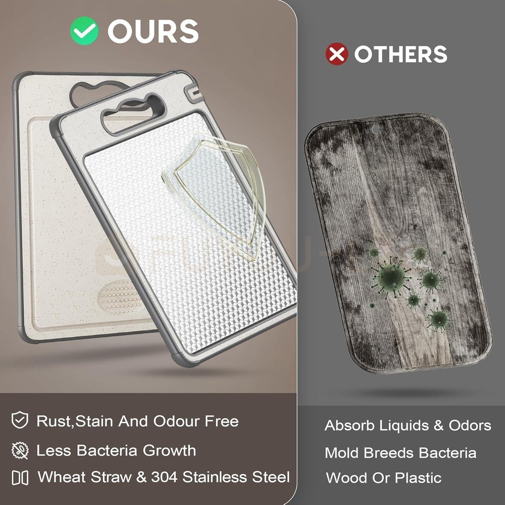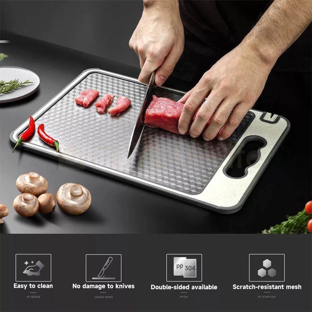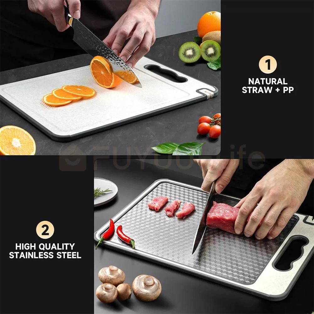 This cutting board is a game-changer! The stainless steel side is perfect for meats, while the wheat straw side handles veggies and fruits effortlessly. Love the antimicrobial, odor-free design—plus, it’s super easy to clean. The mesh panel prevents slipping and reduces scratches. Eco-friendly, durable, and great for both kitchen and camping. Highly recommend!