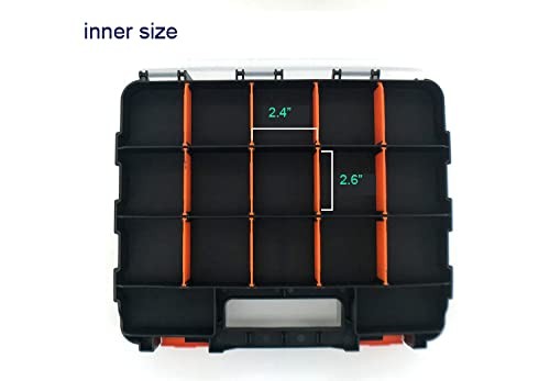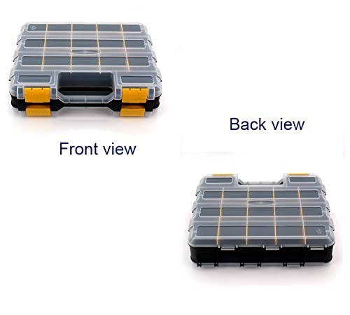 Double Sided Small Parts Tool Box Features Double side with 34 compartments, all removable dividers are easily slide on and off to customize the storage space. The fixed sections add an extra space for special need. Made of durable and heavy-duty plastic material. Black orange mix color body, transparent lids, orange closure and divider pieces. With the robust latch system keeps the organizer locked down and the storage box tightly sealed. The transparent cover allows you to see everything at a glance. The top handle can easy to carry the storage organizer. This handy and versatile container is perfect for parts, fasteners, screws, nails, nuts, bolts, electrical connectors, hair accessories, bead storage, fishing tackle, and various other smaller construction items. Production Specifications Material: PP Color: Black + Orange Size: 12.6" x 10.6" x 3.2" Compartments measure approximately 2.6" x 2.4" What’s in the box 1 x Components Storage Box Double side design with 17 whole compartments. All removable dividers are easily slide on and off to customize the storage space. The fixed sections add an extra space for special need The tool storage box is made of eco-friendly PP, good toughness, sturdy and durable, and less prone to breakage and damage when dropped. Suitable for tool storage, consolidation and classification, perfect for home, truck, office, patio, garage and workshop use. Ideal for storing a range of items including nuts, bolts, screws, nails, general fixings and components The transparent cover allows you to see everything at a glance. The top handle can easy to carry the storage organizer, a robust latch system keeps the organizer locked down. The box size is about 12.6" x 10.6" x 3.2". Compartments measure approximately 2.6" x 2.4".