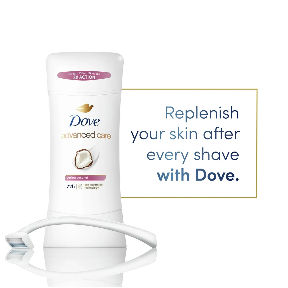 Product Description Dove Advanced Care Antiperspirant Deodorant Caring Coconut 2.6oz (6 Pack) Dove Advanced Care Antiperspirant Deodorant Stick for Women Caring Coconut, 2.6 oz. It’s time to show off your underarms with confidence with this antiperspirant hero. Meet Dove Advanced Care Caring Coconut Antiperspirant Deodorant Stick, which works to help your skin barrier repair after shaving with every use, delivering soft, resilient underarms with every use.Once applied, allow the jasmine petal and creamy coconut scent to uplift and energize you throughout the day. Dove Advanced Care Antiperspirant Deodorant Stick for Women Caring Coconut, 2.6 oz CARES & PROTECTS: Dove Advanced Care Caring Coconut Antiperspirant Stick is the kind-to-skin antiperspirant deodorant for beautifully soft, resilient underarms. LONG-LASTING PROTECTION: Antiperspirant deodorant with 72-hour sweat and odor protection. CARING FORMULA: Antiperspirant featuring innovative Pro-Ceramide Technology. REPLENISHES SKIN: Antiperspirant deodorant that helps your skin barrier repair and improve after shaving. DELICATE FRAGRANCE: Antiperspirant deodorant stick with a delicate jasmine and creamy coconut scent. KIND TO SKIN: PETA Approved Vegan, alcohol-free antiperspirant deodorant. For adult use. Ingredients Inactive ingredients Stearyl Alcohol, C12-15 Alkyl Benzoate, Cyclopentasiloxane, Isopropyl Palmitate, PPG-14 Butyl Ether, Hydrogenated Castor Oil, PEG-8, Dimethicone, Helianthus Annuus (Sunflower) Seed Oil, Fragrance (Parfum), Polyethylene, Silica, Steareth-100, BHT, Alpha-Isomethyl Ionone, Benzyl Alcohol, Benzyl Salicylate, Coumarin, Eugenol, Hexyl Cinnamal, Limonene, Linalool