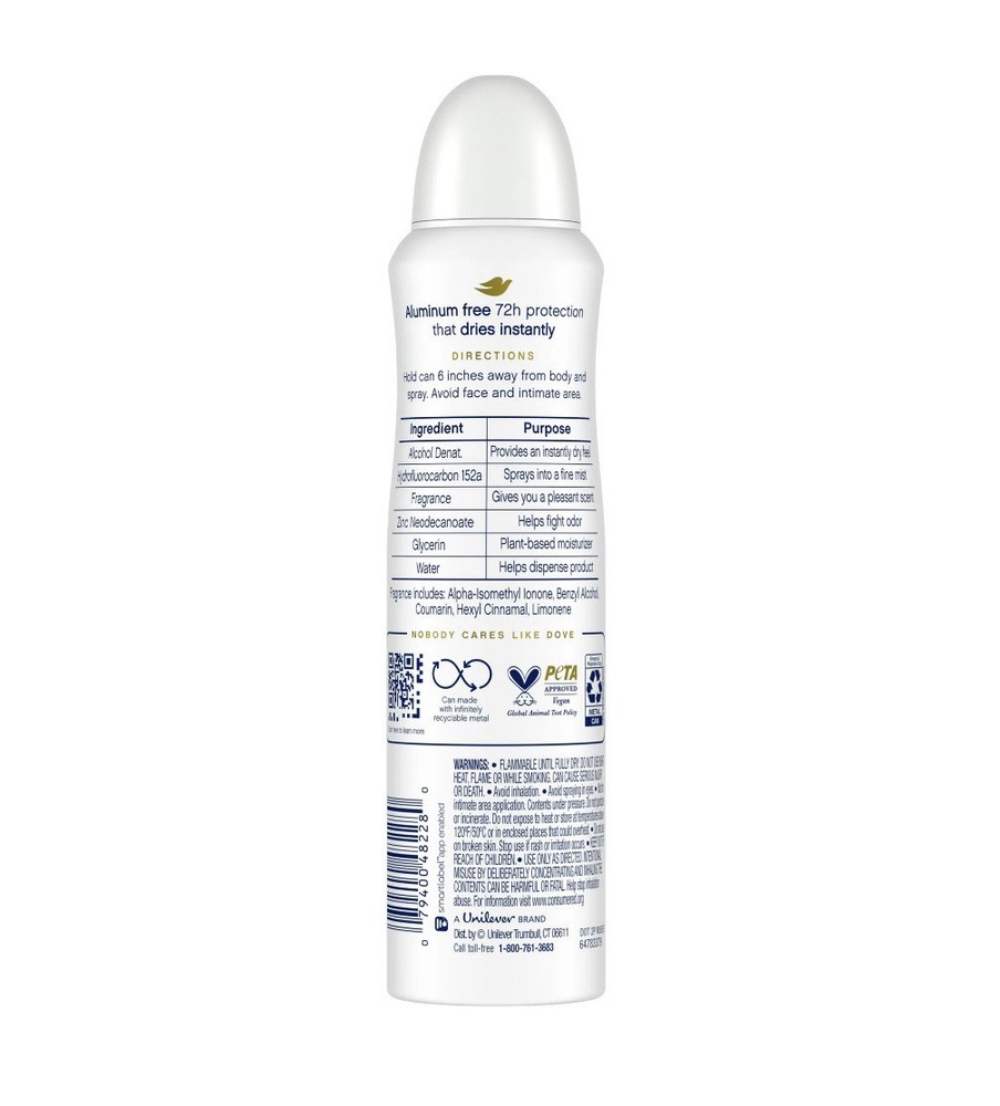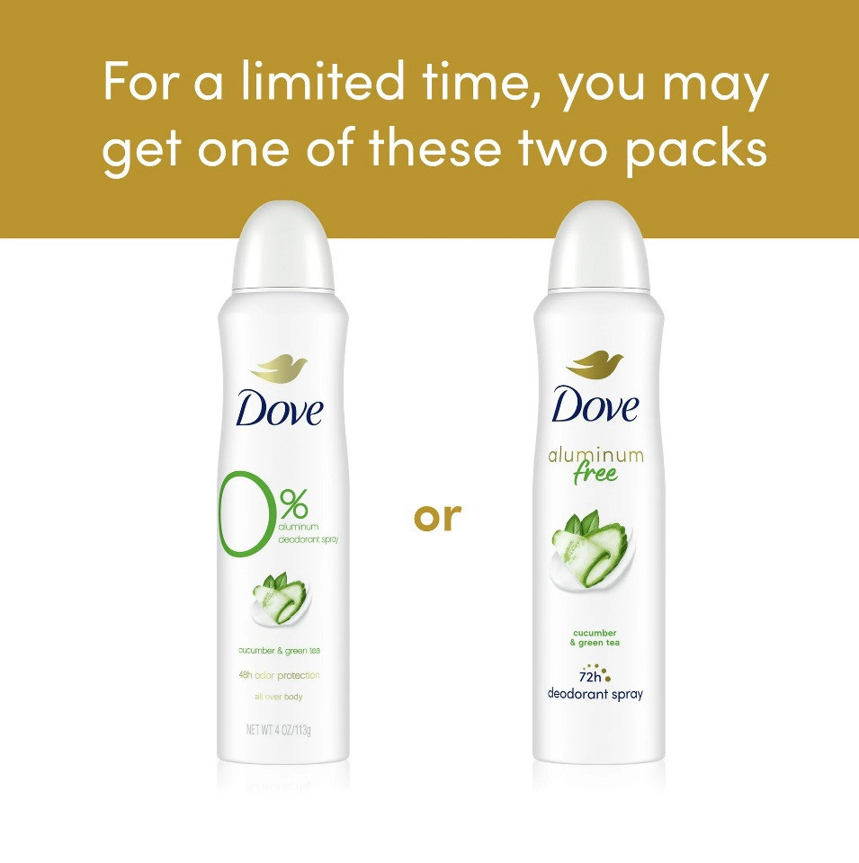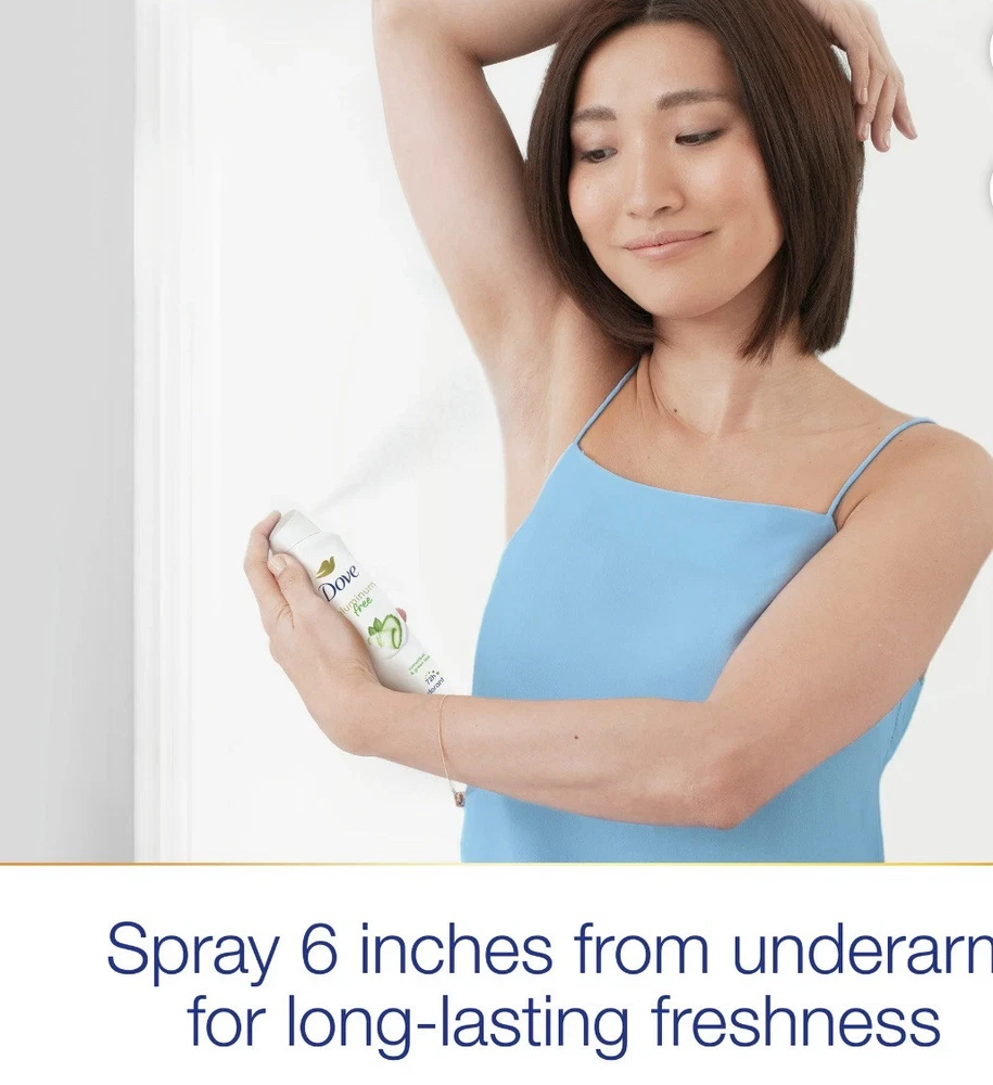 Dove Beauty 0% Aluminum Cucumber & Green Tea 48 Hour Deodorant Spray - 4oz. Dove Deodorant Spray for Women Cucumber & Green Tea Aluminum Free, 4 oz. Your delicate underarm skin deserves the same care you give the rest of your body. Dove 0% Aluminum Deodorant Spray with Cucumber and Green Tea gives long-lasting freshness, gentle underarm care, and superior odor protection day and night. When you spray your deodorant, you want freshness that lasts. This 48-hour deodorant for women protects against odor no matter what the day brings – one spray is enough to keep the worry of odor away. That’s not all – enriched with ¼ moisturizers, this aluminum free deodorant spray also cares for your skin while it protects against odor. Reliable long-lasting freshness will leave you feeling confident and clean – all day long. For adult use. Dove Deodorant Spray for Women Cucumber & Green Tea Aluminum Free, 4 oz EFFECTIVE ODOR PROTECTION: Dove 0% Aluminum Deodorant Spray provides superior 48h odor protection KIND TO SKIN : Dove deodorant spray has a kind-to-skin formula with no aluminum LONG-LASTING FRESHNESS: Aluminum free deodorant formula is infused with a refreshing cucumber and green tea scent CARING FORMULA : Dove Spray deodorant with no aluminum is formulated with ¼ moisturizers for underarm care EASY TO APPLY: Dove 0% Aluminum Deodorant sprays are easy to apply and dry quickly CRUELTY FREE: Globally, Dove deodorant is not tested on animals and is certified cruelty-free by PETA For adult use.