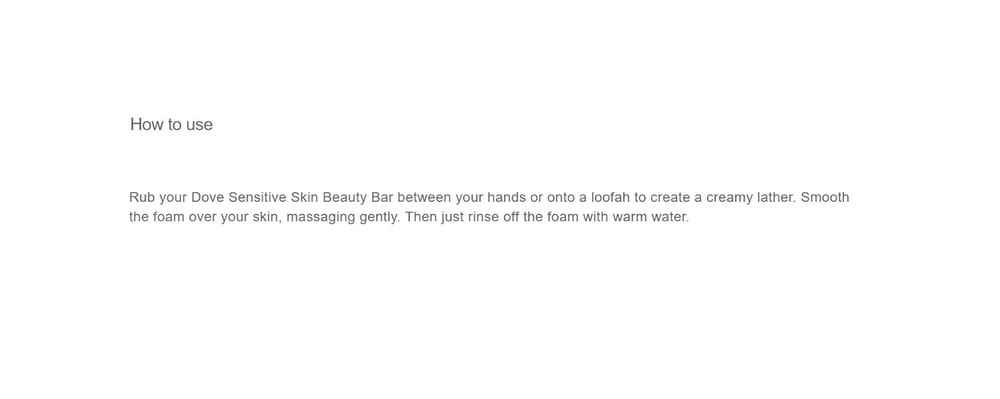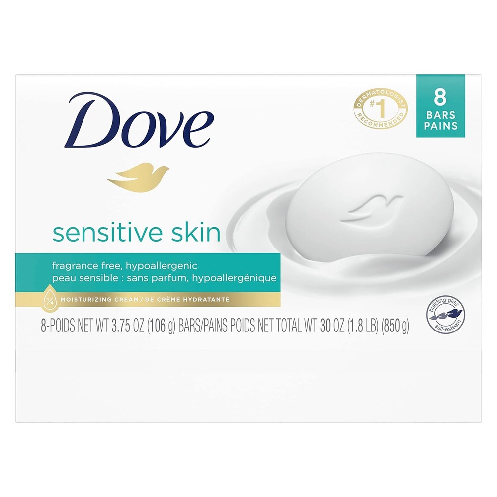 GENTLE ON SENSITIVE SKIN: Nourish your skin with Dove Sensitive Skin Beauty Bar; with its fragrance free and hypoallergenic formula, it gently cleanses for softer skin than ordinary bar soap Number 1 DERMATOLOGIST RECOMMENDED: Formulated with ultra-mild cleansers and 1/4 moisturizing cream, Dove moisturizing Beauty Bar leaves skin instantly soft and smooth with lasting nourishment MILD AND MOISTURIZING: Help maintain your skin’s natural moisture barrier and hydration with this Beauty Bar for women, ideal to use as a gentle face cleanser and body soap for sensitive skin EFFECTIVE CLEANSING: A Beauty Bar that washes away dirt and germs, but won’t dry skin as ordinary bath soap can; this hypoallergenic bar is gentle enough to use every day on your body and your face THOUGHTFULLY MADE: This Beauty Bar contains no sulfate cleansers and is certified Cruelty-Free by PETA, so you can feel good about switching from an ordinary soap bar to a Dove Beauty Bar Product Description Dove Sensitive Skin Beauty Bar combines classic Dove cleansers and 1/4 moisturizing cream in a fragrance free, hypoallergenic bar that's gentle enough for sensitive skin. And now, we are bringing you Dove's same great formula in an all-new look. Dermatologist recommended and suitable for daily use, it can be used as a hand soap, gentle facial cleanser and body soap. Proper sensitive skin care depends on having a cleanser that truly cares for your skin and won't dry it out like an ordinary soap can. Washing with regular soap can cause skin to feel dry and tight. What makes Dove different? It's the combination of gentle cleansers and moisturizing ingredients that help to nourish skin. With unscented, hypoallergenic cleansers and 1/4 moisturizing cream, Dove Beauty Bar can be used as a face cleanser, as well as a gentle cleanser for your body and hands, leaving you with instantly soft skin and lasting nourishment. The secret to beautiful skin is moisture, and no ordinary bar soap hydrates skin better than Dove. At Dove, our vision is of a world where beauty is a source of confidence, not anxiety. From the Manufacturer