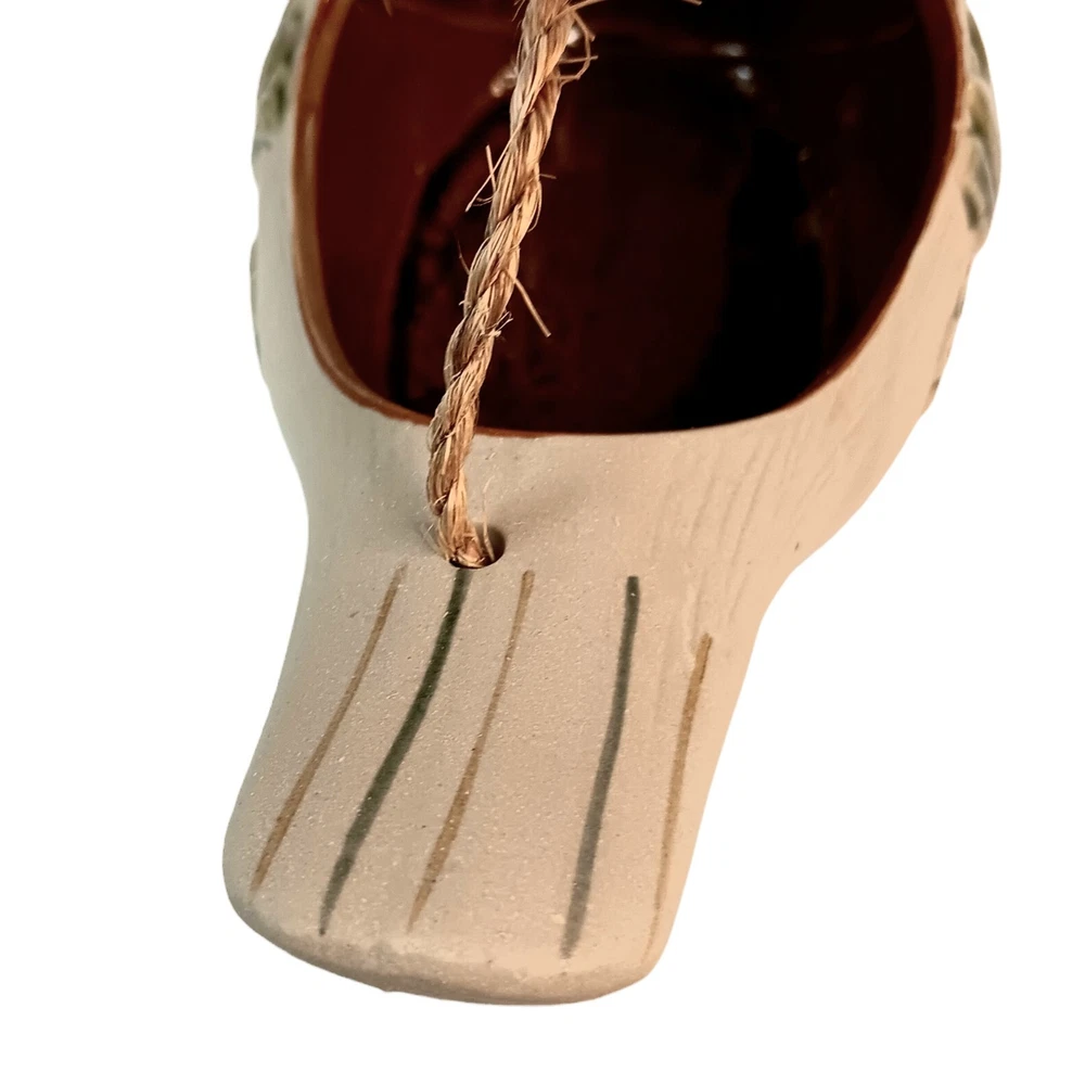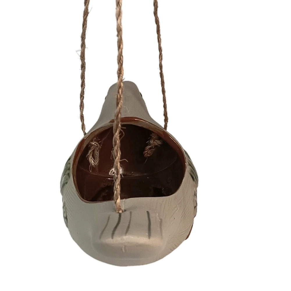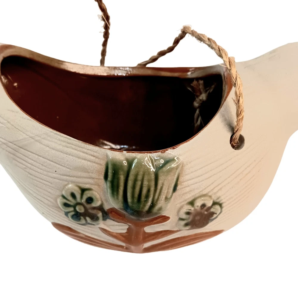 Vintage Dove Bird Ceramic Hanging Planter Pot Pottery Figural Folk Art Earthenware Three holes in the planter with twine for hanging Planter does not have drainage holes Approximately 8" x 4" Excellent condition with wear that is consistent with age. No chips or cracks.