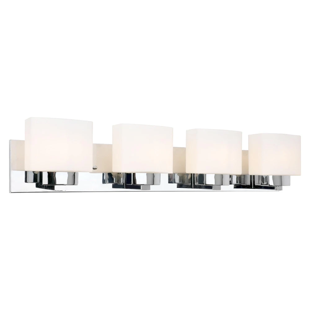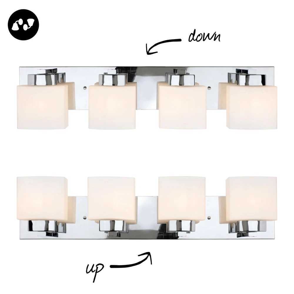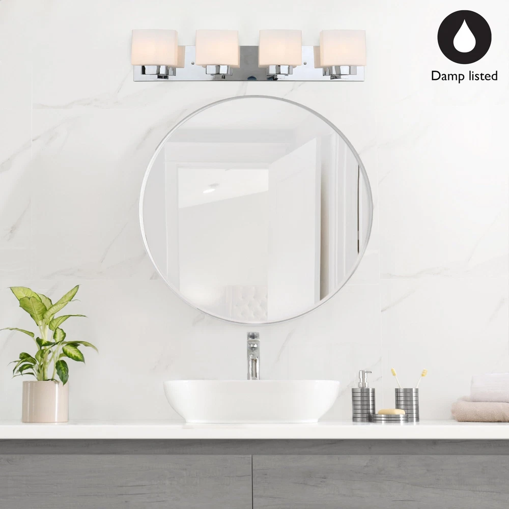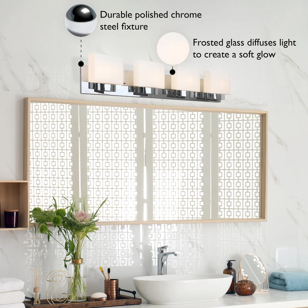 The Dove Creek 4-Light Vanity Light has a rectangular backplate and square shaped glass shades for an updated yet classic look. This renovation-friendly vanity light features a large backplate to minimize paint touchups and drywall repair when replacing an existing vanity light. Constructed of formed steel with a polished chrome finish and frosted glass, this 4-light wall light adds a modern accent to your home. Measuring 6.5-inches (H) by 32-inches (W), this vanity light features steel trim to add elegance in any room or entry way. This fixture uses four maximum 60-watt medium base bulbs (not included). Designed and manufactured by , the trusted source for quality lighting, hardware, plumbing, kitchen, and bath products for every taste and budget. Traditional Style Vanity Light: Stunning polished chrome finish with square frosted glass shades that can be mounted up or down Renovation Friendly: Large rectangular backplate minimizes paint touchups and drywall repairs Four Light Vanity Light: Uses four maximum 60-watt medium base bulbs (not included) Dimmable: Allows you to create the perfect atmosphere when used with a compatible dimmer switch (not included) Sturdy and Durable: Steel construction for long-lasting use; cETL/ETL listed for use in damp locations