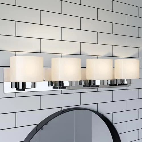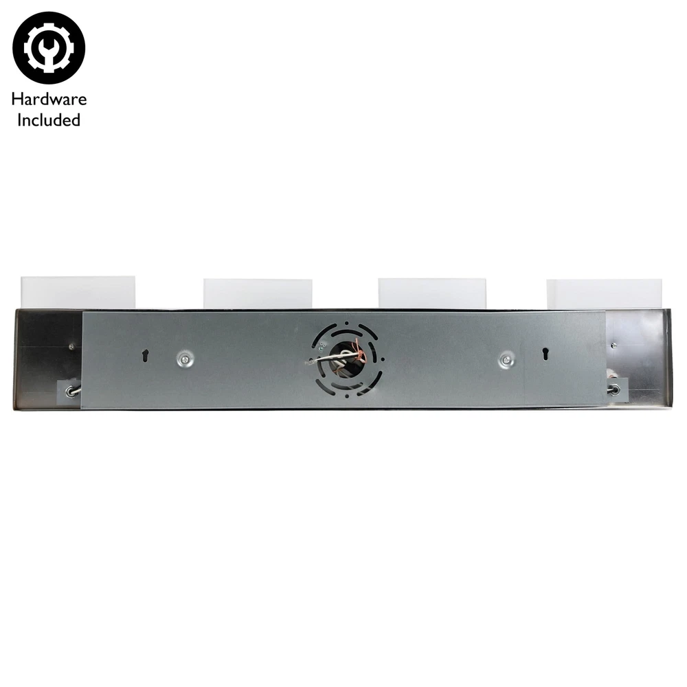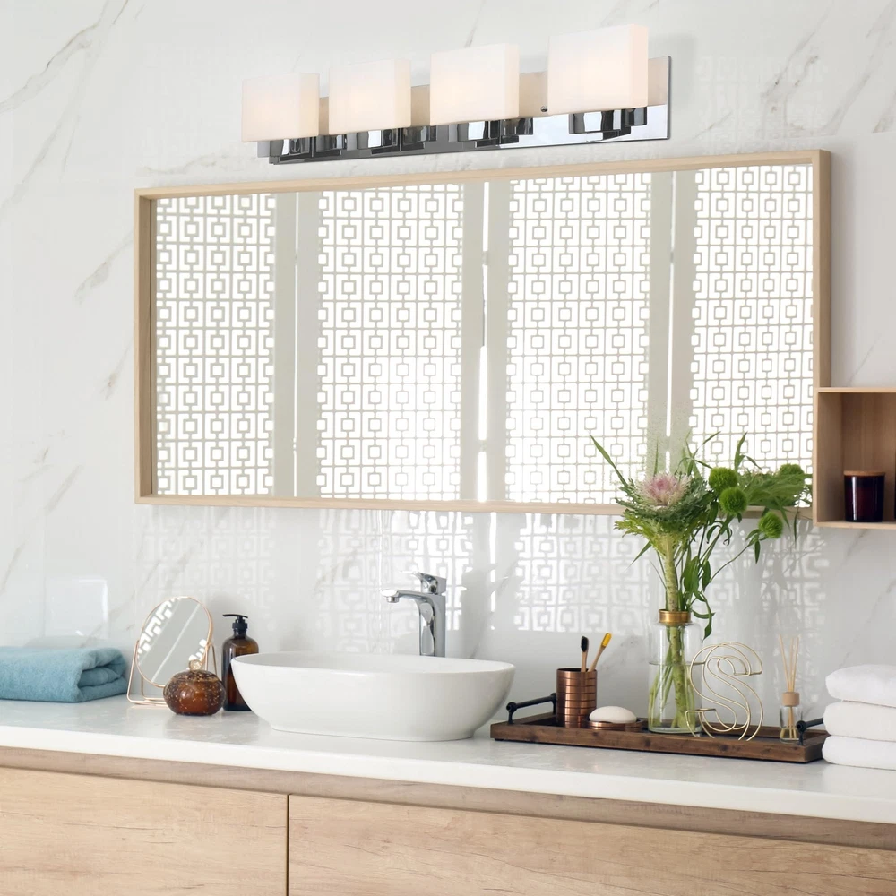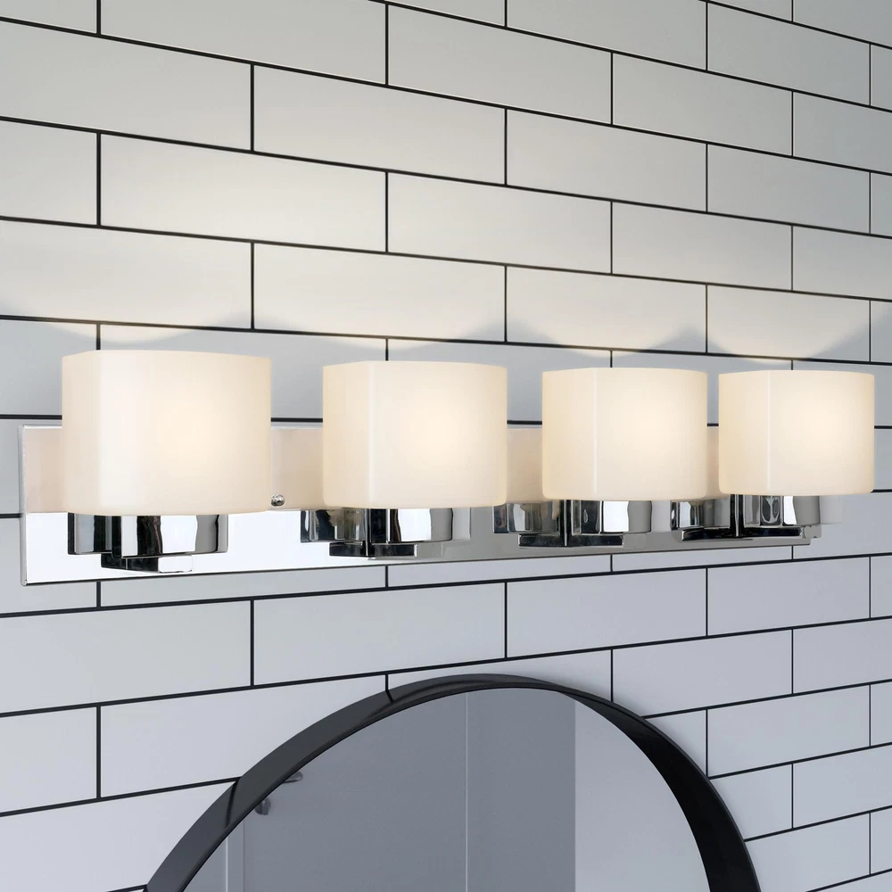 The Dove Creek 4-Light Vanity Light has a rectangular backplate and square shaped glass shades for an updated yet classic look. This renovation-friendly vanity light features a large backplate to minimize paint touchups and drywall repair when replacing an existing vanity light. Constructed of formed steel with a polished chrome finish and frosted glass, this 4-light wall light adds a modern accent to your home. Measuring 6.5-inches (H) by 32-inches (W), this vanity light features steel trim to add elegance in any room or entry way. This fixture uses four maximum 60-watt medium base bulbs (not included). Designed and manufactured by , the trusted source for quality lighting, hardware, plumbing, kitchen, and bath products for every taste and budget. Traditional Style Vanity Light: Stunning polished chrome finish with square frosted glass shades that can be mounted up or down Renovation Friendly: Large rectangular backplate minimizes paint touchups and drywall repairs Four Light Vanity Light: Uses four maximum 60-watt medium base bulbs (not included) Dimmable: Allows you to create the perfect atmosphere when used with a compatible dimmer switch (not included) Sturdy and Durable: Steel construction for long-lasting use; cETL/ETL listed for use in damp locations