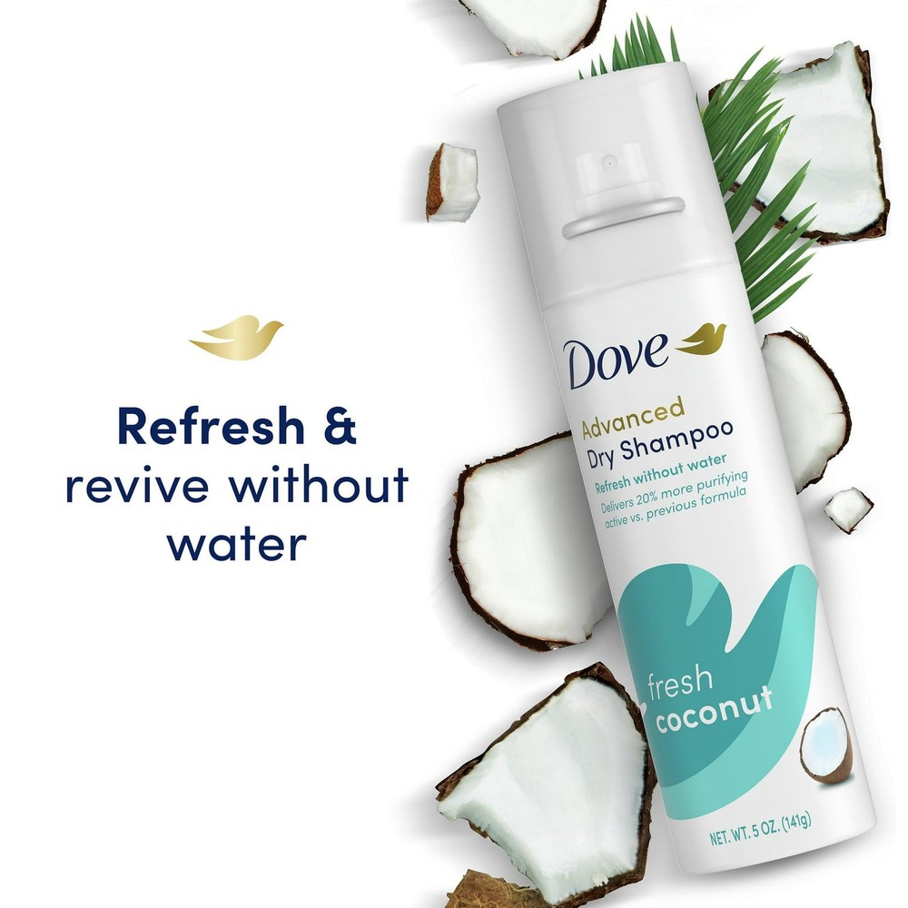 Dove Advanced Dry Shampoo Spray, Fresh Coconut, Absorbs Excess Oil, Refresh Without Water, 5 Ounce (Pack Of 6) Dove Advanced Repairing Dry Shampoo, Fresh Coconut, Need to get ready in a hurry? Pressed for time after a gym session? Whatever the reason, now you can have hair that looks and feels clean without having to wash it using this waterless shampoo spray. Dove Volume Fullness Dry Shampoo Hair Volumizer Spray works with just a few quick sprays and leaves you with hair that is volumized and looks and feels beautiful, healthy and full of body. About this item Dove Advanced Fresh Coconut Dry Shampoo absorbs excess oil to refresh and revive hair between washes, leaving it looking beautiful and soft This dry shampoo features a weightless formula that instantly absorbs oil to rejuvenate hair between washes Dove Advanced Fresh Coconut Dry Shampoo features the light scent of coconut and sweet lime to leave hair smelling fresh and clean Our weightless formula delivers 20% more natural tapioca and actually cleanses greasy hair by removing oil and odor between washes Spritz this waterless dry shampoo at the roots in sections. Massage into roots and brush through hair. For best results, spray this dry shampoo 8-12 inches from hair This dry shampoo spray is the perfect addition to your cruelty-free hair care collection Dry shampoo spray will save you time and ensure you stay confident with the way your hair looks and feels. When you don't have time for a full hair wash with water, Dove volumizing dry shampoo quickly helps to reduce the oily, greasy feel of unwashed hair, leaving it easy to style and manage. Ingredients Isobutane, Propane, SD Alcohol 40-B (Alcohol Denat.), Aluminum Starch Octenylsuccinate, Butane, Fragrance (Parfum), Isopropyl Myristate, Silica, Cocos Nucifera (Coconut) Fruit Extract|Ingredients correct at time of publishing. Always check product packaging.