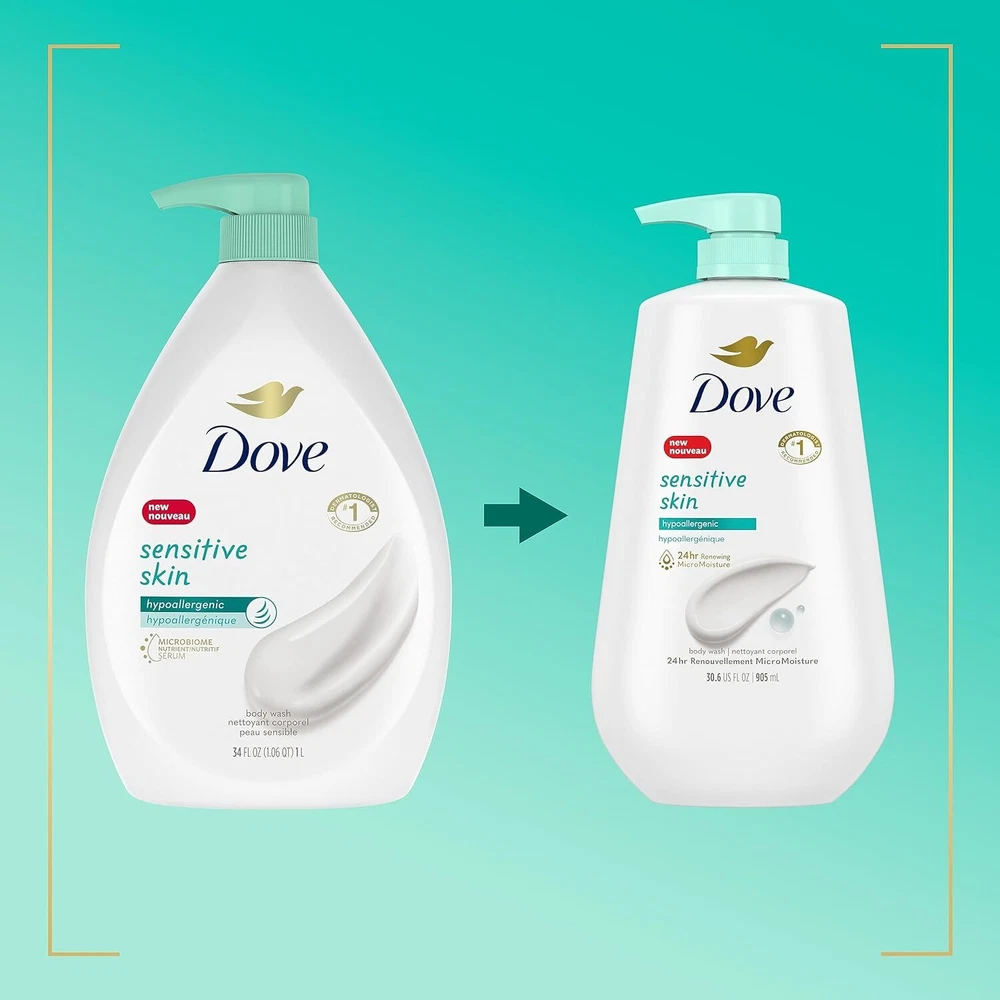 GENTLY CLEANSES: Dove Sensitive Skin Body Wash combines Moisture Renew Blend with our gentlest ingredients to pamper sensitive skin, unlike ordinary body soap or shower gel MILD AND PH-BALANCED: Dove body wash includes Moisture Renew Blend a combination of skin-natural nourishers and plant-based moisturizers that absorb deeply into the top layers of skin #1 DERMATOLOGIST RECOMMENDED BODY WASH: Dove sensitive skin pampers sensitive skin with a rich, luxurious formula, leaving your skin softer than a shower gel THOUGHTFULLY MADE: Our body wash is PETA-certified, cruelty-free and made in 100% recycled bottles, so you can feel good about switching from your everyday shower soap to Dove sulfate free body wash PLANT-BASED MOISTURIZER: With naturally derived cleansers and skin-natural nutrients, this Dove body wash is microbiome gentle, so you’ll get beautifully nourished while maintaining healthy skin CARE AS YOU CLEAN: The cleansing efficacy and skin care you need, all in one product. Dove Body Wash is also effective at cleansing hands Product Description If you have sensitive skin, you know that it needs special care and how much of a relief it is to find a body wash that does just that. Like the Dove Sensitive Skin Body Wash, a fragrance-free, hypoallergenic body wash that is dermatologist recommended and gives you instantly soft skin and lasting nourishment. Made with 100% gentle cleansers, Dove Body Wash is gentle to skin’s microbiome, its living protective layer. It creates a rich lather that moisturizes and replenishes skin while also leaving it cleansed. Dove body wash is also effective at cleansing hands. With naturally derived cleansers and skin-natural nutrients, we care about what goes into our body wash. We are committed to a landmark new initiative as part of our 2025 commitment to reduce plastic waste—reducing over 20,500 metric tons of virgin plastic annually by making the iconic beauty bar packaging plastic-free globally, launching new 100% recycled plastic bottles and trialing a new refillable deodorant format that radically reduces plastic use. As one of the largest beauty brands in the world, we are revealing an agenda-setting commitment to tackle the global beauty industry’s plastic waste issue. Brand Story By Dove