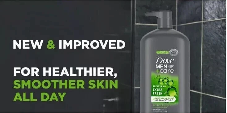 DESCRIPTION: Men's Skin Is 25% Thicker And Contains Higher Levels Of Protein. That Means More Sweat, Lower Hydration Levels, And Easily Irritated Skin. So, Forget About Harsh Soaps. Try Dove Men+care Extra Fresh Body And Face Wash To Your Men's Skin Care And Shower Routine! This Body Wash For Men Is Specifically Designed For Men's Skin By The #1 Dermatologist Recommended Men's Brand Since 2013. Typical Soap For Men Strips Away Oil And Other Essential Skin Components Leaving You With Dry, Flaky, And Irritated Skin. Dove Men+care Is A Mild Cleanser With Plant-based Moisturizers And Skin-strengthening Nutrients To Help Rebuild Skin And Skin Proteins. Dove Men+care Body And Face Wash Is An Easy-to-rinse, Hydrating Body Wash That Is Clinically Proven To Fight Dry Skin Better Than A Regular Men's Body Soap Or Shower Gel. It Is Also Gentle Enough To Use As A Face Wash For Men. Extra Fresh Has A Clean, Crisp Scent That Will Leave You Feeling Fresh. It's Also Just As Effective For Cleansing Hands. For Best Use, Squeeze Dove Men+care Body And Face Wash On To Your Palm And Rub Your Hands Together To Work The Shower Gel Into A Light Foam To Activate The Micromoisture Technology. Apply To Your Body And Face. Rinse Thoroughly. Dove Men+care Champion Active Fathers And The Need For Paid Paternity Leave. Find Out More About Their Work In Celebrating Fatherhood And Raising Awareness Around Parental Leave On The Dove Men+care Site. And As Part Of Our Commitment Towards Sustainability, Each Dove Men+care Body And Face Wash Bottle Is Recyclable And Made With 100% Recycled Plastic And Is Peta Certified Cruelty Free. FEATURES: REBUILDS AND STRENGTHENS SKIN: Dove Men+Care Extra Fresh face and body wash is made with plant-based cleansers and skin-strengthening nutrients for healthier, smoother skin FROM THE #1 DERMATOLOGIST RECOMMENDED MEN’S BRAND: This face and body wash washes away without leaving residue on your skin. It’s also an effective cleanser for hands MICROMOISTURE TECHNOLOGY: The only face and body wash powered by MicroMoisture Technology, which activates on skin and is clinically proven to fight dry skin better than regular body and face wash NEW FORMULA: Dove Men+Care Extra Fresh Body and Face Wash was developed for men’s skin. Our body wash features MicroMoisture Technology, plant-based cleansers, and skin-strengthening nutrients