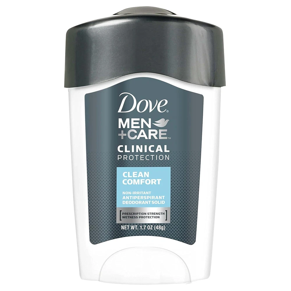 Product Description Dove Men+Care Clinical Protection Antiperspirant & Deodorant Stick, Sweat and Odor Protection, Clean Comfort, 1.7 Ounce (Pack Of 4) Dove Men+Care Clinical Protection Clean Comfort Antiperspirant Stick gives you 96h sweat protection while caring for sensitive skin. This antiperspirant stick is formulated with 1/4 Moisturizing Cream to help retain skin moisture and help protect against irritation for more comfortable underarms. This Clinical Strength antiperspirant features a long-lasting subtle fragrance to keep you feeling fresh and confident all day. Simply apply this clinical strength antiperspirant in an even layer onto each of your underarms to help soothe and protect your underarms from sweat and odor for lasting confidence around the clock. POWERFUL CLINICAL PROTECTION: Dove Men+Care Clinical Protection Clean Comfort Antiperspirant Stick gives you 96h sweat protection while caring for sensitive skin. NON-IRRITANT FORMULA: This Antiperspirant stick is formulated with 1/4 Moisturizing Cream to help retain skin moisture and help protect against irritation for more comfortable underarms. LONG LASTING FRAGRANCE: Dove Men+Care Clinical Protection Clean Comfort Antiperspirant Stick features a long-lasting subtle fragrance to keep you feeling fresh and confident all day. HOW TO USE: Apply this Clinical Strength Antiperspirant Stick on your underarms. CARE FOR THE PLANET: Each Dove Men+Care antiperspirant stick can be recycled. Follow the How2Recycle instructions on the back. Dove Men+Care antiperspirants are PETA-certified Cruelty-Free. CLEAN COMFORT RANGE: Try the full range of Dove Men+Care products, including antiperspirant deodorants, dry spray antiperspirant deodorants, face and body bars, and other hair and skin care products.. Ingredients Active Ingredient: Aluminum Zirconium Tetrachlorohydrex GLY (20.0%);Inactive Ingredients: Cyclopentasiloxane, Dimethicone, Paraffin, Microcrystalline Wax, Fragrance (Parfum), Silica, Helianthus Annuus (Sunflower) Seed Oil, Dimethicone Crosspolmer, BHT.