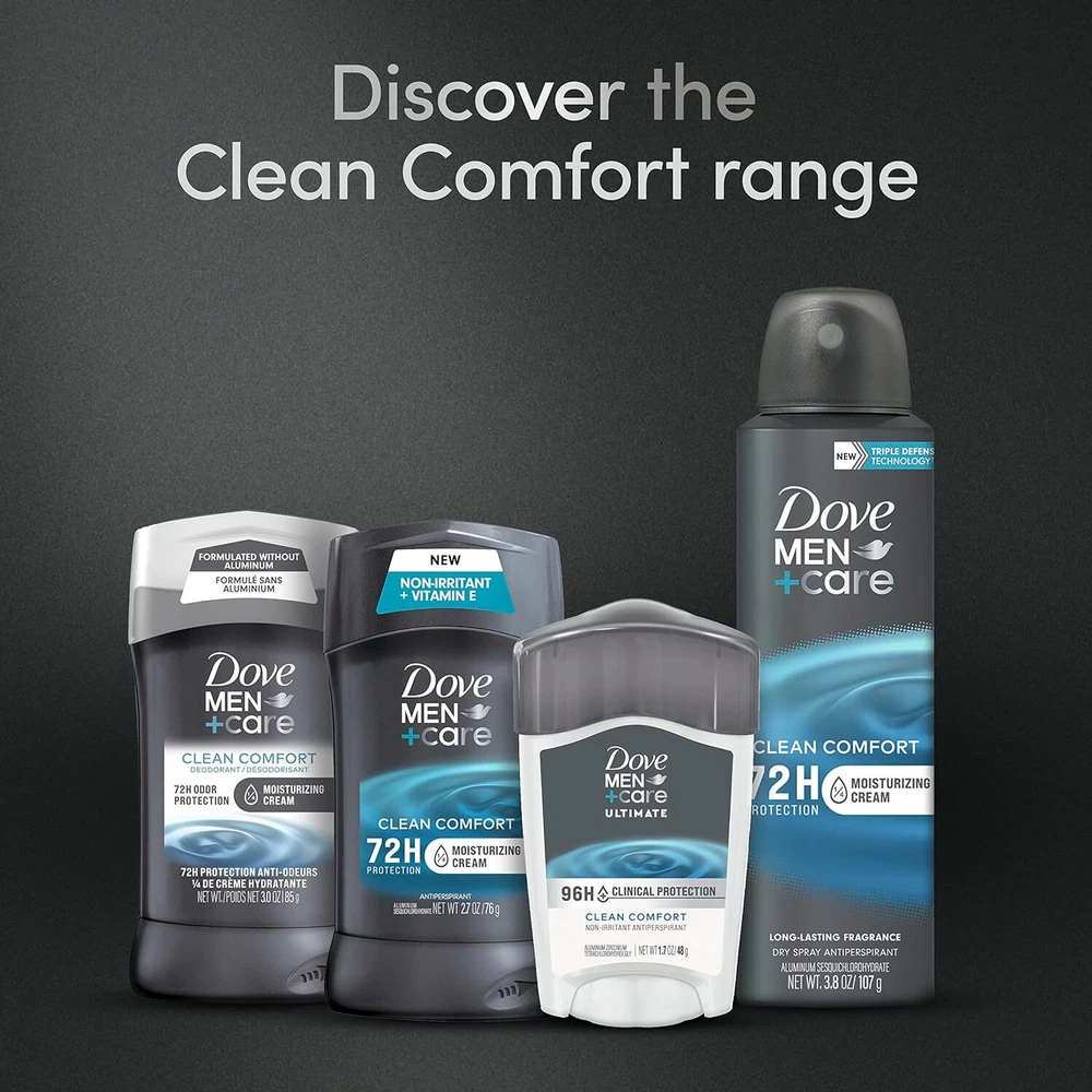 Product Description Dove Men+Care Clinical Protection Antiperspirant & Deodorant Stick, Sweat and Odor Protection, Clean Comfort, 1.7 Ounce (Pack Of 5) Dove Men+Care Clinical Protection Clean Comfort Antiperspirant Stick gives you 96h sweat protection while caring for sensitive skin. This antiperspirant stick is formulated with 1/4 Moisturizing Cream to help retain skin moisture and help protect against irritation for more comfortable underarms. This Clinical Strength antiperspirant features a long-lasting subtle fragrance to keep you feeling fresh and confident all day. Simply apply this clinical strength antiperspirant in an even layer onto each of your underarms to help soothe and protect your underarms from sweat and odor for lasting confidence around the clock. POWERFUL CLINICAL PROTECTION: Dove Men+Care Clinical Protection Clean Comfort Antiperspirant Stick gives you 96h sweat protection while caring for sensitive skin. NON-IRRITANT FORMULA: This Antiperspirant stick is formulated with 1/4 Moisturizing Cream to help retain skin moisture and help protect against irritation for more comfortable underarms. LONG LASTING FRAGRANCE: Dove Men+Care Clinical Protection Clean Comfort Antiperspirant Stick features a long-lasting subtle fragrance to keep you feeling fresh and confident all day. HOW TO USE: Apply this Clinical Strength Antiperspirant Stick on your underarms. CARE FOR THE PLANET: Each Dove Men+Care antiperspirant stick can be recycled. Follow the How2Recycle instructions on the back. Dove Men+Care antiperspirants are PETA-certified Cruelty-Free. CLEAN COMFORT RANGE: Try the full range of Dove Men+Care products, including antiperspirant deodorants, dry spray antiperspirant deodorants, face and body bars, and other hair and skin care products.. Ingredients Active Ingredient: Aluminum Zirconium Tetrachlorohydrex GLY (20.0%);Inactive Ingredients: Cyclopentasiloxane, Dimethicone, Paraffin, Microcrystalline Wax, Fragrance (Parfum), Silica, Helianthus Annuus (Sunflower) Seed Oil, Dimethicone Crosspolmer, BHT.