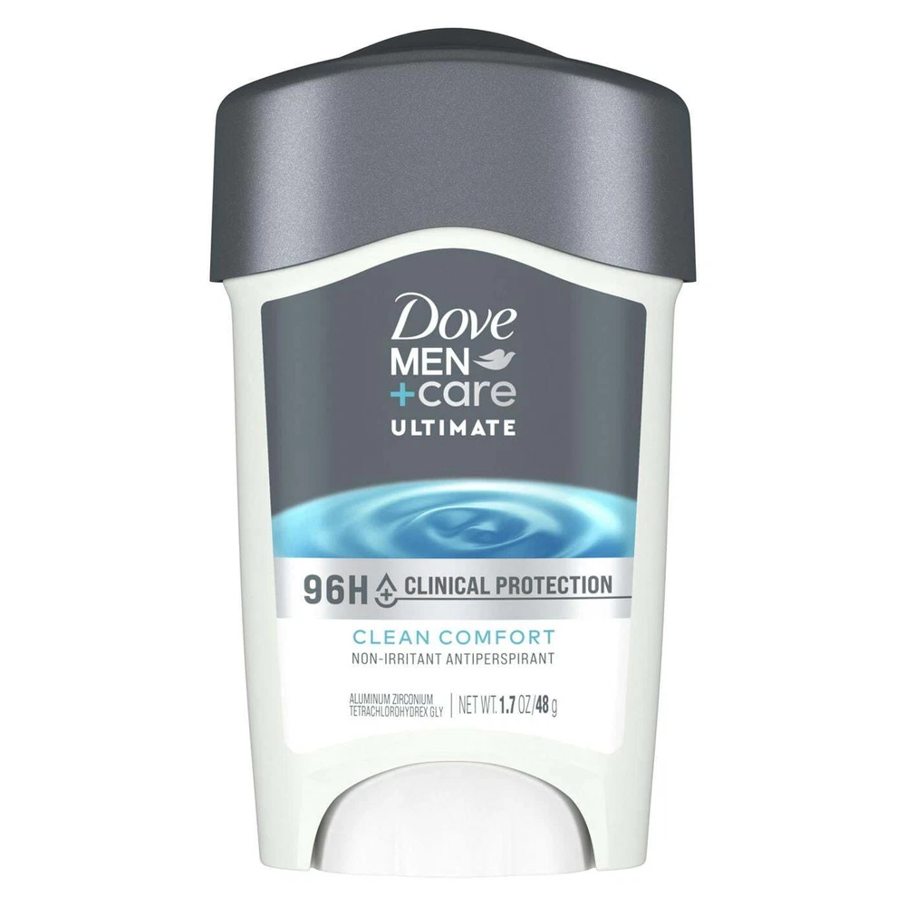 Product Description Dove Men+Care Clinical Protection Antiperspirant & Deodorant Stick, Sweat and Odor Protection, Clean Comfort, 1.7 Ounce (Pack Of 8) Dove Men+Care Clinical Protection Clean Comfort Antiperspirant Stick gives you 96h sweat protection while caring for sensitive skin. This antiperspirant stick is formulated with 1/4 Moisturizing Cream to help retain skin moisture and help protect against irritation for more comfortable underarms. This Clinical Strength antiperspirant features a long-lasting subtle fragrance to keep you feeling fresh and confident all day. Simply apply this clinical strength antiperspirant in an even layer onto each of your underarms to help soothe and protect your underarms from sweat and odor for lasting confidence around the clock. POWERFUL CLINICAL PROTECTION: Dove Men+Care Clinical Protection Clean Comfort Antiperspirant Stick gives you 96h sweat protection while caring for sensitive skin. NON-IRRITANT FORMULA: This Antiperspirant stick is formulated with 1/4 Moisturizing Cream to help retain skin moisture and help protect against irritation for more comfortable underarms. LONG LASTING FRAGRANCE: Dove Men+Care Clinical Protection Clean Comfort Antiperspirant Stick features a long-lasting subtle fragrance to keep you feeling fresh and confident all day. HOW TO USE: Apply this Clinical Strength Antiperspirant Stick on your underarms. CARE FOR THE PLANET: Each Dove Men+Care antiperspirant stick can be recycled. Follow the How2Recycle instructions on the back. Dove Men+Care antiperspirants are PETA-certified Cruelty-Free. CLEAN COMFORT RANGE: Try the full range of Dove Men+Care products, including antiperspirant deodorants, dry spray antiperspirant deodorants, face and body bars, and other hair and skin care products.. Ingredients Active Ingredient: Aluminum Zirconium Tetrachlorohydrex GLY (20.0%);Inactive Ingredients: Cyclopentasiloxane, Dimethicone, Paraffin, Microcrystalline Wax, Fragrance (Parfum), Silica, Helianthus Annuus (Sunflower) Seed Oil, Dimethicone Crosspolmer, BHT.