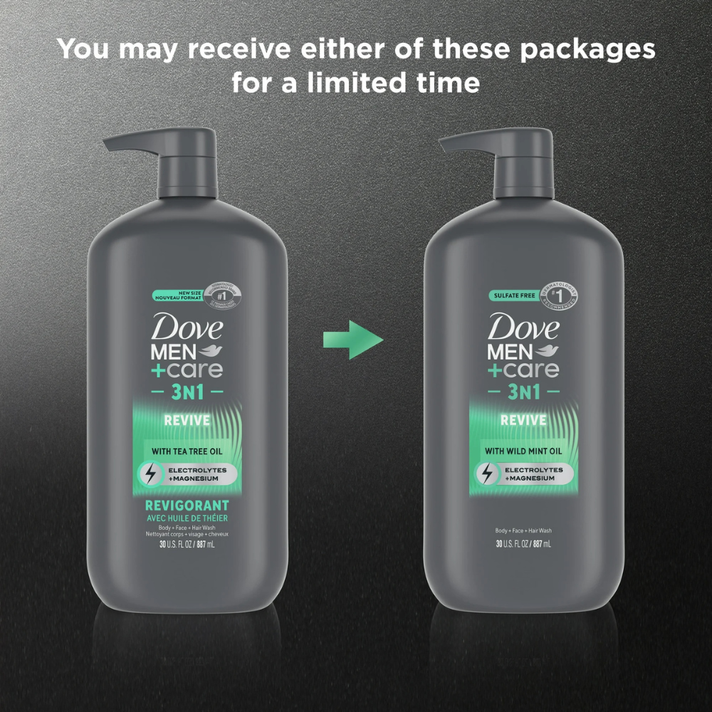Dove Men+Care Invigorating Revive 3-in-1 Body Face & Hair Wash for Men, 30 oz NEW Dove Men+Care Invigorating Revive 3-in-1 Body Face & Hair Wash for Men All Skin, 30 oz. Get healthier, smoother feeling skin all day with Dove Men+Care invigorating Revive 3N1 with Tea Tree body and face wash. With the fresh & warm scent of earthy tea tree and masculine sandalwood, this body wash will soothe your senses and nourish your skin. It has plant-based ingredients and nutrients for healthier, smoother skin all day. Our body wash is paraben-free and is made with plant-based moisturizers to transform even the driest skin in just one shower. Squeeze a generous amount of Dove Men+Care body wash for men into your palms. Massage the hydrating body wash onto your skin, taking a moment to enjoy the rich lather before rinsing off. Dove Men+Care Invigorating Revive 3-in-1 Body Face & Hair Wash for Men All Skin, 30 oz FOR HEALTHIER, SMOOTHER FEELING SKIN ALL DAY: Dove Men+Care Revive 3N1 men's body and face wash hydrates your skin to keep it feeling healthy and smooth all day. MICROMOISTURE TECHNOLOGY: This Revive 3N1 men's body wash contains 24-hour nourishing micromoisture that continuously nourishes your skin throughout the day. FRESH & WARM SCENT: This body and face wash for men features a fresh and warm scent of earthy tea tree and masculine sandalwood that leaves you feeling refreshed and re-energized. #1 DERMATOLOGIST RECOMMENDED BRAND: Our moisturizing body wash is made with hydrators from lotion and plant-based moisturizers to transform even the driest skin in just one shower. HOW TO USE: Squeeze a generous amount of body wash into your palms. Lather and massage the hydrating body wash onto your skin, taking a moment to enjoy the nourishing formula before rinsing off. MADE WITH CARE: Dove Men+Care invigorating Revive 3N1 with Tea Tree body wash is certified cruelty-free by PETA and made in 100% recycled plastic bottles. For adult use. Shipping Policy FREE SHIPPING in all orders! Orders are usually processed and shipped out after 72 HOURS during BUSINESS DAYS (Monday to Friday) after payment has been received. But please be reminded that we are NOT processing and shipping orders during WEEKENDS and HOLIDAYS. Please make sure your ADDRESS is VALID for both UPS and USPS COURIER SERVICES. Please be reminded that costs incurred due to INCORRECT or UNDELIVERABLE ADDRESS should be shouldered by the buyer. The shipping services that we use are UPS, FedEx, USPS etc. We ONLY ship to the 48 STATES, NO APO/FPO ADDRESSES or PO BOXES. We DO NOT ship to warehouse, freight company. Local pickups and combined shipping options are NOT provided at this time. Return Policy DOMESTIC RETURN ACCEPTED - 30 DAYS. Contact us for more information. Payment Policy We accept payment by any of the following methods: PayPal Items can be returned for exchange or full refund WITHIN 30 DAYS from the date you receive your merchandise. We are not responsible for any purchase after this 30-day period. Feedback & Contact Us Customer satisfaction is very important to us. If you have any problem with your order, please contact us and we will do our best to make you satisfied. If you have any queries, please contact us via Ebay. We usually respond within 24 hours on weekdays. Thank you for shopping at our store.