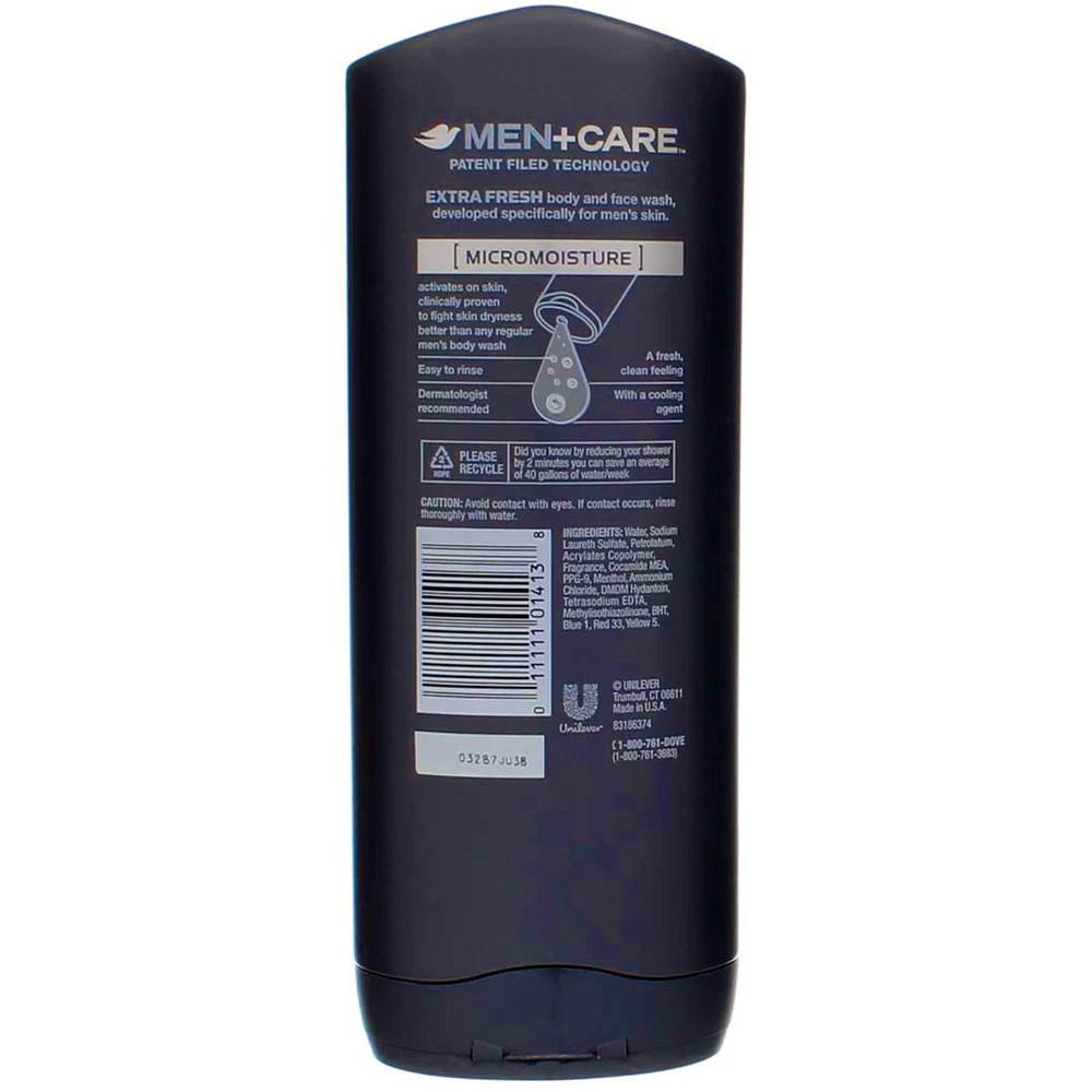 Product Description For a refreshing clean that leaves skin feeling healthy and hydrated, add Dove Men+Care Extra Fresh Body and Face Wash to your shower regimen. Uniquely formulated for men’s skin by the #1 Dermatologist Recommended brand, this men’s body wash with micromoisture technology hydrates for healthier, stronger skin and is clinically proven to fight dry skin better than regular men’s body wash. The ultra-light formula activates when lathering, helping to hydrate skin and protect it against dryness and leaving a clean, crisp scent. With an effective, easy-to-rinse formula, this men’s shower gel delivers extra refreshment and total skin comfort and is hypoallergenic, noncomedogenic, and gentle enough to use on your face. Specifically designed for men’s skin, this Dove Men+Care body wash helps to lock in your skin’s natural moisture and leaves your skin feeling clean, hydrated, healthy and protected against dryness. Part of the Dove Men+Care Extra Fresh range, it contains menthol to deliver cooling refreshment to your face and body and provide a refreshing start to the day. To start your shower with long-lasting freshness, choose Dove Men+Care Extra Fresh Body and Face Wash. Ingredients Water, Sodium Laureth Sulfate, Petrolatum, Acrylates Copolymer, Fragrance, Cocamide MEA, PPG-9, Menthol, Ammonium Chloride, DMDM Hydantoin, Tetrasodium EDTA, Methylisothiazolinone, BHT, Blue 1, Red 33, Yellow 5. Instructions Please recycle. Product Description For a refreshing clean that leaves skin feeling healthy and hydrated, add Dove Men+Care Extra Fresh Body and Face Wash to your shower regimen. Uniquely formulated for men‚Äôs skin by the #1 Dermatologist Recommended brand, this men‚Äôs body wash with micromoisture technology hydrates for healthier, stronger skin and is clinically proven to fight dry skin better than regular men‚Äôs body wash. The ultra-light formula activates when lathering, helping to hydrate skin and protect it against dryness and leaving a clean, crisp scent. With an effective, easy-to-rinse formula, this men‚Äôs shower gel delivers extra refreshment and total skin comfort and is hypoallergenic, noncomedogenic, and gentle enough to use on your face. Specifically designed for men‚Äôs skin, this Dove Men+Care body wash helps to lock in your skin‚Äôs natural moisture and leaves your skin feeling clean, hydrated, healthy and protected against dryness. Part of the Dove Men+Care Extra Fresh range, it contains menthol to deliver cooling refreshment to your face and body and provide a refreshing start to the day. To start your shower with long-lasting freshness, choose Dove Men+Care Extra Fresh Body and Face Wash. Ingredients Water, Sodium Laureth Sulfate, Petrolatum, Acrylates Copolymer, Fragrance, Cocamide MEA, PPG-9, Menthol, Ammonium Chloride, DMDM Hydantoin, Tetrasodium EDTA, Methylisothiazolinone, BHT, Blue 1, Red 33, Yellow 5. Instructions Please recycle. Warnings Safety Warning: Avoid contact with eyes. If contact occurs, rinse thoroughly with water. Disclaimer The product descriptions and instructions provided by Vitabox are for informational purposes only and are qualified in their entirety by the information available from manufacturers of the products. You should carefully read all product packaging, and contact the manufacturer with any questions before using a product. While we endeavor to ensure that product descriptions are current, manufacturers sometimes change their products. We are not liable for inaccuracies or misstatements about products. We do not provide medical advice or recommendations. You should not use the information provided by Vitabox for diagnosing or treating a health problem or disease. If you have or suspect that you have a medical problem, immediately contact your health care provider. Information and statements regarding dietary supplements have not been evaluated by the Food and Drug Administration or any other government agency and are not intended to diagnose, treat, cure, or prevent any disease.