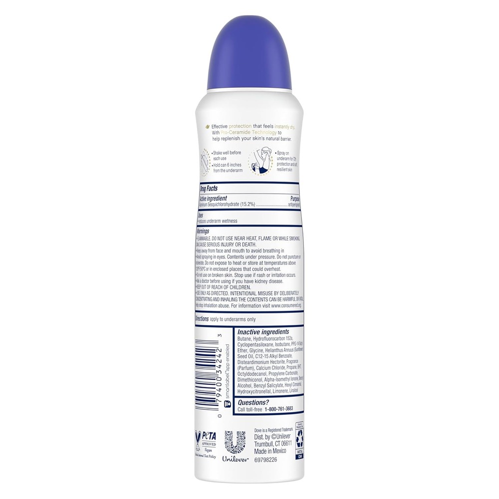 Dove Dry Spray Antiperspirant Deodorant Nourished Beauty 3.8 oz (12 Pack) Dove Advanced Care Long Lasting Women's Antiperspirant Deodorant Dry Spray Floral, the everyday essential that helps repair your skin barrier after shaving with every use. Indulge in the crisp apple, zesty citrus and soft powder fragrance in this antiperspirant, which refresh and soothe your senses as you go about your day. Did you know that when you shave About this item Dove Advanced Care Nourished Beauty Antiperspirant Deodorant Spray for beautifully soft, resilient skin 72-hour antiperspirant deodorant with sweat protection and underarm odor control CARING FORMULA: Featuring Pro-Ceramide Technology Antiperspirant deodorant spray that helps skin barrier repair, recover and improve from shaving Antiperspirant infused with a crisp apple and zesty citrus scent PETA Approved Vegan, alcohol-free antiperspirant All Day Protection: Provides long-lasting protection from sweat and odor Nourishing Formula: Contains moisturizing ingredients to leave skin feeling soft Fresh Scent: Light, refreshing fragrance leaves skin smelling clean Spray Application: Easy to apply with a quick, light mist Suitable for All Skin Types: Gentle formula is formulated for sensitive skin Ingredients Active ingredient: Aluminum Chlorohydrate (20.2%). Inactive ingredients: Butane, Hydrofluorocarbon 152a, Cyclopentasiloxane, Isobutane, PPG-14 Butyl Ether, Fragrance (Parfum), Helianthus Annus (Sunflower) Seed Oil, Disteardimonium Hectorite, C12-15 Alkyl Benxoate, Propane, BHT, Octyldodecanol, Propylene Carbonate, Dimethiconol, Tocopheryl acetate