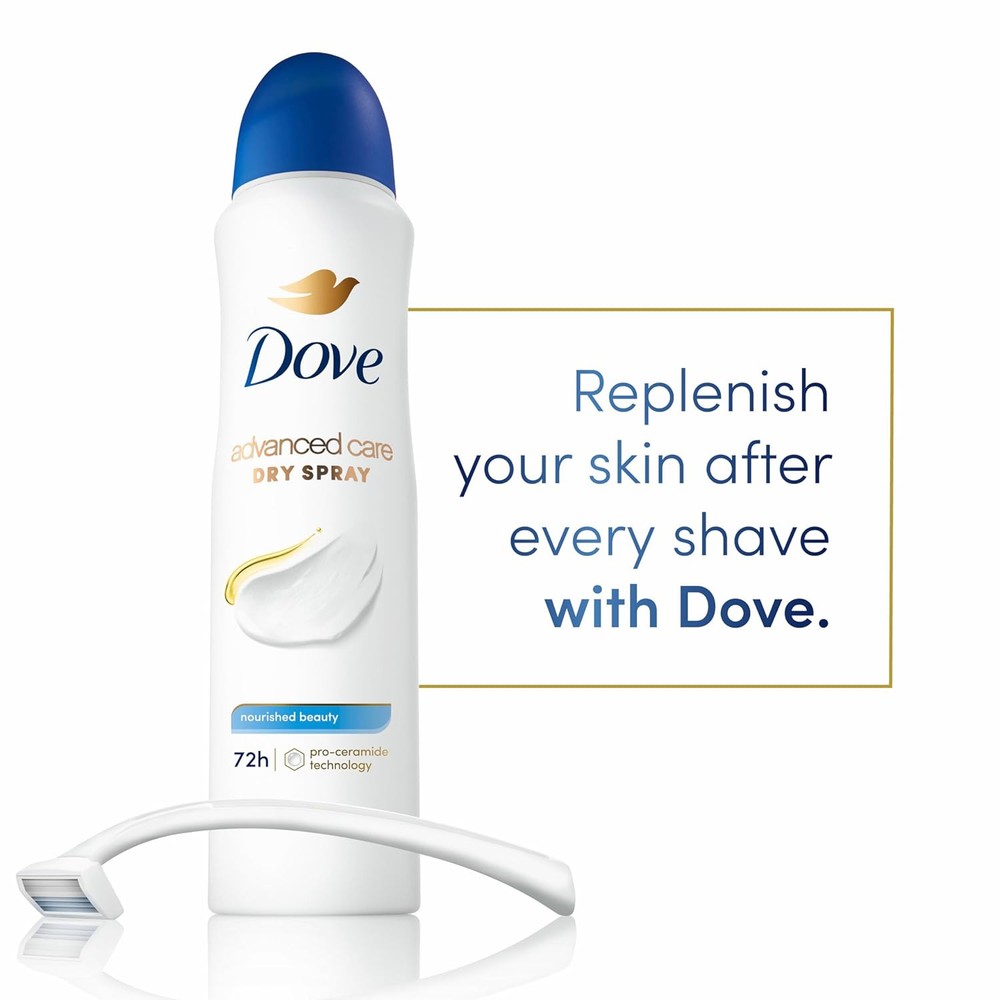 Dove Dry Spray Antiperspirant Deodorant Nourished Beauty 3.8 oz (6 Pack) Dove Advanced Care Long Lasting Women's Antiperspirant Deodorant Dry Spray Floral, the everyday essential that helps repair your skin barrier after shaving with every use. Indulge in the crisp apple, zesty citrus and soft powder fragrance in this antiperspirant, which refresh and soothe your senses as you go about your day. Did you know that when you shave About this item Dove Advanced Care Nourished Beauty Antiperspirant Deodorant Spray for beautifully soft, resilient skin 72-hour antiperspirant deodorant with sweat protection and underarm odor control CARING FORMULA: Featuring Pro-Ceramide Technology Antiperspirant deodorant spray that helps skin barrier repair, recover and improve from shaving Antiperspirant infused with a crisp apple and zesty citrus scent PETA Approved Vegan, alcohol-free antiperspirant All Day Protection: Provides long-lasting protection from sweat and odor Nourishing Formula: Contains moisturizing ingredients to leave skin feeling soft Fresh Scent: Light, refreshing fragrance leaves skin smelling clean Spray Application: Easy to apply with a quick, light mist Suitable for All Skin Types: Gentle formula is formulated for sensitive skin Ingredients Active ingredient: Aluminum Chlorohydrate (20.2%). Inactive ingredients: Butane, Hydrofluorocarbon 152a, Cyclopentasiloxane, Isobutane, PPG-14 Butyl Ether, Fragrance (Parfum), Helianthus Annus (Sunflower) Seed Oil, Disteardimonium Hectorite, C12-15 Alkyl Benxoate, Propane, BHT, Octyldodecanol, Propylene Carbonate, Dimethiconol, Tocopheryl acetate
