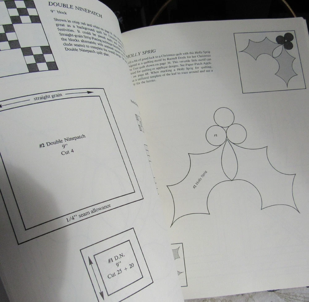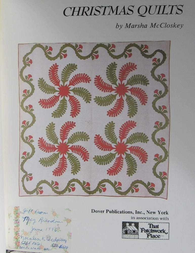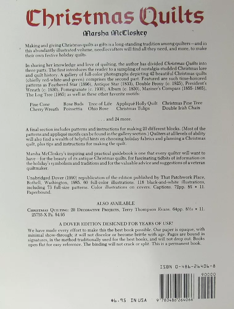 Dover Needlework CHRISTMAS QUILTS Marsha McCloskey Applique Pieced Pattern Book Dover Needlework CHRISTMAS QUILTS Marsha McCloskey Applique Pieced Pattern Book CHRISTMAS QUILTS by Marsha McCloskey Dover Needlework Series Publication 1990 edition (original © 1985) A Collection of Patchwork & Applique Holiday Designs Book is softcover, 72 pages Full size templates are printed directly in book Pre-Owned condition, has some wear and evidence of use There is a name label inside the front cover Free Shipping via Media Mail Post SAME or NEXT DAY SHIPPING Listing and template services provided by inkFrog
