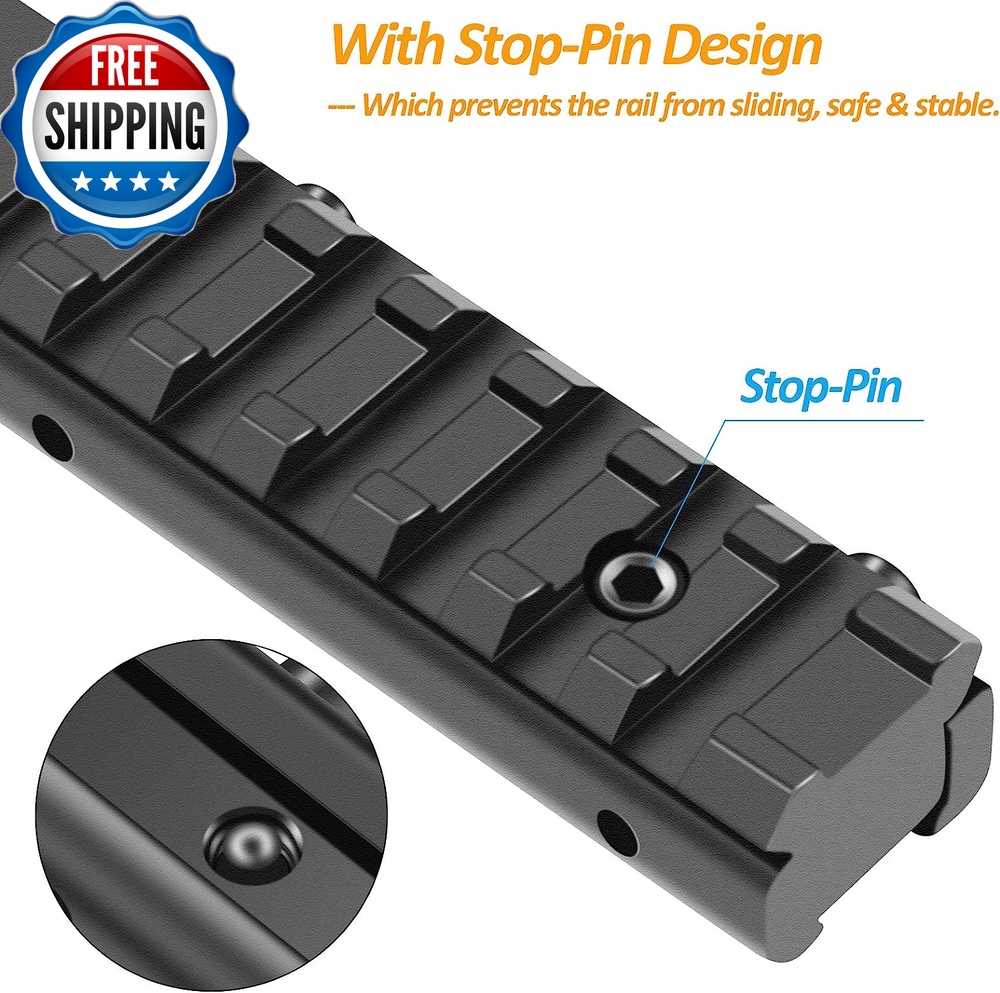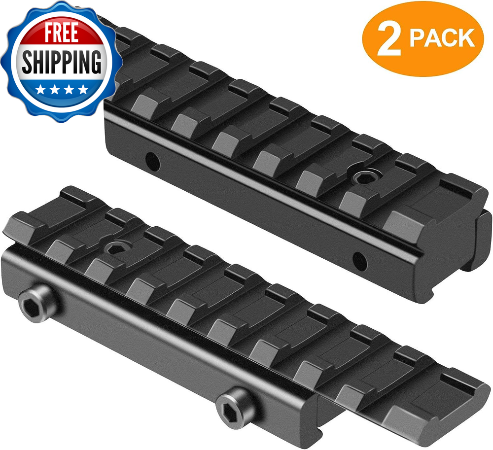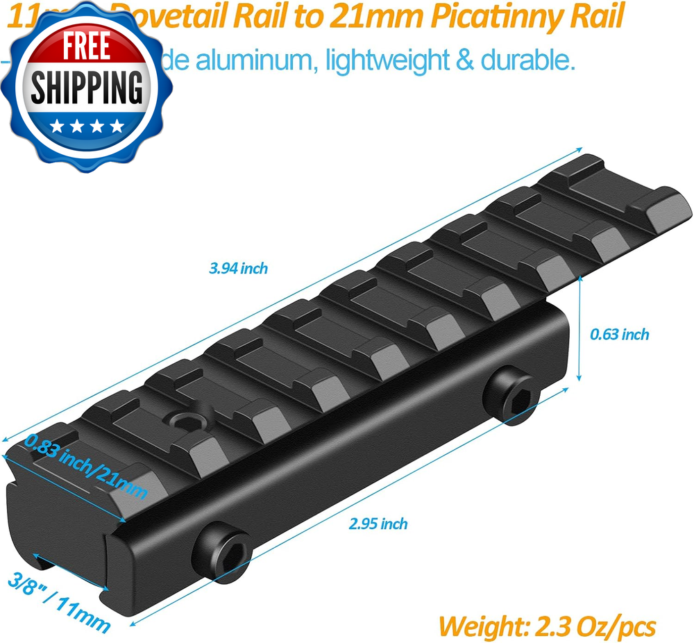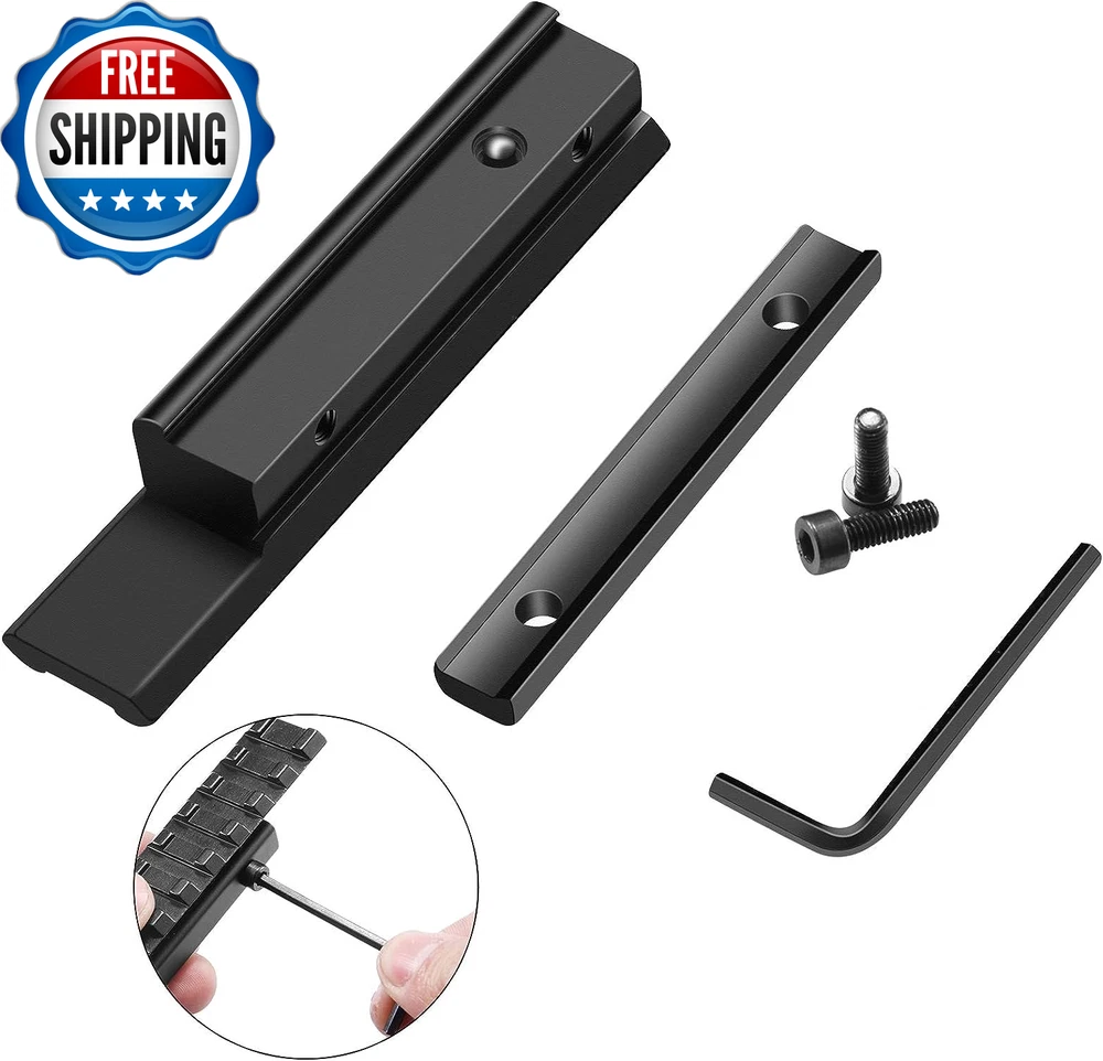 Dovetail to Picatinny Rail Adapter 11Mm Dovetail to 21Mm Picatinny/Weaver Rail Convert Mount - Low Profile Scope Riser Rail Adaptor - Base Mount 3/8" to 7/8" Converter 100% Matte Imported Precision Material: Premium out of aircraft grade aluminum alloy and black hard coat anodize finish, sturdy & durable. Convert 11 mm Dovetail to 21 mm Picatinny Rail: 2.94 inches length at the base, the picatinny rail extends 3.94 inches allowing for more flexible optics placement. Mount Base: Fit 11 mm dovetail mounts, Base mount 3/8" to 7/8" converter adapter. Low profile 0.59" riser rail for scope. Top With 9 Slots Weaver Style Rail: Top 21mm picatinny rail allows for the mounting of picatinny or weaver standard scopes, red dots or other accessories. Easy To Install: Rail adaptor installs easily via dovetail mount and one vertical stop pin, attached allen wrench can help you to tight stable and no shaking. Lightweight & Durable 。◕‿◕。Precision Machined from aircraft grade aluminum and finished in a matte black hard coat anodize, durable solid structure. 11mm To 21mm Rail Convert Adapter 。◕‿◕。Compatible with 11mm or 3/8" dovetail mounts, can be used to convert to 21mm picatinny rail mount. Low Profile Riser Rail Design 。◕‿◕。 3.94"/100mm length single picatinny rail with 9 Slots with a 0.59" saddle height riser rail. 。◕‿◕。 4.72"/120mm length single picatinny rail with 11 Slots with a 0.59" saddle height riser rail. Easy to Install 。◕‿◕。Three high strength locking screws ensure a solid mount-to-receiver lock up, attached allen wrench can help you to ensure tight enough, keep stable and no shaking. Style 2 PACK - 9 Slots Color Black Material Aluminum Package Weight 0.14 Kilograms Item Package Dimensions L x W x H 5.94 x 3.27 x 0.71 inches Style Name 2 PACK - 9 Slots Shipping Fast shipping is very important for us. Our standard US shipping service is FREE. Your order will be shipped within 2-3 business days upon full payment received. Your order will be delivered within 2-3 business days after the handling time. We only ship to the confirmed PayPal address. We reserve the right to cancel any order for any reason at any time. We are not responsible for undeliverable addresses. Returns and payment We offer a 30 days return policy from checkout winning date. We allow only PayPal as payment method FeedBack Your feedback very important to us, after you get your package and you are satisfied with our service please leave us positive feedback If you have any problem with your order / any questions please before leave any type of feedback Please visit our eBay store to check out other items for sale! Thank you for shopping at our store.