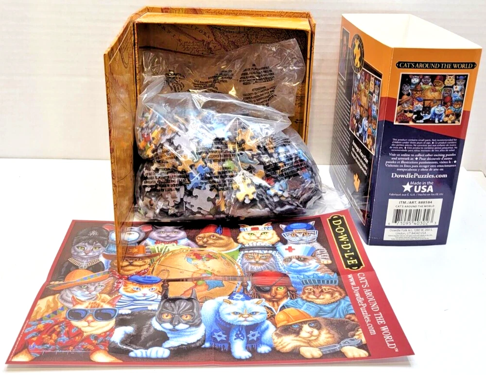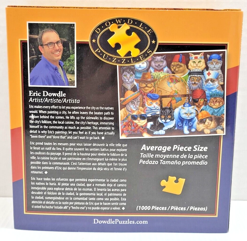 A bit about the puzzle: Puzzle is sealed from the manufacturer Features colorful illustrated cats in different international settings Cats depicted in regional clothing Painted in folk art style by Dowdle Puzzle founder Eric Dowdle 1000 pieces make up 19 1/4" x 26 5/8" finished puzzle High quality thick cut cardboard puzzle pieces with matte finish Combines cats, travel, and culture themes to delight cat lovers Completed puzzles look great framed and displayed Ideal activity for armchair travelers and cat fans of all ages Provides hours of engaging entertainment and puzzling Each item is carefully packaged to prevent any damage and is shipped immediately with tracking. New/Sealed