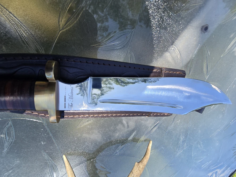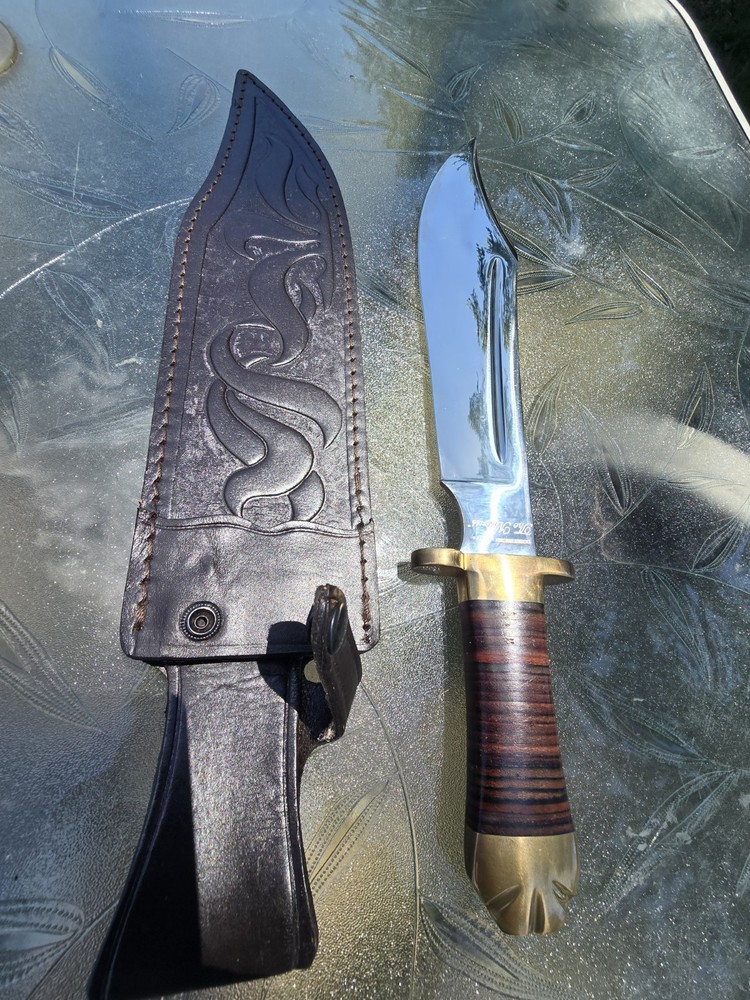 THE MISTRESS, A Very large Bowie made by Down Under Knives. Listed as used because of handling marks but looks unsharpened and I don't believe it has done any cutting or chopping. Cutting edge of blade is 11 1/4 inches, 18 inches overall. Very nice tooled leather sheath. Stacked leather handle. There is slight tarnish on the brass finger guard. Please see photos for condition as part of the description. No international shipping.