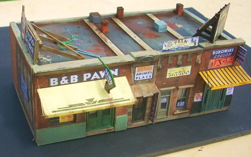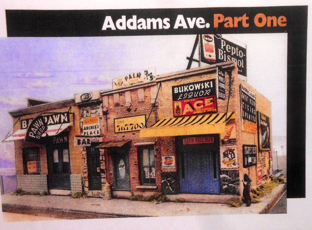 Special this week! Special pricing + will also send a set of our extremely deteriorated concrete sidewalks (a $25 value) at no extra charge! Save $35! The best kits you can buy for 3 reasons!! One. Attention to detail & realism. All of the original pattern work is hand carved by an artisan for maximum realism. This allows Downtown Deco kits to include details you'll never find in other kits. Missing and chipped bricks, "ghost' staircases and walls, crumbling stucco and cracked and weathered concrete. If you can find it in real life you'll see it in a Downtown Deco kit! Two. Ease of construction. We try & keep the kits simple so you can get to the fun part (painting & weathering the buildings) in about 30 minutes. Our instructions are second to none, with complete, easy to understand instructions that walk you through each and every step along the way, from basic assembly to painting & weathering the model. Three. Customer service. Got a question about weathering your model? Give us a call. End up with a broken part somehow? We'll replace the parts for free. Paint your first hydrocal kit & you're unhappy with the way it came out? Drop us an email & we'll send you a second set of castings so that you can try again. Why do we do this? Because we want you to have fun with our kits and to be happy with your finished results. If you need anything at all touch base with us & we'll help you out. Our customer service is second to none. 100% positive feedback! This model kit Addams Ave Part One features hydrocal castings chock full of the funky detail we're known for, full color signs, a laser cut stencil, plastic doors & windows & complete, easy to understand instructions. This kit is bound to generate more comments from your guests than a boxcar full of quaint little depots! Look at the detail in the stucco, stone & brickwork 8" x 5" footprint. Cheers!