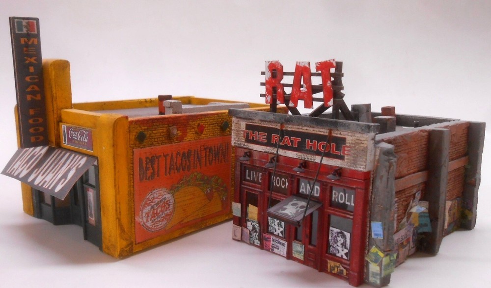 Two Brand New releases from Downtown Deco! They include hydrocal castings featuring amazing detail, full color custom decals, punk flyers, laser cut "RAT" sign, and complete, full color, easy to understand assembly, painting and aging instructions. Special Pricing! The Rat Hole Retails for $45, and Taco Juan's retails at $40.00, so save $10 off the regular price! Factory direct! Note; HO Pilot Models Shown. Randy/Downtown Deco The best kits you can buy for 3 reasons!! One. Attention to detail & realism. All of the original pattern work is hand carved by an artisan for maximum realism. This allows Downtown Deco kits to include details you'll never find in other kits. Missing and chipped bricks, "ghost' staircases and walls, crumbling stucco and cracked and weathered concrete. If you can find it in real life you'll see it in a Downtown Deco kit! Two. Ease of construction. We try & keep the kits simple so you can get to the fun part (painting & weathering the buildings) in about 30 minutes. Our instructions are second to none, with complete, easy to understand instructions that walk you through each and every step along the way, from basic assembly to painting & weathering the model. Three. Customer service. Got a question about weathering your model? Give us a call. End up with a broken part somehow? We'll replace the parts for free. Paint your first hydrocal kit & you're unhappy with the way it came out? Drop us an email & we'll send you a second set of castings so that you can try again. Why do we do this? Because we want you to have fun with our kits and to be happy with your finished results. If you need anything at all touch base with us & we'll help you out. Our customer service is second to none. 100% positive feedback! If you want your layout to stand out & are sick of seeing the same handful of buildings on every N Scale layout you see these kits are the ones for you!! Take a good look at the detail & be honest with yourself, wouldn't these look better on your layout than the run of the mill plastic kits everyone else has?