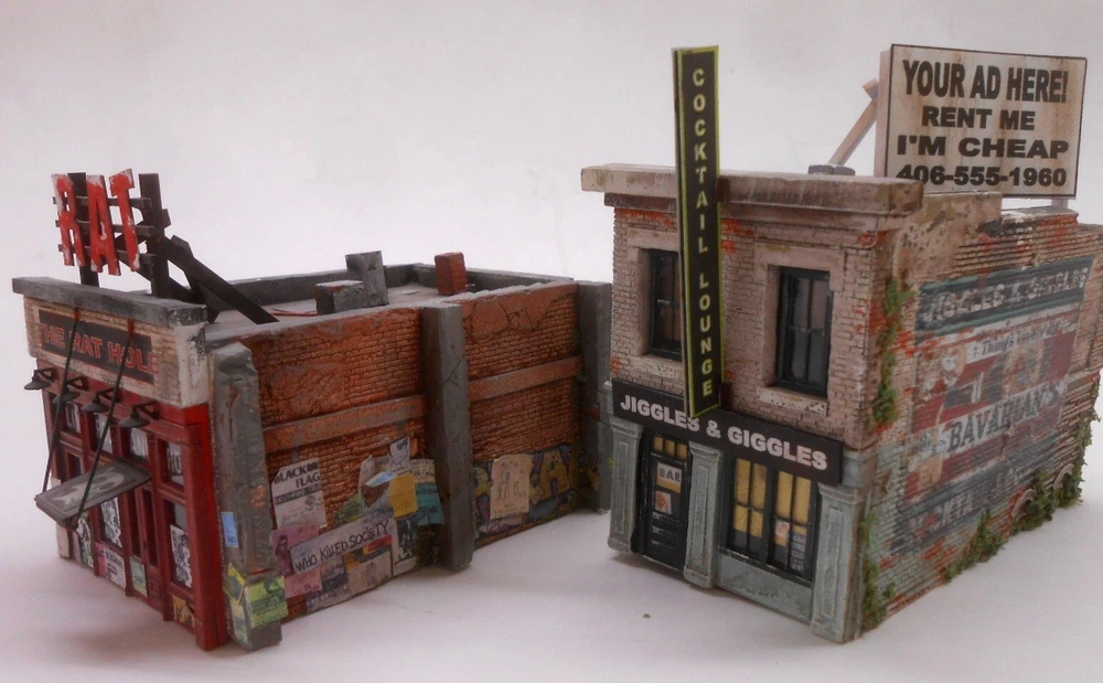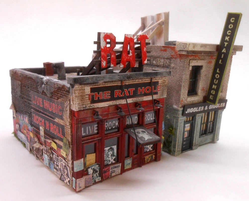 Two Brand New releases from Downtown Deco! They include hydrocal castings featuring amazing detail, full color custom decals, Rat Hole includes punk flyers, laser cut "RAT" sign, and Jiggles has an awesome new set of decals. Both come with complete, full color, easy to understand assembly, painting and aging instructions. Free shipping! Note; HO Pilot Models Shown. Randy/Downtown Deco The best kits you can buy for 3 reasons!! One. Attention to detail & realism. All of the original pattern work is hand carved by an artisan for maximum realism. This allows Downtown Deco kits to include details you'll never find in other kits. Missing and chipped bricks, "ghost' staircases and walls, crumbling stucco and cracked and weathered concrete. If you can find it in real life you'll see it in a Downtown Deco kit! Two. Ease of construction. We try & keep the kits simple so you can get to the fun part (painting & weathering the buildings) in about 30 minutes. Our instructions are second to none, with complete, easy to understand instructions that walk you through each and every step along the way, from basic assembly to painting & weathering the model. Three. Customer service. Got a question about weathering your model? Give us a call. End up with a broken part somehow? We'll replace the parts for free. Paint your first hydrocal kit & you're unhappy with the way it came out? Drop us an email & we'll send you a second set of castings so that you can try again. Why do we do this? Because we want you to have fun with our kits and to be happy with your finished results. If you need anything at all touch base with us & we'll help you out. Our customer service is second to none. 100% positive feedback! If you want your layout to stand out & are sick of seeing the same handful of buildings on every O Scale layout you see these kits are the ones for you!! Take a good look at the detail & be honest with yourself, wouldn't these look better on your layout than the run of the mill plastic kits everyone else has?