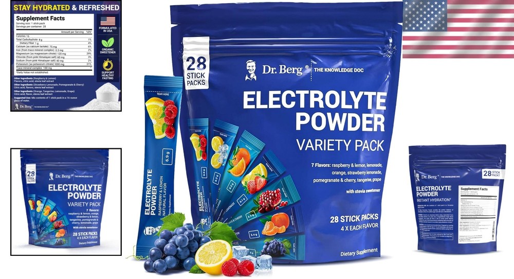 Dr. Berg Sugar-Free Electrolyte Variety Pack: 28 Pouches of Daily Hydration ‹ › ‹ › ‹ › ‹ › ‹ › ‹ › ‹ › ‹ › ‹ › Dr. Berg Sugar-Free Electrolyte Variety Pack 28 Pouches of Daily Hydration Key Features: 1,000mg Potassium: Enriched with potassium from the healthiest foods, this electrolyte mix ensures you meet your daily needs. Superior Salt Quality: Formulated with Pink Himalayan Salt, steering clear of low-quality table salt found in typical electrolyte powders. Easy to Use: Simply mix one travel packet in 16 to 32 ounces of water—customize your sweetness to your preference. Renowned Expertise: Backed by Dr. Berg's extensive knowledge of health, providing top-notch hydration solutions. Quality Assurance: Enjoy a 30-day guarantee. If you're not satisfied, we promise a hassle-free refund. Benefits: Supports daily hydration without the sugars or artificial additives. Provides essential electrolytes to help maintain optimum bodily functions. Created with thoughtful ingredients that you can trust for your health journey. Versatile and perfect for any lifestyle, whether at home, in the office, or during your workouts. Why Choose Dr. Berg's Sugar-Free Electrolyte Pack? This electrolyte variety pack is not just a drink mix; it's a holistic approach to daily hydration. With 1,000mg of potassium sourced from nutritious foods and the finest Pink Himalayan Salt, it guarantees a superior beverage experience without the unnecessary sugars or fillers. Unlike ordinary hydration options, Dr. Berg’s formulations are tailored for those who prioritize quality and health without compromise. Whether you're at the gym, tackling an outdoor adventure, or simply hydrating at home, these convenient pouches are designed for your dynamic lifestyle. Indulge in the hydration you deserve. Experience the difference with Dr. Berg's Sugar-Free Electrolyte Variety Pack today! Shipping Free & Fast Shipping - We offer free shipping to most of the USA with a normal delivery time of 3-7 days. However, due to the current situation, additional delivery time (up to 3 weeks) may be required for some items. Alternative Carriers - We may use alternative carriers (e.g. USPS, FedEx, UPS, etc.) to ensure your package arrives safely and on time. Due to the use of multiple carriers, we are unable to provide a tracking number automatically. Handling Time - Orders are processed and shipped within 1-2 business days of receiving cleared payment. Shipping Restrictions - Shipping to Alaska, Hawaii, Puerto Rico, Guam, and other US territories may incur shipping charges or delivery restrictions. Please contact us before ordering, or your order can be refunded/cancelled. State Restrictions - There may be restrictions based on your state of purchase. For example, certain items may not be shipped to California due to state regulations. Contact for Tracking Updates - If you require tracking updates or have any concerns about the delivery of your order, please feel free to contact us, and we will be happy to assist you. Return 30-Day Hassle-Free Returns - We want you to be completely satisfied with your purchase. If you are not, you can return the item within 30 days of receiving it for a full refund or exchange. Easy Return Process - To start a return, simply contact us and we will provide you with a prepaid return shipping label and detailed instructions. Restocking Fee - There are no restocking fees for returns. However, the buyer is responsible for return shipping costs if the return is not due to a seller's error. Refund Processing Time - Refunds will be processed within 5 business days of receiving the returned item in its condition. Payment We accept all major credit cards, PayPal, and Apple Pay for your convenience. Your payment information is secure and encrypted to ensure a safe and seamless transaction. Please complete your payment within 3 days of purchase to avoid any delays in shipping. Feedback Your feedback is extremely important to us. We strive to provide the best products and customer service possible. If you are satisfied with your purchase, please take a moment to leave us a positive review. If you have any concerns or issues with your order, please contact us before leaving negative feedback. We are committed to resolving any problems and ensuring your satisfaction. Contact Us If you have any questions or concerns, please feel free to out to our customer support team. You can contact us through the eBay messaging system. We are available Monday to Friday, 9:00 am to 5:00 pm EST, and we will do our best to respond to your inquiry within 24 hours. Buy it now and enjoy a pleasant shopping experience! Expiration Date: Sugar Free Electrolyte Powder Unit Quantity: 28 Active Ingredients: Potassium,Pink Himalayan Salt Formulation: Powder Main Purpose: Hydration,Electrolyte Balance Ingredients: Cherry,Pomegranate,Potassium,Raspberry,Pink Himalayan Salt,Lemon,Orange,Tangerine,Lemonade,Grape,Strawberry Lemonade Flavor: Grape,Lemonade,Orange,Tangerine,Electrolyte variety pack,Raspberry & Lemon,Strawberry Lemonade,Pomegranate & Cherry Features: Sugar-Free,No Added Sugars,No Fillers,No Harmful Chemicals Type of Diet: Keto Department: Unisex,Adults When to Take: Anytime,Before/After Workout Type: Drink Mix Supply: 1 and Longer Number of Pills: 1 Volume: 6.2 ounce Item Weight: 8 ounces Unit Type: oz