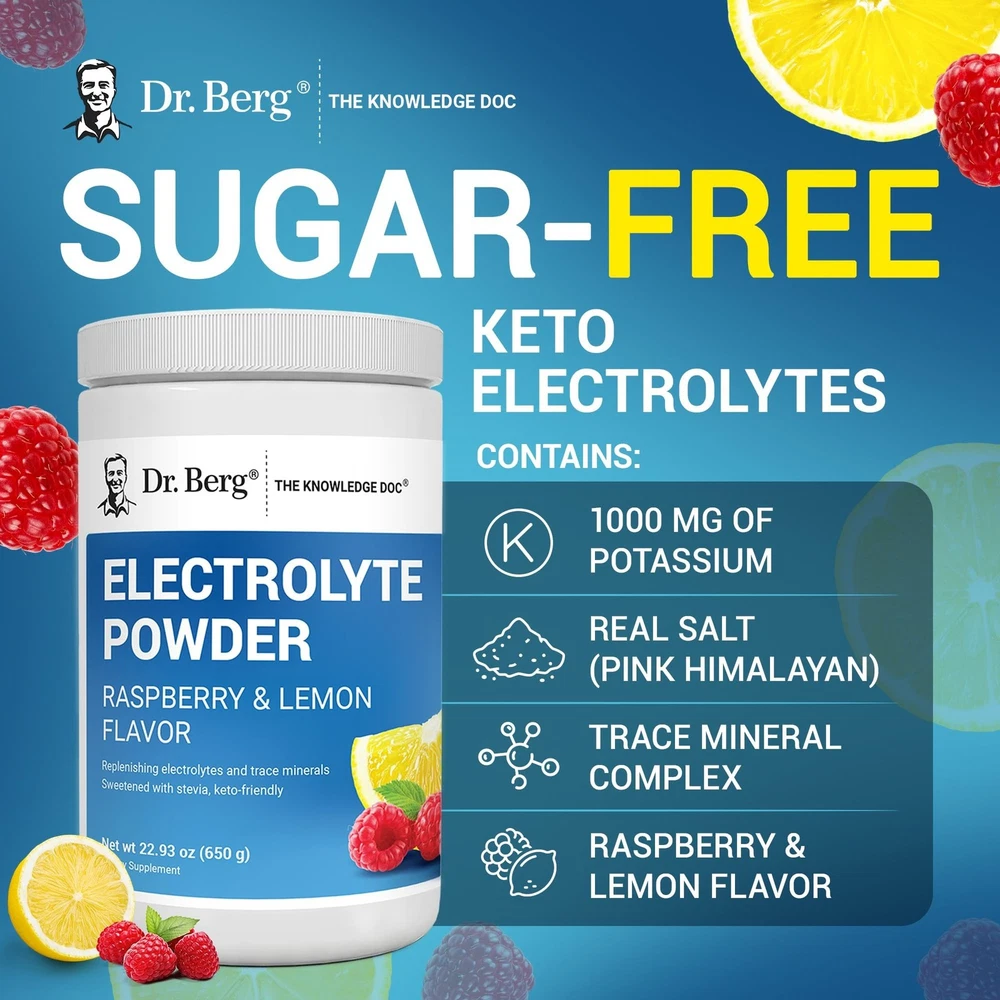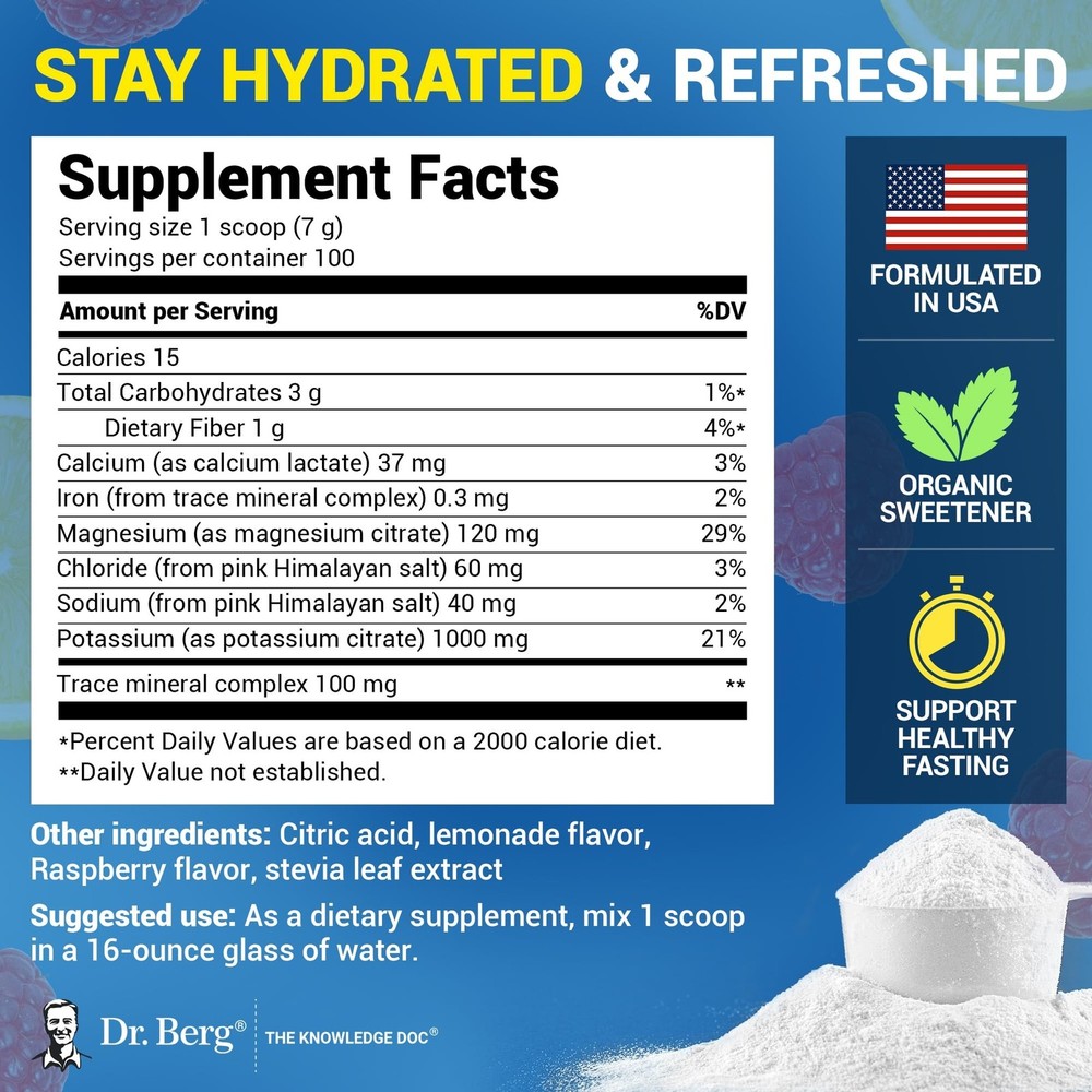 Dr. Berg Zero Sugar Hydration Keto Electrolyte Powder - Enhanced w/ 1000 mg of Potassium & Real Pink Himalayan Salt (NOT Table Salt) - Raspberry & Lemon Flavor Hydration Drink Supplement, 100 Servings Product Details Flavor Name: Raspberry & Lemon - 100 Servings Brand: Dr. Berg Nutritionals MPN: EP-RL-REG25 UPC: 672975261184 EAN: 0672975261184 Brand: Dr. Berg Nutritionals Flavor: Raspberry & Lemon - 100 Servings Primary Supplement Type: Potassium Unit Count: 23.28 Ounce Item Form: Powder Item Weight: 1.5 Pounds Diet Type: Keto Product Benefits: Support Muscle Health, Energy Management Age Range (Description): Adult Package Information: Canister Package Dimensions : 5.79 x 3.74 x 3.58 inches; 1.52 Pounds Item model number : EP-RL-REG25 Date First Available : September 9, 2020 Manufacturer : The Health & Wellness Inc. Best Sellers Rank: #744 in Health & Household (See Top 100 in Health & Household) #2 in Sports Nutrition Endurance & Energy Powders #2 in Sports Nutrition Endurance & Energy Powders Customer Reviews: 4.3 4.3 out of 5 stars 26,412 ratings ELECTROLYTES POWDER NO SUGAR - Each serving is loaded with 1,000 mg of potassium as opposed to only 250 mg other brands offer. Additionally, this electrolytes powder offers a very unique blend of Calcium, Magnesium, Chloride (from Pink Himalayan Salt - NOT table salt other brands offer) and an amazing Trace Mineral Complex. This refreshing and delicious Raspberry and Lemon flavor includes 100 servings. MIXING INSTRUCTIONS - Add one scoop to 16 oz of water. Shake or stir well. Allow 510 minutes for full dissolution, as no dissolving agents are used. INCREDIBLE INGREDIENTS - We're sorry to say it, but if youre looking for cheap, youre in the wrong place. We search far and wide, domestic and international, to provide high-quality ingredients for which your body will thank you. Unfortunately, getting the best ingredients from domestic and international farms can come at a higher-than-normal cost. If quality, satisfaction, and results are essential to you, youre in the right place! WHY WERE DIFFERENT - Also known as The Knowledge Doc, Dr. Berg has spent most of his life researching and providing natural solutions to everyday health problems. This extensive research and thousands of hours working with patients are what sets us apart from other brands, as it has allowed us to create proprietary blends you cant get anywhere else. 30-DAY Guarantee - If for any reason you're not happy with the results you experience within the first 30 days, we're happy to give you a full refund! Send us a message, and the refund will be processed as long as it's requested within 30 days of purchase.