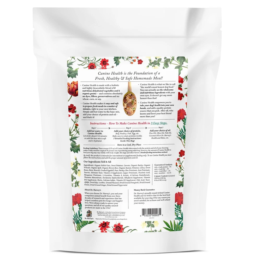 Dr. Harvey's Canine Health Miracle Dog Food, Human Grade 10 Pound (Pack of 1) Description Features: Nutrition You Can See and Smell! Canine Health is a base mix used to effortlessly create balanced, homemade meals for your dog as a whole food alternative to kibble. Feeding your dog a whole food, nutrient dense diet has been shown to improve digestion, increase energy, help improve itchy skin, and produce firmer, less smelly stools. (You'll thank us later!) Canine Health is 100% Human Grade. This base mix is packed with real whole foods, including 9 dehydrated vegetables, crushed eggshells for calcium, and 6 organic grains. There are zero fillers, preservatives, dyes, or synthetic ingredients. Ready in minutes. Simply rehydrate the base mix with hot water, let sit for 8 minutes, and add the protein of your choice and a healthy oil of your choice for healthy fats. (Try our fish oil!) Why choose a base mix? Pet parents who feed their dogs a base mix like Canine Health love that they have control over the type, quality, and quantity of meat that their dog eats. If you'd like an option with meat included, try our line of Complete Foods! Product Details: Handling We will ship all orders within 1 business day of payment. Delivery We Do Not Ship Outside of the Continental US. Return Policy All items qualify for returns within 30 days of receipt. Buyer is responsible for return shipping on any item that is not damaged. Feedback We take our reputation seriously, we buy and sell online, so we understand the value of trust. If you are unsatisfied with your order, please contact us and we will work with you to resolve it to your satisfaction.