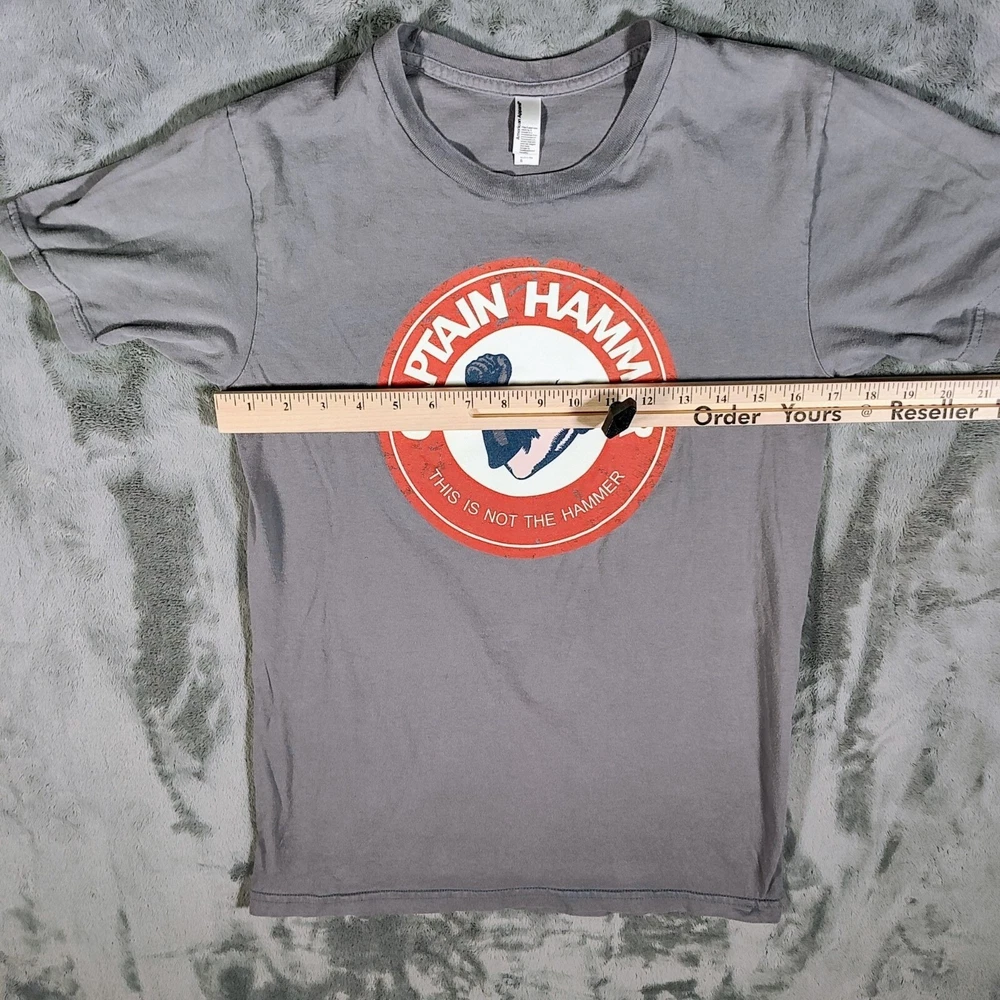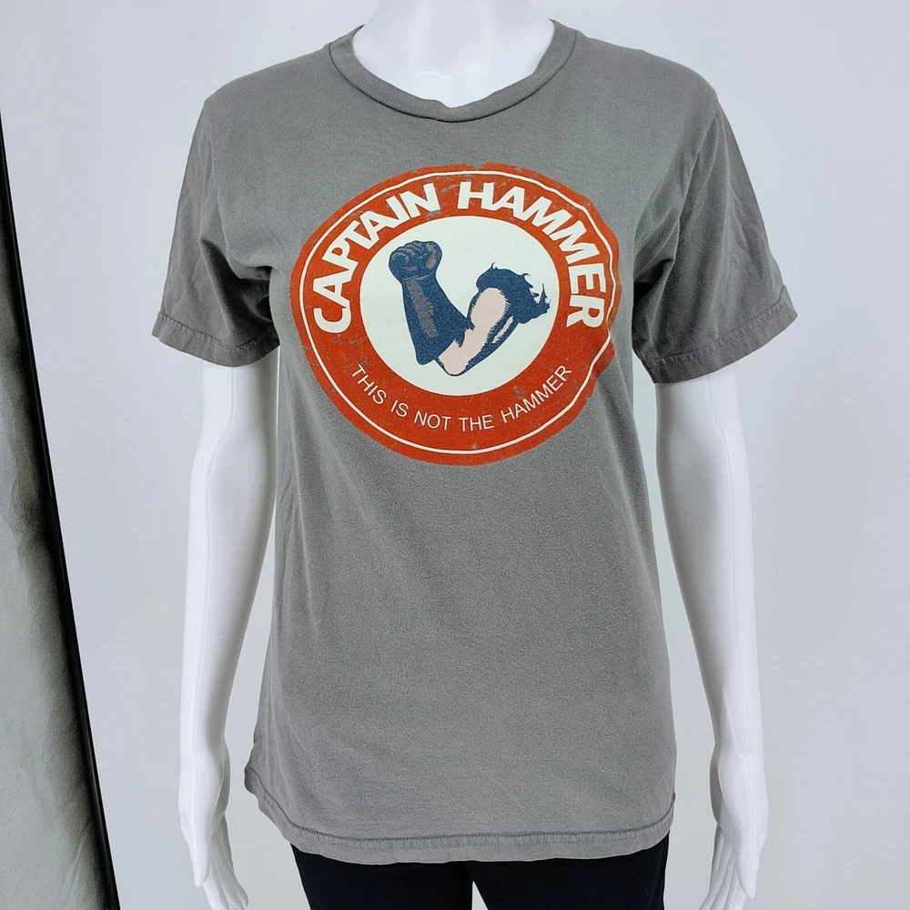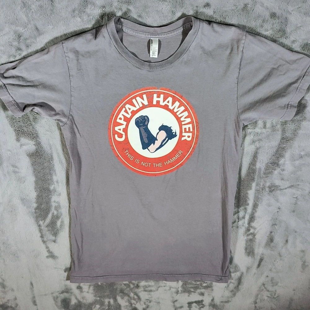 Condition Notes: Good overall condition. Moderate wear and slight fading. See photos. Product Notes: • Made in USA by American Apparel • Purchased new in 2008 • Short sleeve crewneck • Distressed Captain Hammer "Arm & Hammer" Parody graphic • 100% Combed Cotton Measurements: Pit to Pit: 16.875 Chest: 33.5 inches Hem to Collar: 24.75 front hem, 24.875 back hem Please check photos and measurements carefully.