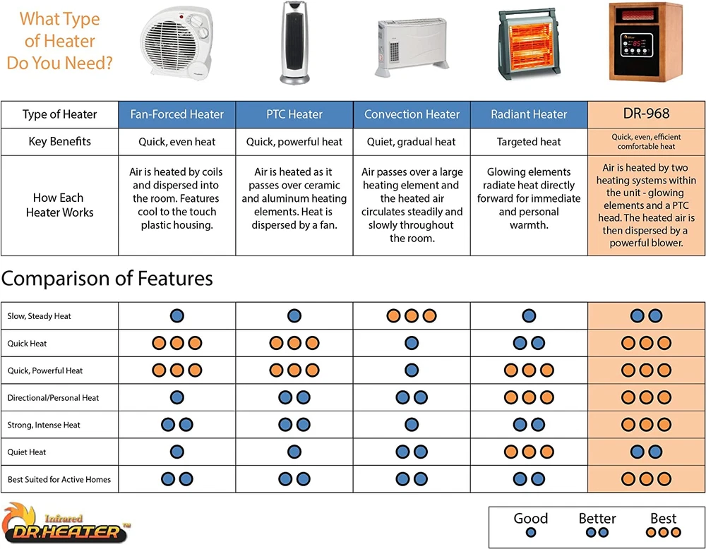 Store New Arrivals Add to Favorite View Feedback Contact Dr Infrared Heater Portable Space Heater, Original, 1500-Watt, Cherry (Pack of 1) Description Power Source Corded Electric Max Temperature Setting 85 Degrees Fahrenheit Fuel Type Electric Room Type Bedroom, Home Office, Study Room, Nursery, Dining Room Model Number DR-968 Heating Coverage 576 square feet Heating Element Radiant Additional Features Portable,Tip-Over Protection,Overheat Protection,Remote Control,Electronic Thermostat,Wheels,Remote Control,On Off Timer,Noiseless,Energy Efficient Form Factor Cabinet Heat Output 5200 Indoor/Outdoor Usage Indoor Number of Speeds 3 Item Weight 19 Pounds Special Feature function(f) {var _np=(window.P._namespace("DetailPageProductOverviewTemplatesJava"));if(_np.guardFatal){_np.guardFatal(f)(_np);}else{f(_np);}}(function(P) { P.when('A').execute(function(A){ A.on('a:truncate:po-attribute-truncate-1:updated', function(data) { var isTruncated = !data.truncateInstance.getIfTextFits(); var seeMoreElement = document.getElementById('po-attribute-see-more-id-1'); if(seeMoreElement) { seeMoreElement.style.display = isTruncated ? '' : 'none'; } }) }); })); Portable,Tip-Over Protection,Overheat Protection,Remote Control,Electronic Thermostat,Wheels,Remote Control,On Off Timer,Noiseless,Energy Efficient See more Amperage 12.5 Amps Mounting Type Freestanding Color Cherry Item Dimensions D x W x H 13"D x 12.5"W x 17"H Indoor Outdoor Usage Indoor Power Source Corded Electric Heating Method Radiant, Forced Air Global Trade Identification Number 00837654715666 Item Weight 19 Pounds Heat Output 5200 Heating Method Radiant, Forced Air Voltage 120 Recommended Uses For Product Office, Home Cable Length 72 Inches Min Temperature Setting 50 Degrees Fahrenheit Can heat up a large room with Auto Energy Saving Model With High and Low Feature. Tip-over protection and Overheat protection.Heat Up for a large room - Dual Heating System: Infrared Quartz tube + PTC for 60% more heat than others. Rated around 5200 BTU. Dual Heating Systems featuring infrared quartz tube + PTC with 12-Hour automatic shut-off timer. Amperage: 12.5 Amps IR Remote Control, High Pressure Low Noise Blower with Noise level 39 dB super quiet. Heating can cover for a large room. Electronic Thermostat: range 50 to 85 degrees. Caster Wheels and Filter Weights 24 lbs and uses 12.5 Amps of Power. 1500 Watts. Power Cord is 72-inch-long (6 Feet) The Dr. Infrared Heater's Advanced Dual Heating System, combining PTC and Quartz Infrared Element, keeps you warm this winter while saving on heating bills. Equipped with a Dual Heating System and High Velocity Low Noise blower, the Dr. Infrared Heater increases the heat distribution and the result is heating your room to a comfortable temperature, fast. The Dr. Infrared Heater is certified by Underwriters Laboratories (UL) USA and Canada, ensuring the highest safety standard. The Dr. Infrared Heater is perfectly safe around children and pets and only gets warm to the touch. It does not have exposed heating elements that can cause a fire. The Dr. Infrared Heater comes with Energy saving Auto Mode, high and low setting when the mode is set to Auto, the unit will cycle on and off and switch between high or low setting to maintain the desired temperature setting. All Dr. Infrared heaters are engineered and designed in the USA. How is Dr. Heater Different from Other Heaters? Dr. Heater uses infrared heating, which heats objects in the room, instantly making you feel comfortably warm. By heating only the objects in the space--not the air--Dr. Heater provides maximum warmth and energy efficiency. With its state-of-the-art technology that helps the room retain air moisture, Dr. Heater do not dry out your skin like those convection heaters that blast out hot air, stripping the room of moisture. And the best part? It will save you money. Use Dr. Heater instead of your regular heating system, and you could save up to 50% on your next electricity bill. Plus, with its tip-over protection and auto shut-off overheat protection, you can sleep soundly knowing you have got a heater that is superior in safety. Tests Show Dr. Heater heats Faster and Better than Competing Heaters. In a side-by-side test comparison in airtight chambers with the same starting temperature, Dr. Heater heated the same amount of space much faster than a competing heater that has a price tag more than double that of Dr. Heater. Dr. Heater Delivers 60% more heat than other 1500-watt heaters. No magic trick--we just understand heat transfer better. Just because two heaters have the same wattage does not mean they transfer the same amount of heat. Wattage indicates the amount of electricity needed to power the heater--not the amount of heat it can deliver. Heater is the first to feature a dual heating system for maximum heat transfer rate. It combines the energy efficiency of infrared heat with the comfort of convection heat to heat your room fast and comfortably--without hot spots and cold spots. Dr. Heater uses a state-of-the-art 7-inch blower that generates higher pressure and moves larger air volume at a lower speed, without any of the noise of those other heaters on the market. Dr. Infrared Heater has three power Settings: Auto, Low 1000W and High 1500W. The auto energy saving mode allows you to set your desired temperature from 50-86F. It smartly selects between the two settings depending on your room temperature. The thermostat regulates the heater and causes it to cycle on and off to maintain the set temperature. You can also manually set the heater to run on High or Low all the time or with a timer. The heater has to be turned on first in order to use the remote. This a safety provision mandated by the Underwriters Laboratory. So, in order to use the remote, the first step for the user is to press the POWER button on the heater itself. This turns the heater on STANDBY. Then, pressing the POWER button on the remote will turn the heater on. The heater 
